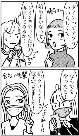 サイゾーウーマンカルチャーマンガ婚活アプリ、オミアイを退会 カルチャー まんが『オバサンと言われても結婚したい!』120話 【アラフォー婚活ルポ】婚活アプリ、オミアイは退会してダインとクロスミーをスタート! 2022/04/06 13:30 白戸ミフル(マンガ家) オバサンと言われても結婚したい! ――合コン歴20年以上、累計回数2,500回以上、30代なかばに乳がんで闘病するも、現在は絶賛婚活中のライター・漫画家の白戸ミフルが「アラフォー婚活」の実体験をほぼリアルタイムでお届けします! アラフォー中の結婚は成就するのか……!? 【前回まで】 43歳、婚活中。結婚相談所に入ったり、アプリで出会った男性とデートや合コンに励んでいる。しかし、この間の合コンで連絡先を交換した年下男性からLINEがあり、「彼女ができたから会うことは難しいです」とのメッセージが。そう、いまはクリスマスを目前に控えた11月中旬。急がなければ……! 120話『婚活アプリ、オミアイは退会してダインとクロスミーをスタート!』 次のページ オミアイは退会 123次のページ 関連記事 【アラフォー婚活ルポ】初デート、「はじめまして」の顔にド衝撃!!!【アラフォー婚活ルポ】合コンで“強烈ロックオン”! 婚活仲間のすげ~アプローチに呆然……【アラフォー婚活ルポ】告られるどころか、あっさりバイバイ!? 友達認定ってこと?【アラフォー婚活ルポ】運命の3回目のデート! 告られたりして!?【アラフォー婚活ルポ】もう43歳、時間がない! 惜しまず動かないと! その他の作品を読む