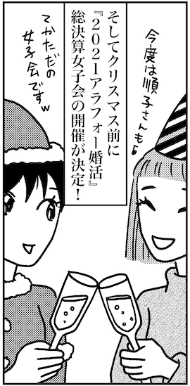 サイゾーウーマンカルチャーマンガアラフォー3人、2021年の婚活を振り返る カルチャー まんが『オバサンと言われても結婚したい!』122話 【アラフォー婚活ルポ】結婚相談所の紹介は○○……アラフォー3人、2021年の婚活を振り返る! 2022/04/13 13:30 白戸ミフル(マンガ家) オバサンと言われても結婚したい! ――合コン歴20年以上、累計回数2,500回以上、30代なかばに乳がんで闘病するも、現在は絶賛婚活中のライター・漫画家の白戸ミフルが「アラフォー婚活」の実体験をほぼリアルタイムでお届けします! アラフォー中の結婚は成就するのか……!? 【前回まで】 43歳、婚活中。結婚相談所に入ったり、アプリで出会った男性とデートや合コンに励んでいる。近頃は相席居酒屋でLINEを交換したりさらに積極的に動いてるけど、結果は伴わず。そんな中、2021年も終わりに近づいてきた。年末はアラフォー婚活仲間と反省会だ! 122話『結婚相談所の紹介は……アラフォー3人、2021年の婚活を振り返る!』 次のページ 2021年の婚活を振り返る 123次のページ 関連記事 【アラフォー婚活ルポ】結婚相談所も再スタートしたけど、婚活してる暇がないよ【アラフォー婚活ルポ】やっぱり30代男性はいいね! 銀座の相席居酒屋で実感【アラフォー婚活ルポ】告られるどころか、あっさりバイバイ!? 友達認定ってこと?【アラフォー婚活ルポ】運命の3回目のデート! 告られたりして!?【アラフォー婚活ルポ】もう43歳、時間がない! 惜しまず動かないと! その他の作品を読む