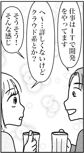 サイゾーウーマンカルチャーマンガDineとクロスミーをやってみた カルチャー まんが『オバサンと言われても結婚したい!』137話 【アラフォー婚活ルポ】決戦のクリスマスイブ、マッチングアプリの男性と初デート 2022/06/08 13:30 白戸ミフル(マンガ家) オバサンと言われても結婚したい! 話しやすいし楽しいな ――続きは6月12日公開! ――バックナンバーはこちら 前のページ123 白戸ミフル(マンガ家) 神奈川県出身。漫画家・ライター。タレント活動の後、マスコミ系の職業を渡り歩き、現在は化粧品メーカーに勤務。合コン歴20年以上、累計回数2500回以上。女性向けwebメディアほか、男性向けメディア、旅系メディア等でライターとして幅広く執筆。著書『合コン・アンド・ザ・シティ 恋活・婚活女子の合コンマニュアル』(ごきげんビジネス出版)、 『乳がんステージ4だった私が、それでも合コンに行きまくって救われた話』(キノブックス) 記事一覧 X:@takara0722 Instagram:@tamifull0722 【アラフォー闘病&婚活記】 最終更新:2022/06/08 13:31 離婚歴アリがどう転ぶ? 関連記事 【アラフォー婚活まとめ読み】婚活オンナ3人がぶっちゃける!! これって、理想が高くてぜい沢?【アラフォー婚活まとめ読み】婚活オンナ3人がぶっちゃけ総決算!! デート・交際、涙の失敗談【アラフォー婚活ルポ】クリスマス目前、マッチングアプリのDineとクロスミーをやってみた【アラフォー婚活ルポ】結婚相談所も再スタートしたけど、婚活してる暇がないよ【アラフォー婚活ルポ】アプリで結婚相手探し、痛恨の初歩的ミス! その他の作品を読む 次の記事 NEWS・小山のメールは「おじさん構文」 >