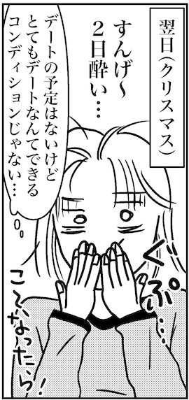2021年、クリスマスイブ。マッチングアプリのクロスミーで出会った男性との初デート! 彼は肌がきれいで話しやすいし、一緒にいて楽しい。元妻の不倫が原因で離婚歴があるというけど、ノリも合って楽しい時間を過ごせた。しかし、翌日、ひどい二日酔いに……。