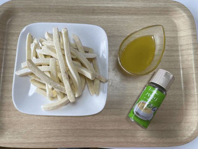 実際に作ってみましょう! ガーリックバターソースは、チューブニンニク、オリーブオイル、バターを使って即席で作りました。ガリバタソースが近所に売ってない場合は、ネットで検索すると作り方がたくさん出てきますので、参考にしてみてください! 冷凍のポテト、仕上げのパセリを揃えて準備完了です。