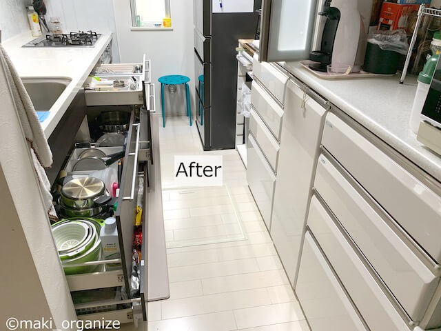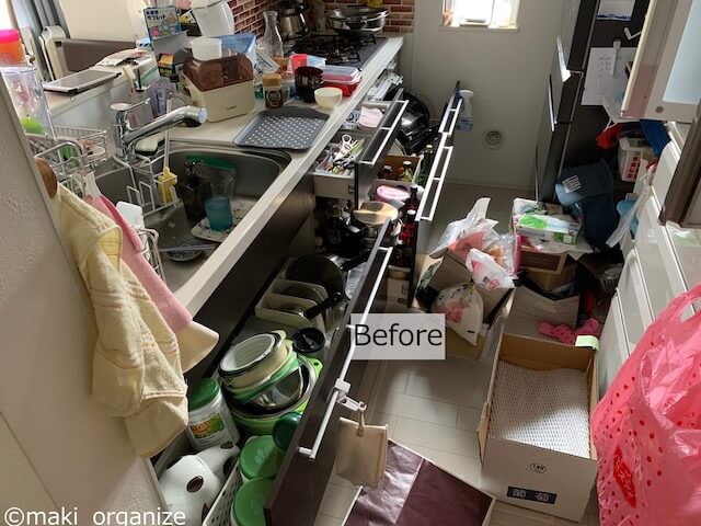 サイゾーウーマン暮らし住まい汚キッチン、ビフォーアフター8例 暮らし [連載]30代女子の「煩悩部屋」ビフォーアフター 【キッチン収納】100均アイデア集! 引き出し、シンク下……プロの片付け劇的ビフォーアフター6連発 2022/08/29 19:30 伊藤まき(収納ライター) 「汚部屋」ビフォーアフター キッチン収納 引き出しのお悩み: 引っ越しで狭くなり、モノが入らない 叶井俊太郎さん(都内23区内) 家族構成:3人家族 間取り:一軒家 Before [新居]引っ越してすぐのキッチン(C)maki_organize 新居に引っ越したことで「手狭になったキッチン」。半分以上のモノを処分してきたのに、すでに「散らかりやすい」とお悩みでした。 引っ越し直後、まだ片付けない状態(C)maki_organize 「半分以上のモノを処分してきたのに、キッチンが狭すぎて入りきらない!」 と叶井さん。確かに、「厳選されたモノ」しか残っておらず量的にはミニマリストレベルでした。 シンクやコンロ周りが散らかりやすくなる理由は「モノの住所が決まっていない」と「引き出しの出し入れが不便」なだけ。これを見直せば、簡単です。 After 水切りラックの出番も減ります(C)maki_organize シンク周りにあるモノすべてを引き出しに収納したら、こんなにスッキリ! 引き出しの収納を見直したら劇的にスッキリと片付きました。 旧家では、食器洗浄機が付いてなかったので、これまでの習慣から水切りラックを用意したそうですが、これからは、プラスチック容器以外のすべてを食洗機で洗うことができます。 ▼片付けの全工程や使用アイテムはこちら 劇的ビフォー・アフターで解説! 狭くなったキッチンを「100円収納で快適化」するポイント集整理収納アドバイザー1級で収納ライターの伊藤まきが、家の中の “片付かない”ちょっとした悩みを“簡単で安く”解決するコツを提案します! 今回は番外編のお届けです。 今日の...サイゾーウーマン2021.03.01 キッチン収納 引き出しのお悩み: 新しい生活と育児でモノがあふれる Kさん(板橋区在住) 家族構成:4人暮らし 間取り:3SLDK、一軒家 Before (C)maki_organize 新しい生活と育児で、「食材のストック」が急に増えたとKさん。急に増えた道具と食材に囲まれ、しんどい状態でした。 After (C)maki_organize キッチンの収納すべてを見直したことで、コンロ上に置きっぱなしだった鍋類もすべて収納できました。片付かないと思ったら、引き出しの中から「見直し収納」をするのが一番です。 動画で見たい方は、コチラをチェック! この投稿をInstagramで見る 整理収納アドバイザー|伊藤まき|東京区内(@maki_organize)がシェアした投稿 ▼片付けの全工程や使用アイテムはこちら キッチン「コンロ下&シンク下」収納、ビフォーアフター8連発! 100均アイテムだけでプロがスッキリ手直し連載企画「30代女子の「煩悩部屋」ビフォー・アフター」の新シーズンが始まりました。今回は、汚部屋あらため「汚家(おうち)」をまるごと片付けます! クライアントは板橋区・3S...サイゾーウーマン2021.11.22 ▼そのほか、キッチン収納アイデアはこちらも! キッチン「コンロ下&シンク下」収納、ビフォーアフター8連発! 100均アイテムだけでプロがスッキリ手直し連載企画「30代女子の「煩悩部屋」ビフォー・アフター」の新シーズンが始まりました。今回は、汚部屋あらため「汚家(おうち)」をまるごと片付けます! クライアントは板橋区・3S...サイゾーウーマン2021.11.22 ※2022年2月初出の記事に加筆、編集をしています。 前のページ123 伊藤まき(収納ライター) 収納ライター・兼・整理収納アドバイザー1級。クリンネスト2級。おがくず工場に生まれ、ホテル清掃員、国鉄系レストランの厨房、内装会社、デパートの搬入搬出など“家事の土台”を極めた生活を経て、出版社入社ののち独立、現在に至る。モノを手放すほど「幸運」が舞い込むジンクスを何度も体感! 貧乏神と決別した実体験をもって、整理収納の威力をお伝えします。 記事一覧 Instagram:@maki_organize 最終更新:2022/09/05 19:39 汚キッチン画像ってワクワクするよね! 関連記事 収納グッズを変えたら「洗面台」が激変! 「100均」アイテム15点でプロが手直しビフォーアフターキッチンの片付け12連発! モノで溢れた食器棚、トースターラックまでプロの手直しビフォーアフター汚部屋の衝撃ビフォーアフター25連発! 大量の荷物の山、モノで埋もれた部屋が劇的スッキリキッチン「コンロ下&シンク下」収納、ビフォーアフター8連発! 100均アイテムだけでプロがスッキリ手直しシンク・コンロまわりの「片付けしんどい」問題を解決! 散らかったゴチャゴチャがスッキリ、ビフォーアフター実例 次の記事 『24時間テレビ』でセクゾ・菊池の“裏被り” >