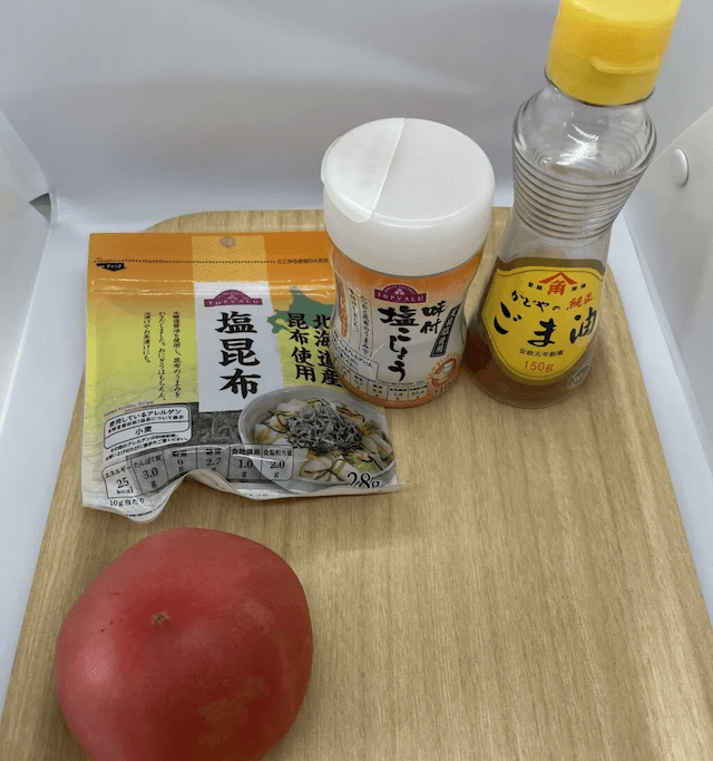 実際に作ってみましょう。トマト、塩昆布、塩胡椒、ごま油を用意して準備完了です!