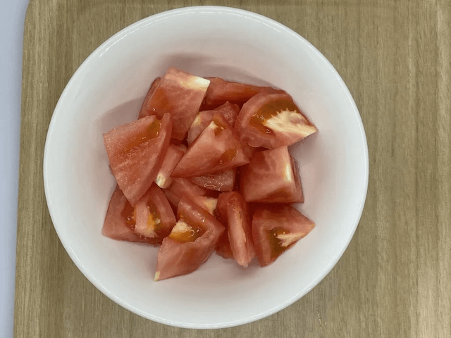 (1)トマト(1個)を角切りする