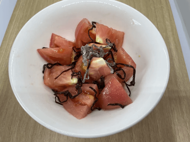 塩胡椒に塩昆布の塩分過多具合が非常に気になっていたのですが、食べてみたらそこまで気にならない。なぜならトマトがジューシーだから塩味が中和されているように感じました。