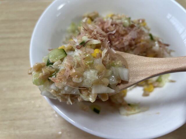 サイゾーウーマン暮らし食べ物【納豆コールスロー】相性良くてハマる! 暮らし 【あのツイッターレシピ、やってみました】 『家事ヤロウ!!!』【納豆コールスロー】、納豆を追加するほどハマった! 油断厳禁の喉越しはまるで飲み物 2022/09/07 19:00 アウちゃん(ライター) ツイッターレシピ、やってみました 【納豆コールスロー】納豆を追加してしまうほどハマってた! ひきわり納豆がほんのり見える(C)サイゾーウーマン 今回はセブンイレブンのコールスローを使ってないので、『家事ヤロウ!!!』の味を完全には再現できないのですが、ひきわり納豆とコールスローの相性を確認してみたいと思います。 ネバネバからサラサラ食感に変化!(C)サイゾーウーマン ちょっとコールスローから出てきた水分と、ひきわり納豆のネバネバ絡まった状態が画像で見て取れるでしょうか? 味付けはひきわり納豆についていたカラシとタレのみ。普段は普通の納豆しか食べませんが、今回のひきわり納豆には期待大です! 食べてみました。 一口食べてみたところ、油断するとそのまま喉を通って胃袋に到達しそうな喉越しで、まるで飲み物のようです。ひきわり納豆のネバネバ感がコールスローから出た水分によって、サラサラ食感に変化していました。口の中に入れたら最後、全意識を口の中に集中してよく噛まないと、あっという間に飲み込んでしまいます。 味については、セブンのコールスローだったらもう少し甘酸っぱさが出たのかもしれませんが、即席の手作りコールスローも悪くはない。コーンの甘みと納豆独特の甘みがクセになります。 ひきわり納豆とコールスローの相性の良さが意外だったので、冷蔵庫に残っているひきわり納豆を追加してしまうほどハマってしまった一品でした。このレシピにチャレンジする際にコールスローは手作りで作る! という方は、甘みを加速させてくれるコーンは必須なので、その点はご注意ください。 【総評】 もう一度作りたい度:★★★★★(次回はセブンのコールスローでチャレンジ!) ズボラ主婦でも再現可能度:★★★★★(説明するまでもない簡単さ) 子どもウケまたは夫ウケ:★★★☆☆(ぬるっとした食感が苦手なのか子どもには、これだめ! をいただきました) 『家事ヤロウ!!!』和田明日香さん【納豆かき揚げ】、これはリピートあり!! 香ばしさが増し増しのおなかいっぱい食べたいレシピ!料理がまったくできない主婦の私。料理は夫担当になっていますが、子どもが大きくなるにつれ、私も作らなアカンときに見舞われるように。まずはSNSで人気の簡単レシピから料理にチャ...サイゾーウーマン2022.03.23非公開: つくりおき食堂まりえさん【ケンタッキーのコールスロー再現レシピ】、子どもの胃袋を掴む我が家の大人気メニューに決定!料理がまったくできない主婦の私。もう4年ほど夫が料理を担当していますが、子どもの成長とともに「いやでも作らなあかん時」に見舞われるように……。そこで「かんたん」「ラクチン」...サイゾーウーマン2020.02.23 前のページ12 アウちゃん(ライター) 現在4歳と1歳を育児中の家事&料理がまったくできない主婦。好きな食べ物は激辛料理。しかし料理は夫担当。関西出身、福岡在住のライターブロガー。家事に関しては【見なかった事にしよう】が合言葉。 最終更新:2022/09/07 19:00 まったく想像がつかない! 関連記事 『家事ヤロウ!!!』【金のハンバーグボロネーゼ】、うますぎる秘密の時短レシピだった! 簡単すぎて申し訳ないレベル3日連続食べても飽きない! 料理研究家・ジョーさん【かきたまそうめん】作ったら、食欲増進レシピだったコウケンテツさん【レタスのコールスロー風サラダ】、まじで最強の味……! ドレッシングを最後の1滴まで飲み干した!!つくりおき食堂まりえさん【ケンタッキーのコールスロー再現レシピ】、子どもの胃袋を掴む我が家の大人気メニューに決定!『家事ヤロウ!!!』和田明日香さん【納豆かき揚げ】、これはリピートあり!! 香ばしさが増し増しのおなかいっぱい食べたいレシピ! 次の記事 橋本環奈『バイオレンスアクション』初登場9位 >