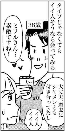 サイゾーウーマンカルチャーマンガ見た目のタイプは重要だと失敗から学んだ カルチャー まんが『オバサンと言われても結婚したい!』166話 【アラフォー婚活ルポ】見た目のタイプは重要だと、失敗から学んだ 2022/09/14 13:30 白戸ミフル(マンガ家) オバサンと言われても結婚したい! ――合コン歴20年以上、累計回数2,500回以上、30代なかばに乳がんで闘病するも、現在は絶賛婚活中のライター・漫画家の白戸ミフルが「アラフォー婚活」の実体験をほぼリアルタイムでお届けします! アラフォー中の結婚は成就するのか……!? 【前回まで】 20代男子にセフレにしかけた痛い経験をバネにして「婚活の鬼」になった私。婚活アプリでなんとなく付き合うことになった彼氏とも別れ、2022年内の結婚を目標に設定! アプリ中心に活動をしたところ、自由が丘の持ち家に一人で住む一流メーカー勤務の30代男性とマッチング。顔も条件もイイ! と思ったら、デート後3日も未読スルー……。 166話『見た目のタイプは重要だと、失敗から学んだ』 次のページ まともなイケメンキターーー! 12次のページ 関連記事 【アラフォー婚活ルポ】43歳にして、完全にセフレ認定……【アラフォー婚活ルポ】チクショウ! 危うく20代2人にセフレにされかけた話【アラフォー婚活ルポ】会社の先輩と相席居酒屋へ……29歳の男がまぶしい!【アラフォー婚活ルポ】結婚相談所も再スタートしたけど、婚活してる暇がないよ【アラフォー婚活ルポ】アプリで結婚相手探し、痛恨の初歩的ミス! その他の作品を読む