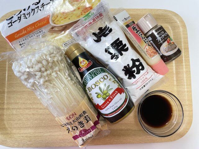 材料を用意しました。コスパも良く冷蔵庫にあるものでささっとできそうなところが嬉しい。溶けるチーズ、エノキ、片栗粉、ニンニクチューブ、黒胡椒(今回はブラックペッパー)、オリーブオイル、醤油で準備完了です!