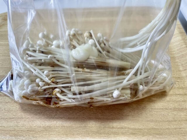 (2)ポリ袋にえのきを入れニンニクチューブ1cm、醤油大さじ1/2を入れシャカシャカ混ぜる。