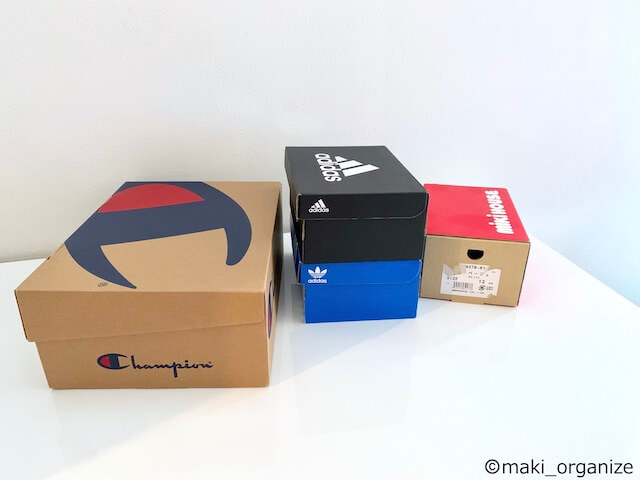 男性用の靴箱は、Tシャツのタテ入れ収納に欠かせないベストサイズ。洋服の整理をする時は、必ず靴箱を出してもらうようにしています。箱物のかさばりが減るメリットもあるので、捨てることなく使います。