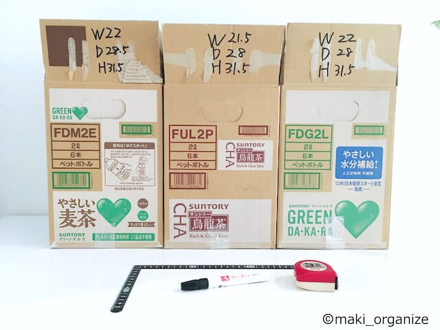 ペットボトルの段ボールのフルサイズと、半分に切ったサイズをリメイクしてみました。写真上のように、カラーボックスにぴったりのサイズだとわかります。高さ調整もしやすいので、収納ボックスとして超優秀!