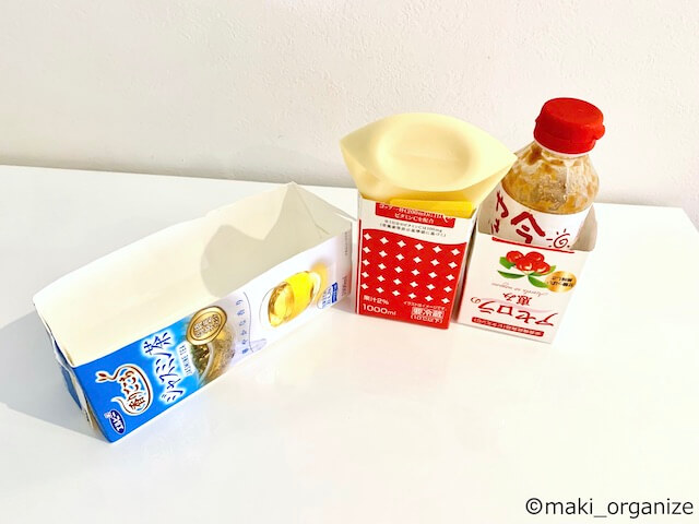 サイゾーウーマン暮らし住まい空き箱再利用の収納法12 暮らし 伊藤まきの「お片付けSOS」相談! 予算0円でも片付く! プロがやってる、靴箱・段ボールでできる「空き箱」収納法12テクニック 2022/09/19 19:00 伊藤まき(収納ライター) 「お片付け・お掃除SOS」伊藤まき [空き箱収納法:5]紙パックドリンク 取り替えが簡単だから、汚れても平気!(C)maki_organize こちらはもう説明不要ですね。パックドリンクは、防水加工された紙なので「汚れに強い整理箱」として大活躍! 調味料や冷蔵庫の野菜室に使ったり、薬や文房具の仕切り箱にも良いです。また、数をそろえやすい点も魅力。こまめに集めて「靴下ケース」や「ネクタイケース」などにも◎。 [ポイント]自由な加工で、使い方は無限大 紙パックドリンクは、強度がしっかりしているので入れるモノを選びません。また、引き出しのサイズに合わせた加工も簡単です。ちょっと汚れても取り替えやすいと思います。 [空き箱収納法:6]綿棒と糸ようじのケース ラベルが剥がれない時は、マステで目隠し(C)maki_organize こちらも欠かせない定番ですね。透明なので、中身が見える収納になります。洗面台の小物をはじめ、化粧品、ヘアケア、薬、冷蔵庫まわりに使えます。中身が見えない箱に入れて、小物が埋もれてしまうバッドケースを防げます。 [空き箱収納法:7]ストック食材の箱(カレー、粉スープなど) 賞味期限記載がない側をカッターでカット(C)maki_organize カレー粉、レトルトパウチ食品、粉スープ、シリアルなど保存食の「平たい箱」は「仕切り板」と「小袋食品のケース」になります。 [ポイント]最初の「開け方」が大事! ポイントは、食材を出す時にふたから開けないこと。再利用を意識して、サイドやセンターから開封することです。食品袋が横に倒れて埋もれたり、中身が散らかる面倒がなくなります。また、使う食材も箱の1/3〜1/4上部をカットすると取り出しやすく散らかりません。 次のページ [空き箱収納法:8]プラスチック製のふた付き容器(海苔、ガムなど) 前のページ123次のページ 関連記事 ダイソー「本当に使える」収納アイデア28選! プロがおすすめ最新アイテムまとめ【2022年9月最新版】ダイソー「Standard Products」のおすすめ! ギュウギュウのキッチンが収納力アップ狭い家のストレス解消! 収納の無駄スペースを減らす、ちょっとしたテク14プロが選ぶ100均「かもいフック」、イチオシはコレ! 10通りの使用法で収納力アップ収納のプロが買わない100均「靴収納グッズ」! 片付かない家によくあるNGアイテムは?
