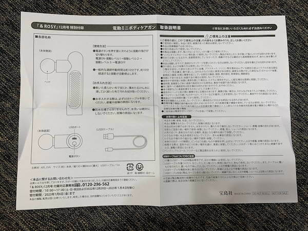 サイゾーウーマン暮らし100均・雑貨「&Rosy」12月号付録レビュー 暮らし 【雑誌付録レビュー】 【付録レビュー】「&Rosy」12月号、「uka 電動ミニボディケアガン」使ってみたらとっても気持ち良い! 見た目もおしゃれで大満足 2022/10/24 17:49 amimeko(ライター) 雑誌付録(ふろく)レビュー いまや付録で雑誌を選ぶのは当たり前。毎月魅力的な付録が登場し、どれにしようか迷いますよね。そこで、付録を実際に手にして、見た目や使い勝手を徹底レビューします! 今月の付録:「&Rosy」2022年12月号「uka 電動ミニボディケアガン」 お得度:★★★★★(1,390円で話題の美容家電をGET!) もっと使いたい度:★★★★☆(手のひらサイズで使いやすい☆) おしゃれ度:★★★★★(シックなデザインが◎) &Rosy 2022年12月号 とuka 電動ミニボディケアガン(C)サイゾーウーマン 「&Rosy」(宝島社)12月号の特別付録は、大人気のトータルビューティブランド「uka(ウカ)」とのコラボ付録が登場。コンパクトな手のひらサイズ「uka 電動ミニボディケアガン」です。 「&ROSY」は偶数月の隔月刊にリニューアルし、付録もさらに魅力的になりました! リニューアル第1弾となる今回は、電動のボディケアガンが付録とのことで、発売前からSNSで話題に。大きさや使い心地、電池式なの? などいろいろ疑問に思っていたことがあるので、順番に確認していこうと思います。 それでは早速、見ていきましょう♪ 箱の中に入っていたのは、この3点。 ・本体 ・USBケーブル ・説明書 箱の中で固定された状態で入っていました(C)サイゾーウーマン まず本体は、黒色でシックでシンプルなデザインです。ukaのロゴが白色でプリントされていてとてもおしゃれです♪ シックでお洒落なデザイン♪(C)サイゾーウーマン 【本体サイズ】(約):H13×W8.4cm(最大) 【素材】本体:ABS、EVA 大きさは、使いやすく持ち運びやすいコンパクトサイズ。 手が小さい私にとってはありがたいサイズ(C)サイゾーウーマン 小さな手の方でも握りやすく、からだのさまざまなパーツにあてやすいようにデザインされています。 旅先にも持ち運びしやすいコンパクトなサイズ感がとてもいい感じ。 付属されているUSBケーブルの長さは1m。 1mあればどのパーツにも余裕を持ってあてられる(C)サイゾーウーマン 充電式ではなく、電源に差し込みながら利用するようです。充電を気にせず利用できるのも個人的にポイント高いです。連続動作時間は10分で、経過すると自動停止する仕様になっているとのこと。 美容家電ということもあり、取扱説明書が付いています。 取扱説明書(C)サイゾーウーマン お手入れ方法や、使用上の注意など大切なことが書かれているので、使用前に必ず目を通しておきましょう。 医療機器ではないのでその点をしっかり理解して使用したいですね。 次のページ 「uka 電動ミニボディケアガン」、実際に使うと鎖骨あたりがとっても気持ち良い! 12次のページ 関連記事 【付録レビュー】「JELLY」12月号、SLYのスマホショルダーストラップとメイク4点セットでコスパ最強! 秋冬メイクがキマる!【付録レビュー】「MonoMax」11月号、Marmot「超豪華!お出かけ3点セット」が既製品レベルのクオリティでおすすめ!【付録レビュー】「otonaMUSE-オトナミューズ」11月号、「Celvoke」音波振動ヘアブラシ使ったら……くせ毛がこんなにまとまった!【付録レビュー】「GLOW」11月号、KINOKUNIYA「ロゴ入りBIGバッグ」がおしゃれ! 肩掛け&手さげで使えて便利【付録レビュー】「MonoMax」10月号、「アーバンリサーチ 超特大ボストンバッグ」の利便性は? チェックしてみた