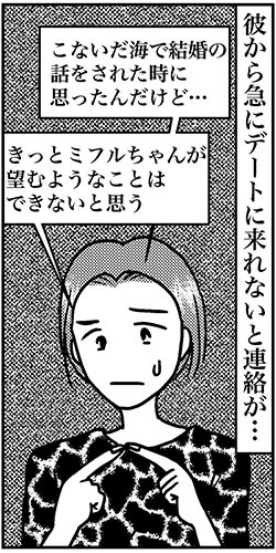 サイゾーウーマンカルチャーマンガ【アラフォー婚活ルポ】彼氏はデートを拒否……誕生日目前ですべてがダメに カルチャー まんが『オバサンと言われても結婚したい!』210話 【アラフォー婚活ルポ】彼氏はデートを拒否……誕生日目前ですべてがダメに 2023/02/12 13:30 白戸ミフル(マンガ家) オバサンと言われても結婚したい! 彼氏からも…… ――続きは2月15日公開! 【アラフォー婚活ルポ】年上男子と試しにデート……見た目は普通だけど楽しい!――合コン歴20年以上、累計回数2,500回以上、30代なかばに乳がんで闘病するも、現在は絶賛婚活中のライター・漫画家の白戸ミフルが「アラフォー婚活」の実体験をほぼリアルタ...サイゾーウーマン2023.01.29 【アラフォー婚活ルポ】アプリで出会った彼氏の結婚願望を聞く! 返ってきた答えは……――合コン歴20年以上、累計回数2,500回以上、30代なかばに乳がんで闘病するも、現在は絶賛婚活中のライター・漫画家の白戸ミフルが「アラフォー婚活」の実体験をほぼリアルタ...サイゾーウーマン2023.01.22 ――バックナンバーはこちら 前のページ123 白戸ミフル(マンガ家) 神奈川県出身。漫画家・ライター。タレント活動の後、マスコミ系の職業を渡り歩き、現在は化粧品メーカーに勤務。合コン歴20年以上、累計回数2500回以上。女性向けwebメディアほか、男性向けメディア、旅系メディア等でライターとして幅広く執筆。著書『合コン・アンド・ザ・シティ 恋活・婚活女子の合コンマニュアル』(ごきげんビジネス出版)、 『乳がんステージ4だった私が、それでも合コンに行きまくって救われた話』(キノブックス) 記事一覧 X:@takara0722 Instagram:@tamifull0722 【アラフォー闘病&婚活記】 最終更新:2023/02/12 13:30 そういう時もあるよね…… 関連記事 【アラフォー婚活ルポ】アプリで出会った彼氏とスピード破局! イケメンだったのに惜しいことした?【アラフォー婚活ルポ】アプリ婚活を再開! コミュニティで共通の話題のある人を探す!【アラフォー婚活ルポ】なんつーイケメン!!! 銀座に降臨した美しき婚活男性【アラフォー婚活ルポ】39歳でフラれた私は「鬼」になった! 恋愛してやる!! 【アラフォー婚活ルポ】結婚相談所の紹介は○○……アラフォー3人、2021年の婚活を振り返る! その他の作品を読む 次の記事 『ブラッシュアップライフ』に「中だるみ」 >