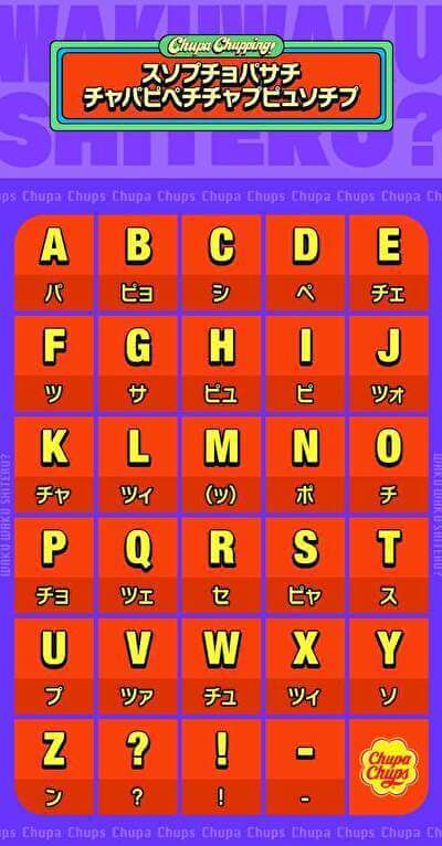 チュッパチャプスのポップで弾けるような音感をベースに、チャ行やパ行を中心に構成。発音することでワクワクするような楽しさや可愛さを表現することができるチュッパチャプスオリジナル言語です。