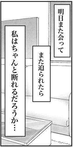 サイゾーウーマンカルチャーマンガアラフォー婚活、また彼に迫られたら…… カルチャー まんが『オバサンと言われても結婚したい!』236話 【アラフォー婚活ルポ】また彼に迫られたらどうする? その時の気持ちに…… 2023/05/14 13:30 白戸ミフル(マンガ家) オバサンと言われても結婚したい! ――合コン歴20年以上、累計回数2,500回以上、30代なかばに乳がんで闘病するも、現在は絶賛婚活中のライター・漫画家の白戸ミフルが「アラフォー婚活」の実体験をほぼリアルタイムでお届けします! アラフォー中の結婚は成就するのか……!? 【前回まで】 20代男子にセフレにされかけた痛い経験をバネにして「婚活の鬼」になった私。マッチングアプリを中心に行動中! 海外婚活時代に知り合った韓国男子と3年ぶりに再会し、「ホテルの部屋に行きたい」と懇願され断って帰るも、ハンディファンを忘れたことに気が付く。連絡をした彼はいつも通り優しく、次の日渡してもらえることに。 236話『また彼に迫られたらどうする? その時の気持ちに……』 次のページ 美容クリニックへ! 123次のページ 関連記事 【アラフォー婚活ルポ】アプリで出会った彼氏とスピード破局! イケメンだったのに惜しいことした?【アラフォー婚活ルポ】アプリ婚活を再開! コミュニティで共通の話題のある人を探す!【アラフォー婚活ルポ】なんつーイケメン!!! 銀座に降臨した美しき婚活男性【アラフォー婚活ルポ】39歳でフラれた私は「鬼」になった! 恋愛してやる!! 【アラフォー婚活ルポ】結婚相談所の紹介は○○……アラフォー3人、2021年の婚活を振り返る! その他の作品を読む