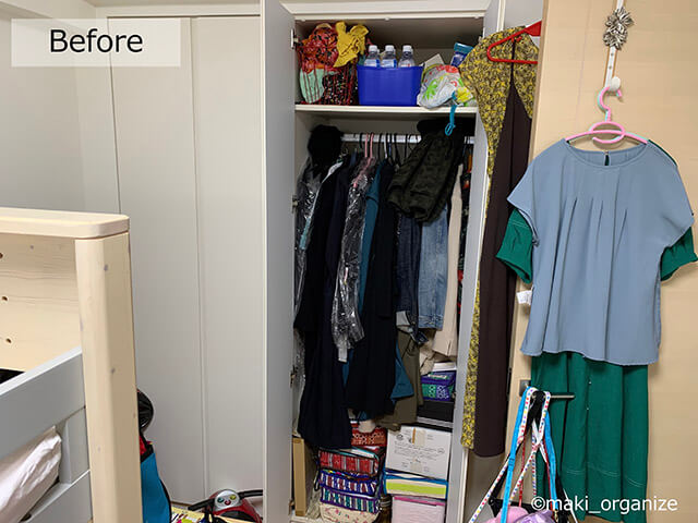 サイゾーウーマン暮らし住まいマンションの収納問題を専門家が解決! 暮らし [連載]女たちの「煩悩部屋」ビフォーアフター 片付けのプロが指摘する「クローゼットのNG収納」! 服の脱ぎ散らかしはコレで解決 2023/06/13 17:00 伊藤まき(収納ライター) 「汚部屋」ビフォーアフター 【Before】クローゼットの中身にテーマがない 洋服のほか、雑貨や防災グッズが混在(C)maki_organize あらためて、子ども部屋クローゼットの【Before】です。子どもの身長では、手が届かない高さでもパパにはちょうど良いサイズ。都心のマンションは「収納空間」が少ないので、どこの部屋にあるかよりも、誰にとって使いやすいかを優先的に考えると◎です。 【After】パパ専用の中身に統一 小物収納は100均の引き出しケースで十分!(C)maki_organize 散らからないためには、家族それぞれが「個人的な空間」を持つことが大切なので、「パパ専用のクローゼット」を用意しました。クローゼット内の、棚板とポールの位置も変更しています。それでは、ポイント別に解説していきます! 【ポイント.1】ハンガーをスリムなものに揃える 薄型のハンガー統一で、収納力が上がります(C)maki_organize 棚ダボの「ハンガーパイプ」は、高さ調整が可能です。パイプを1本増やすのも簡単。ホームセンターなら、1,000円前後の予算で追加できます。サイズが合えば、IKEAのコムプレメントハンガーレール(50cm)が500円(税込)でお得。 また、横幅が狭い場合はハンガーもスリムに揃えると良いです。シャツが多いので、ニトリ「すべりにくい省スペースハンガー メンズ」を選びました。出し入れが快適になるのはもちろん、かさばりが減ります。 【ポイント.2】ネクタイは扉裏に「引っ掛け収納」 耐荷重の強い粘着フックなどを使ってもOK(C)maki_organize ネクタイやベルトは、この家にあった小物用ハンガーへ。扉裏にドア用フックをかけてまとめます。量が多い場合は、100均のワイヤーネットを使うと◎。ウォールポケットや粘着フックを使って、「扉裏の収納」も活用しましょう。 【ポイント.3】小物はダイソー「B4収納バスケット」へ 商品番号:4549131960266(サイズ:W30.7×D42.7×H8.1cm)(C)maki_organize 隣部屋のクローゼットから棚板を移動して、1枚増やしました。男性の服装小物は少量なので「浅型の箱」で十分。このクローゼットは、奥行き58cmなのでA3とB4サイズが入ります。今回はダイソーの「B4収納バスケット」100円(税抜)を4つ揃えました。底面に「家具保護パッド」を貼れば、引き出しのように使えます。 次のページ 【ポイント.4】男性の衣装ケースは「深型」がぴったり 前のページ123次のページ 関連記事 バッグや帽子は「見える化」が◎! プロが教える「片付かない」原因&小物収納のポイント【子ども部屋収納】10の工夫をプロが伝授! 散らからない&お手伝いもしやすく【子ども部屋収納】クローゼット不使用! 狭くても洋服が片付く方法をプロが伝授【汚部屋】雪崩が起こる押し入れを大改造! 片付けのプロが教える5つの収納術【汚部屋】ぐちゃぐちゃな押し入れを片付ける10の手順――専門家が教える収納のコツとは?