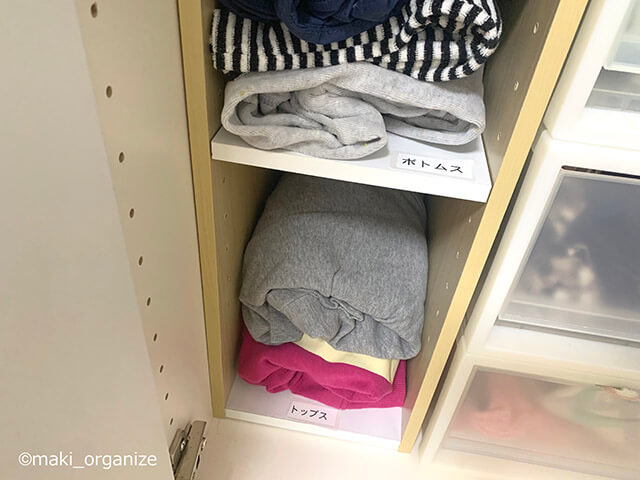 サイゾーウーマン暮らし住まい【クローゼット収納】片付けのプロが「ニトリのハンガー」選ぶ理由――ビフォアフター徹底解説 暮らし [連載]女たちの「煩悩部屋」ビフォーアフター 【クローゼット収納】片付けのプロが「ニトリのハンガー」選ぶ理由――ビフォアフター徹底解説 2023/06/27 17:00 伊藤まき(収納ライター) 「汚部屋」ビフォーアフター 【解説.3】カラボは「置くだけ収納」でワンアクション 引き出しは「開けて入れる」、棚は「入れる」だけ(C)maki_organize クローゼットの扉を開ける動作を除いて、ワンアクションでモノをしまうことができるのが、カラーボックス、スチールラックなどの「オープンラック」です。デニムやトレーナーなど、カジュアルな洋服の収納に◎。また、オープンラックの場合は「蝶番の凹凸」を考えなくても大丈夫です。 【解説.4】使用頻度の低い洋服は「引き出し収納」へ 無印良品の収納ケース(約W34×D44.5cm)(C)maki_organize 引き出し収納は小物や下着なら簡単ですが、洋服は「うまく収める作業」が必要になります。毎日の作業なので、面倒で続かないと思う人も。そんなタイプなら、引き出し収納は使用頻度が低い服を入れるようにしましょう。 【解説.5】透明の「靴ケース」にハンカチを収納 ハンカチを収納(C)maki_organize 何度も紹介している、ダイソーの「シューズケース」です。あらゆる規格サイズのモノが不思議なほど収まります。仕事バッグを置くリビングや洗面所に置いてもOK。棚や引き出しの内側にもぴったり入るので便利です。 ダイソーの入手困難「シューズケース」、収納のプロも愛用! 万能すぎる使用実例8パターン整理収納アドバイザー1級で収納ライターの伊藤まきが、家の中の “片付かない”ちょっとした悩みを“簡単で安く”解決するコツを提案します! これまで2回、100均グッズを商...サイゾーウーマン2020.10.19 【解説.6】ふた付の収納ボックスは、1番散らかりやすい いつか使うかもしれないポーチ類(C)maki_organize 余っていた箱に「ポーチ類」をまとめました。基本的に、出し入れが多いモノを「ふた付ボックス」に収納することはNG。ふた付は散らかりやすくなるからです。また、中身が見えないので忘れがちになる点もマイナス。今回は「いつか使うかもと迷ったモノ」を入れると◎です。 【解説.7】手が届かない上段は「年に1度」程度のモノを 手前には、冠婚葬祭用のハンドバッグを(C)maki_organize 余っていたジッパー付き収納バッグに「夏のプールグッズ」をまとめて、クローゼット上段へ。踏み台がないと手が届かない高さなので、使用頻度の低いモノの収納が◎。なお、ビフォーより「棚板」の高さを2段上に調整しています。 最後に、可動棚のクローゼットについて説明します。 次のページ 棚板とポールが動かせる「自由なクローゼット」 前のページ1234次のページ 関連記事 「狭いクローゼット」収納アイデア8選! プロが教える「洋服を捨てない」片付け術片付けのプロが指摘する「クローゼットのNG収納」! 服の脱ぎ散らかしはコレで解決バッグや帽子は「見える化」が◎! プロが教える「片付かない」原因&小物収納のポイント【子ども部屋収納】10の工夫をプロが伝授! 散らからない&お手伝いもしやすく【子ども部屋収納】クローゼット不使用! 狭くても洋服が片付く方法をプロが伝授