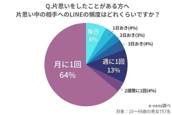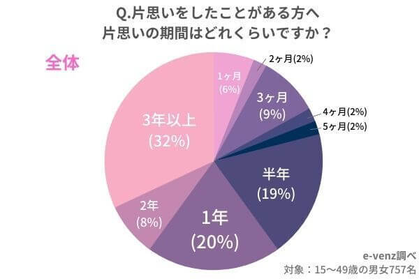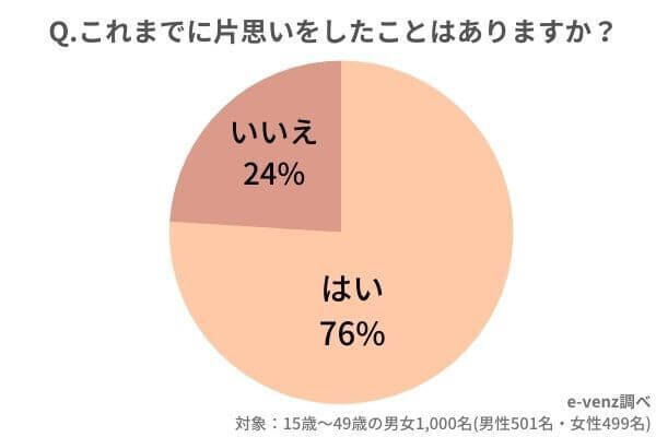 サイゾーウーマンカルチャー片思いの期間ってどれくらい?【男性の本音】【女性の本音】【ラインの頻度】【諦め方】までを徹底調査 カルチャー 片思いの期間ってどれくらい?【男性の本音】【女性の本音】【ラインの頻度】【諦め方】までを徹底調査 2023/07/02 12:15 サイゾーウーマン編集部(@cyzowoman) 写真ACより 婚活・恋活や街コンなど中心とする男女の出会いメディア「e-venz」(イベンツ)を運営するノマドマーケティング株式会社(所在地:東京都渋谷区、代表取締役:三輪賢治)では、全国の1,000名の男女(15歳~49歳)を対象に片思いの割合から【期間】【男性の本音】【女性の本音】【ラインの頻度】【諦め方】についてのアンケートを実施しました。 これまでに片思いをした経験がある人の割合はどのくらいなのでしょうか。 今回「e-venz」では1,000名の男女にアンケート調査を行いました。 ・アンケート内容 ●これまでに片思いをしたことはありますか? ・はい ・いいえ [対象者] 調査対象:全国15歳~49歳の男女 ・調査サマリー 今回の調査では片思いをしたことがある人の割合は76%、片思いをしたことがない人の割合は24%でした。男女別のデータでは片思いをしたことがある男性は73%、女性は78%となり、男性より女性の方が片思い経験がある人が若干多いことが分かりました。 【アンケート調査概要】 調査方法:インターネットアンケート 調査期間:2021年9月21日~2021年9月21日 調査対象:全国15歳~49歳の男女 有効回答数:1,000(男性501名・女性499名) では、片思い中の相手に対する心理とはどのようなものなのでしょうか。 片思い経験がある人に尋ねてみました。 Q.「片思いをしたことがある」と回答された男性へ 片思い中の相手に対してどのような心理になりましたか? ・「ドキドキする」(37歳/東京都) ・「毎日ワクワク」(38歳/大阪府) ・「相手との接点を持ちたい」(41歳/東京都) ・「緊張する」(39歳/茨城県) ・「話しかけづらくなりかえって距離が離れてしまいます」(49歳/埼玉県) ・「なかなかしんどい」(41歳/神奈川県) ・「眺めているだけで良い」(30歳/大阪府) ・「とてもつらく苦しい」(48歳/北海道) ・「心臓がきゅっとなる」(38歳/新潟県) 「ドキドキする」「毎日ワクワクする」など、片思いを楽しんでいる男性もいる一方、「しんどい」「とても苦しい」など、好きだからこそつらいと感じている人の声も目立ちました。 Q.「片思いをしたことがある」と回答された女性へ 片思い中の相手に対してどのような心理になりましたか? ・「意識しすぎてわざと避けたりしてしまう」(27歳/福岡県) ・「恥ずかしくて話かけられない」(47歳/東京都) ・「近付きたいけど近付けない」(41歳/京都府) ・「学校などで、廊下やイベントなどで相手を見たい」(35歳/静岡県) ・「自分が好きだということをバレたくない」(38歳/東京都) ・「思いが伝えられなくて苦しい」(29歳/千葉県) ・「何故か相手と顔を合わせたくなくなる」(41歳/東京都) ・「頭から離れない」(48歳/埼玉県) ・「相手に気に入られたい」(49歳/京都府) ・「会えたらその日一日嬉しい、何とも思っていない人なら気軽に誘えるのにどうしても誘えない」(48歳/千葉県) 女性心理としては、片思い中の相手を意識しすぎて「好き避け」してしまう人が多い傾向がありました。「近づきたいのに近づけない」「思いが伝えられなくて苦しい」など、もどかしい気持ちになっている女性が多いことが分かります。 「告白する」or「諦める」どちらにしても、片思いはどれくらいの期間継続するべきなのでしょうか。 e-venzでは、片思いをしたことがある男女に片思い期間についてアンケート調査を行いました。 Q.片思いをしたことがある方へ 片思いの期間はどれくらいですか? 今回の調査では、なんと「片思い期間3年以上」という人が最も多い割合となりました。 一度好きになった相手のことを長い間思い続ける方が多いことが分かります。 また、年代別に見ると10~20代よりも30~40代のほうが長期間片思いする方が多い傾向があります。 ただ、片思い期間はあまり長くならない方が良いでしょう。 なぜなら、続けば続くほど「叶わない」という思いが強くなり、自分自身が踏み出せなくなる可能性が高いからです。 上記のアンケート調査では3年以上片思いする人が多いことが分かりましたが、連絡頻度はどのくらいなのでしょうか。 今回はそのあたりについても調査してみました。 Q.片思いをしたことがある方へ 片思い中の相手へのLINEの頻度はどれくらいですか? 片思いの相手へのラインの頻度は月に1回が64%と最も多い結果となりました。 「毎日」と答えた方はわずか8%にとどまっていて、控え目な方が多いようですね。 ちなみに年代別では、月に1回と答えた方は以下の割合となっています。 ・10代:0% ・20代:47% ・30代:51% ・40代:71% 以上の結果から、年代が上がるほど片思いの相手への連絡頻度が下がることが分かります。 片思いの相手とのラインの頻度は「絶対毎日!」「週に1回は必ず!」などこちら
