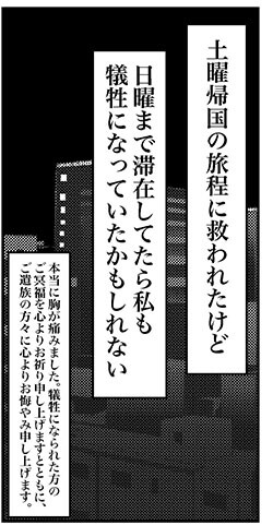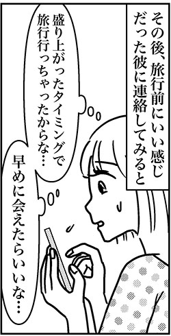 サイゾーウーマンカルチャーマンガアラフォー婚活、いい感じだったのに…… カルチャー まんが『オバサンと言われても結婚したい!』264話 【アラフォー婚活ルポ】いい感じだったのに……タイミングが悪く会えない日々 2023/08/20 13:30 白戸ミフル(マンガ家) オバサンと言われても結婚したい! ――合コン歴20年以上、累計回数2,500回以上、30代なかばに乳がんで闘病するも、現在は絶賛婚活中のライター・漫画家の白戸ミフルが「アラフォー婚活」の実体験をほぼリアルタイムでお届けします! アラフォー中の結婚は成就するのか……!? 【前回まで】 20代男子にセフレにされかけた痛い経験をバネにして「婚活の鬼」になった私。マッチングアプリを中心に行動中! 韓国旅行から帰国し、昨日までいたイテウォンの事故を知ることに。そして、旅行前にアプリで知り合った彼に連絡してみるが……。 264話『いい感じだったのに……タイミングが悪く会えない日々』 次のページ 仕事なら仕方ない…… 123次のページ 関連記事 【アラフォー婚活ルポ】アプリで出会った彼氏とスピード破局! イケメンだったのに惜しいことした?【アラフォー婚活ルポ】アプリ婚活を再開! コミュニティで共通の話題のある人を探す!【アラフォー婚活ルポ】なんつーイケメン!!! 銀座に降臨した美しき婚活男性【アラフォー婚活ルポ】39歳でフラれた私は「鬼」になった! 恋愛してやる!! 【アラフォー婚活ルポ】結婚相談所の紹介は○○……アラフォー3人、2021年の婚活を振り返る! その他の作品を読む