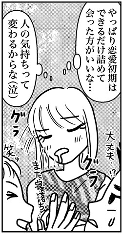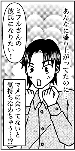 サイゾーウーマンカルチャーマンガアラフォー婚活、冷めちゃった? カルチャー まんが『オバサンと言われても結婚したい!』265話 【アラフォー婚活ルポ】気持ちが冷めちゃった? 会えないし連絡もない彼 2023/08/23 13:30 白戸ミフル(マンガ家) オバサンと言われても結婚したい! やっぱり恋愛初期は…… ――続きは8月27日公開! 【アラフォー婚活ルポ】セフレになる気はない! 「けじめ」のメッセージに対する返信は……――合コン歴20年以上、累計回数2,500回以上、30代なかばに乳がんで闘病するも、現在は絶賛婚活中のライター・漫画家の白戸ミフルが「アラフォー婚活」の実体験をほぼリアルタ...サイゾーウーマン2023.08.02 【アラフォー婚活ルポ】普段は優しい彼なのに……ホテルの前での一言に困惑――合コン歴20年以上、累計回数2,500回以上、30代なかばに乳がんで闘病するも、現在は絶賛婚活中のライター・漫画家の白戸ミフルが「アラフォー婚活」の実体験をほぼリアルタ...サイゾーウーマン2023.07.30 ――バックナンバーはこちら 前のページ123 白戸ミフル(マンガ家) 神奈川県出身。漫画家・ライター。タレント活動の後、マスコミ系の職業を渡り歩き、現在は化粧品メーカーに勤務。合コン歴20年以上、累計回数2500回以上。女性向けwebメディアほか、男性向けメディア、旅系メディア等でライターとして幅広く執筆。著書『合コン・アンド・ザ・シティ 恋活・婚活女子の合コンマニュアル』(ごきげんビジネス出版)、 『乳がんステージ4だった私が、それでも合コンに行きまくって救われた話』(キノブックス) 記事一覧 X:@takara0722 Instagram:@tamifull0722 【アラフォー闘病&婚活記】 最終更新:2023/08/23 13:30 初期はコンスタントに会うべし 関連記事 【アラフォー婚活ルポ】アプリで出会った彼氏とスピード破局! イケメンだったのに惜しいことした?【アラフォー婚活ルポ】アプリ婚活を再開! コミュニティで共通の話題のある人を探す!【アラフォー婚活ルポ】なんつーイケメン!!! 銀座に降臨した美しき婚活男性【アラフォー婚活ルポ】39歳でフラれた私は「鬼」になった! 恋愛してやる!! 【アラフォー婚活ルポ】結婚相談所の紹介は○○……アラフォー3人、2021年の婚活を振り返る! その他の作品を読む 次の記事 當間琉巧の俳句に誤爆か >
