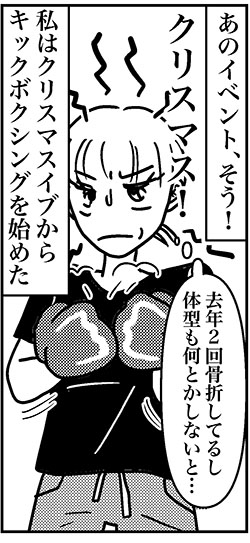 サイゾーウーマンカルチャーマンガアラフォー婚活、来年こそは…… カルチャー まんが『オバサンと言われても結婚したい!』267話 【アラフォー婚活ルポ】恋愛は時間がないとできない? 来年こそは地に足をつけて…… 2023/08/30 13:30 白戸ミフル(マンガ家) オバサンと言われても結婚したい! キックボクシングを開始! ――続きは9月3日公開! 【アラフォー婚活ルポ】セフレになる気はない! 「けじめ」のメッセージに対する返信は……――合コン歴20年以上、累計回数2,500回以上、30代なかばに乳がんで闘病するも、現在は絶賛婚活中のライター・漫画家の白戸ミフルが「アラフォー婚活」の実体験をほぼリアルタ...サイゾーウーマン2023.08.02 【アラフォー婚活ルポ】普段は優しい彼なのに……ホテルの前での一言に困惑――合コン歴20年以上、累計回数2,500回以上、30代なかばに乳がんで闘病するも、現在は絶賛婚活中のライター・漫画家の白戸ミフルが「アラフォー婚活」の実体験をほぼリアルタ...サイゾーウーマン2023.07.30 ――バックナンバーはこちら 前のページ123 白戸ミフル(マンガ家) 神奈川県出身。漫画家・ライター。タレント活動の後、マスコミ系の職業を渡り歩き、現在は化粧品メーカーに勤務。合コン歴20年以上、累計回数2500回以上。女性向けwebメディアほか、男性向けメディア、旅系メディア等でライターとして幅広く執筆。著書『合コン・アンド・ザ・シティ 恋活・婚活女子の合コンマニュアル』(ごきげんビジネス出版)、 『乳がんステージ4だった私が、それでも合コンに行きまくって救われた話』(キノブックス) 記事一覧 X:@takara0722 Instagram:@tamifull0722 【アラフォー闘病&婚活記】 最終更新:2023/08/30 13:30 キックボクシングでケガしないようにね 関連記事 【アラフォー婚活ルポ】アプリで出会った彼氏とスピード破局! イケメンだったのに惜しいことした?【アラフォー婚活ルポ】アプリ婚活を再開! コミュニティで共通の話題のある人を探す!【アラフォー婚活ルポ】なんつーイケメン!!! 銀座に降臨した美しき婚活男性【アラフォー婚活ルポ】39歳でフラれた私は「鬼」になった! 恋愛してやる!! 【アラフォー婚活ルポ】結婚相談所の紹介は○○……アラフォー3人、2021年の婚活を振り返る! その他の作品を読む 次の記事 なにわファンに異例の呼びかけ >