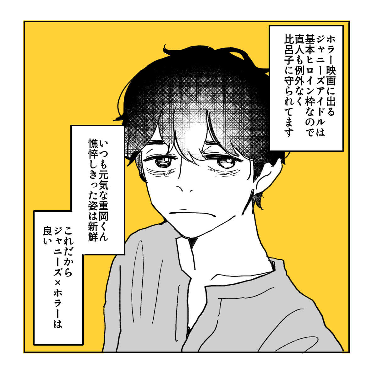 サイゾーウーマン男性アイドルSTARTO(旧ジャニーズ)WEST.重岡大毅重岡は映画『禁じられた遊び』のヒロイン? 男性アイドル [ジャニオタ漫画家・竜田トキヒロの“推し事”見聞録]vol.23 【ジャニオタマンガ】映画『禁じられた遊び』、ヒロインは橋本環奈ではなくジャニーズWEST・重岡大毅だった 2023/09/13 21:00 竜田トキヒロ(マンガ家) 重岡大毅ジャニーズwest竜田トキヒロの“推し事”見聞録 映画『禁じられた遊び』ジャニーズWEST・重岡大毅はヒロイン枠!? 【ジャニオタマンガ】映画『Gメン』は“愛されキャラ”岸優太にピッタリ! 門松勝太にみんなメロメロ――Twitterで日々、ジャニーズタレントにまつわるイラストを投稿中のジャニオタ漫画家・竜田トキヒロが、現場レポートからドラマや映画、番組レビューまで、“推し事”の様子を...サイゾーウーマン2023.08.30 【ジャニオタマンガ】SixTONES・ジェシーの悪役が怖すぎる!? 映画『リボルバー・リリー』レビュー――Twitterで日々、ジャニーズタレントにまつわるイラストを投稿中のジャニオタ漫画家・竜田トキヒロが、現場レポートからドラマや映画、番組レビューまで、“推し事”の様子を...サイゾーウーマン2023.08.16 【ジャニオタマンガ】なにわ男子・西畑大吾主演映画『忌怪島』、“厄介オタク”登場で怖さ半減?――Twitterで日々、ジャニーズタレントにまつわるイラストを投稿中のジャニオタ漫画家・竜田トキヒロが、現場レポートからドラマや映画、番組レビューまで、“推し事”の様子を...サイゾーウーマン2023.06.28 前のページ123 竜田トキヒロ(マンガ家) 漫画家、イラストレーター。育休中に執筆したエッセイ漫画でKADOKAWAコミックエッセイ大賞受賞。Ameba、ライブドア公式ブロガーを経たのち現在はインフルエンサーとしてエンタメ、オタクに特化した漫画やイラストや体験ルポ等幅広く執筆。著書『コミュ障母さんとごきげん娘』(KADOKAWA) X:@musumenuma 最終更新:2023/09/13 21:00 重岡、不倫する役多くない? 関連記事 【ジャニオタマンガ】中村嶺亜は「不動の皇帝」矢花黎は「軍師」! 7 MEN 侍ステマシート【ジャニオタマンガ】映画『Gメン』は“愛されキャラ”岸優太にピッタリ! 門松勝太にみんなメロメロ【ジャニオタマンガ】ジャニーズJr.集結の『わっしょいCAMP』、井ノ原快彦社長の“愛”を感じたワケ【ジャニオタマンガ】SixTONES・ジェシーの悪役が怖すぎる!? 映画『リボルバー・リリー』レビュー【ジャニオタマンガ】目黒蓮&原嘉孝が“仲違い”? 『トリリオンゲーム』第4話プレイバック 次の記事 ダウンタウンの番組が強い、TVerいいね数ランク >
