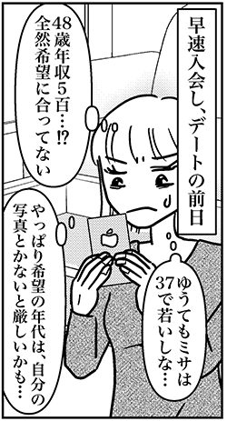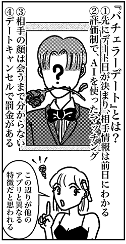 サイゾーウーマンカルチャーマンガアラフォー婚活、バチェラーデートに入会 カルチャー まんが『オバサンと言われても結婚したい!』272話 【アラフォー婚活ルポ】バチェラーデートに入会! AIを信じて希望条件に合わない男性に会ってみる 2023/09/17 13:30 白戸ミフル(マンガ家) オバサンと言われても結婚したい! ――合コン歴20年以上、累計回数2,500回以上、30代なかばに乳がんで闘病するも、現在は絶賛婚活中のライター・漫画家の白戸ミフルが「アラフォー婚活」の実体験をほぼリアルタイムでお届けします! アラフォー中の結婚は成就するのか……!? 【前回まで】 20代男子にセフレにされかけた痛い経験をバネにして「婚活の鬼」になった私。マッチングアプリを中心に行動中! 友人が「バチェラーデート」で彼氏をゲットしたため、さっそく入会。AIを信じて1人目の男性に会ってみるが……。 272話『バチェラーデートに入会! AIを信じて希望条件に合わない男性に会ってみる』 次のページ AIの学習は…… 123次のページ 関連記事 【アラフォー婚活ルポ】アプリで出会った彼氏とスピード破局! イケメンだったのに惜しいことした?【アラフォー婚活ルポ】アプリ婚活を再開! コミュニティで共通の話題のある人を探す!【アラフォー婚活ルポ】なんつーイケメン!!! 銀座に降臨した美しき婚活男性【アラフォー婚活ルポ】39歳でフラれた私は「鬼」になった! 恋愛してやる!! 【アラフォー婚活ルポ】結婚相談所の紹介は○○……アラフォー3人、2021年の婚活を振り返る! その他の作品を読む
