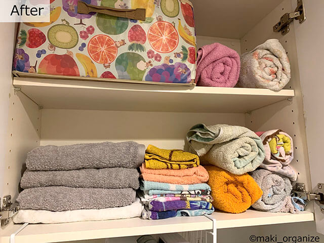 サイゾーウーマン暮らし住まい狭い洗濯機周りがスッキリ美収納に 暮らし [連載]女たちの「煩悩部屋」ビフォーアフター 「狭い」洗濯機周りの収納力が劇的アップ! プロが教える100均アイテム活用実例&ビフォーアフター 2023/09/26 17:00 伊藤まき(収納ライター) 「汚部屋」ビフォーアフター 吊り戸棚収納の【After】 出し入れが多いタオルの上は、拳ひとつの余白をとる(C)maki_organize タオルの数を減らして、種類別に分類したら「入れ方・たたみ方」を変えます。使用頻度が少ない「古タオル」と「バスマット」はボックスへ。手が届かない上段でも、ボックスにまとめれば崩れ落ちる心配がありません。次に、手が届く下段を広くするために「棚板の位置」も変更しました。 そして、大中小のタオルの「たたみ方を変える」ことで、目的のサイズを1回で出すことができるように。サイズが違う2種のタオル(大)は、平置きと丸めることでまとまりました。 ふた蓋の開閉にぶつからないサイズ感を確認!(C)maki_organize 仕方なく床上に置いていた大きな洗剤ボトルと、ワイヤーラックに横置きしていた小さな洗剤ボトルは、洗剤の液漏れで壁や床がベタベタ……。そこで、ホームセンターの端材(1枚100円)に、リメイクシートを貼った板の上に。また、空き箱を隙間にひっかけて斜めにし、洗濯バサミを収納しました。 板材100円とリメイクシートだけで完成(C)maki_organize 洗剤ボトルの底面より大きめで、洗濯機の隙間を塞ぐサイスの板材を、ホームセンターの端材コーナーで選びました。板が不安定なときは、「魔法のテープ」で固定すると◎。 洗濯機周りの収納全体の【After】 ボックス類は、家にあった箱を再利用(C)maki_organize 入れ方の工夫で、見た目スッキリ「取り出しやすい収納」に変わりました。 全部のステップは以下の7つです。 (ステップ1)タオルと洗剤の数を見直す (ステップ2)吊り戸棚の棚板の位置を変える (ステップ3)タオルを種類別に分けて、たたみ方を変える (ステップ4)予備のタオルなどは、上段のボックスに入れる (ステップ5)洗剤ボトルを、フラットな板材の上に置く (ステップ6)空き箱を隙間にひっかけて斜めにし、洗濯バサミを収納 (ステップ7)給水ホースをクリップとS字フックでまとめる 次のページ 【おまけ】ランドリーバスケットはメッシュがスリム 前のページ1234次のページ 関連記事 片付け専門家が教える洗濯機まわり収納術! 「約5,000円」で可動棚をDIY100均「プラダン」で激変! 洗濯機、ホコリまみれの「防水パン」が3ステップで収納空間に使いにくい「洗濯機まわり」がスッキリ! 収納力アップには「○○の延長」とキャスター付きのアレ【洗面所収納】目的のモノを1回で出せる! 100均グッズ活用「引き出し仕切り術」をプロが伝授【洗面台下収納】100均グッズでごちゃごちゃがスッキリ! プロが選んだ収納ケース&ラックは?