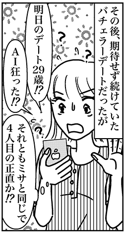 サイゾーウーマンカルチャーマンガアラフォー婚活、4人目の正直? カルチャー まんが『オバサンと言われても結婚したい!』284話 【アラフォー婚活ルポ】バチェラーデートにも○○はいた……AI狂った? 2023/10/29 13:30 白戸ミフル(マンガ家) オバサンと言われても結婚したい! ――合コン歴20年以上、累計回数2,500回以上、30代なかばに乳がんで闘病するも、現在は絶賛婚活中のライター・漫画家の白戸ミフルが「アラフォー婚活」の実体験をほぼリアルタイムでお届けします! アラフォー中の結婚は成就するのか……!? 【前回まで】 20代男子にセフレにされかけた痛い経験をバネにして「婚活の鬼」になった私。マッチングアプリを中心に行動中! 諦めかけていたバチェラーデートだったが、29歳の男性とマッチング。イケてない人だったら終わりにしようと決意し、待ち合わせ場所に行ってみると……。 284話『バチェラーデートにも○○はいた……AI狂った?』 次のページ デカ…… 123次のページ 関連記事 【アラフォー婚活ルポ】アプリで出会った彼氏とスピード破局! イケメンだったのに惜しいことした?【アラフォー婚活ルポ】アプリ婚活を再開! コミュニティで共通の話題のある人を探す!【アラフォー婚活ルポ】なんつーイケメン!!! 銀座に降臨した美しき婚活男性【アラフォー婚活ルポ】39歳でフラれた私は「鬼」になった! 恋愛してやる!! 【アラフォー婚活ルポ】結婚相談所の紹介は○○……アラフォー3人、2021年の婚活を振り返る! その他の作品を読む