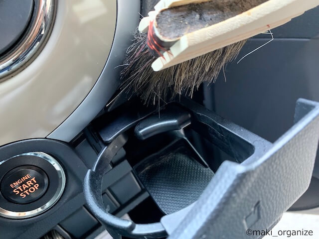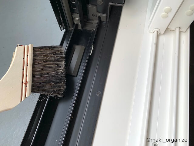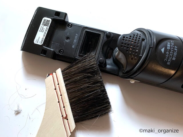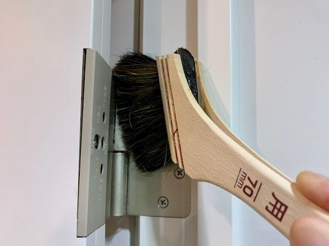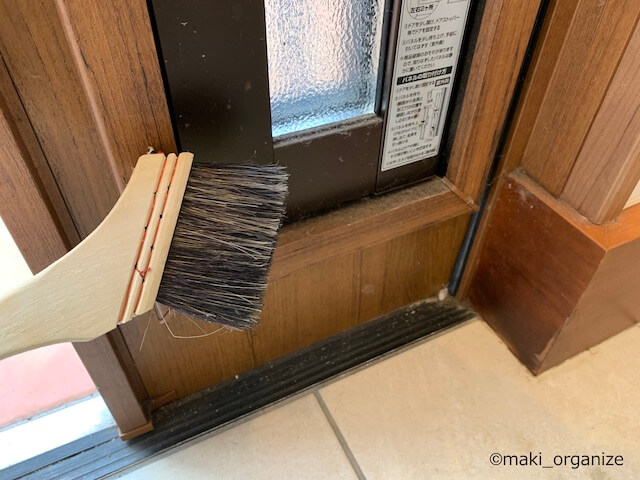 サイゾーウーマン暮らし住まい【ダイソー】「万能用ハケ」110円、黒カビ除去 暮らし 伊藤まきの「お片付けSOS」相談! 【ダイソー】110円「万能用ハケ」が黒カビ除去に最強! プロ直伝の掃除テクニック集 2023/12/26 17:00 伊藤まき(収納ライター) 「お片付け・お掃除SOS」伊藤まき 整理収納アドバイザー1級、クリンネスト2級の資格を持つ「掃除をしながら片付ける」伊藤まきさんが、ダイソー商品を使ったプロ技を紹介していきます! (C)maki_organize あっという間に、年末の大掃除の時期です。今回はダイソーとセリアの「刷毛」を使った掃除術を取り上げます。 写真上は、家具の塗装などでおなじみの「刷毛」。掃除のプロたちも、サッと出して使える道具として重宝しています。ホウキや掃除機よりもずっとコンパクトなので、場所をとらずに素早くホコリ払いができます。 目次 ・【ダイソー】油性用ハケ、万能用ハケ110円 ・【セリア】油性水性兼用刷毛、多用途刷毛110円 ・ダイソー「黒い刷毛」使用法1:家電の「詰まり汚れ」落としに ・ダイソー「黒い刷毛」使用法2:空気清浄機の「排気口」のお手入れに ・ダイソー「黒い刷毛」使用法3:サッシの「普段のお手入れ用」に! ・ダイソー「黒い刷毛」使用法4:玄関と室内のドア「蝶番まわり」に ・ダイソー「黒い刷毛」使用法5:天井まわりの「目の届かない場所」に ・ダイソー「黒い刷毛」使用法6:車の中と外の、あらゆる隙間に! ・ダイソー・セリア「白い刷毛」使用法:黒カビ掃除に! ・【黒カビ除去掃除】Before ・【黒カビ除去掃除】step1:水200mLに対し漂白剤が10ml ・【黒カビ除去掃除】step2:白い刷毛で漂白剤を塗布 ・【黒カビ除去掃除】step3:マイクロファイバータオルで水拭き ・【黒カビ除去掃除】After ・【黒カビ除去掃除】自力で作業するときの注意点 ダイソー・セリアの刷毛 【ダイソー】油性用ハケ、万能用ハケ110円 (C)maki_organize ダイソーとセリアDIYコーナーへ行くと、刷毛の横幅30〜70mmのサイズがそろいます。 ダイソーは黒(油性用ハケ)と白(万能用ハケ)の取り扱いで、セリアは白(兼用)。どちらもペイントが主な目的ですが、セリアだけ「多用途刷毛」があります。 【セリア】油性水性兼用刷毛、多用途刷毛110円 (C)maki_organize セリアとダイソーの違いは「毛量」と「毛の流れ」(C)maki_organize ダイソーのほうが毛量が多いので、小さなほうきのように「ほこり掃除」するのに万能です。セリアは毛量が少なく、毛先がそろうイメージで選び分けます。筆者的には、繊細なPCまわりのホコリ払いはセリアといった感じで、使い分けて選んでいます。なお、掃除に刷毛を使う前は必ず「手でしごいで抜け毛を取る」作業をしてから使います。 では、ダイソーの黒い刷毛を、小さなほうきのように使う「ほこり掃除」方法を紹介します。 ダイソー「黒い刷毛」使用法1:家電の「詰まり汚れ」落としに 水分が入ると、故障やトラブルの原因に!(C)maki_organize 掃除機や調理家電など、ホコリや食品カスが詰まりやすい部分に◎。ネジが多くて、通気口がある家電は「水や洗剤を使ったお手入れNG」なので乾いた布や刷毛を使います。凹凸の多いパーツは、布より「乾いた刷毛」のほうが、詰まった汚れを落とせます。 ダイソー「黒い刷毛」使用法2:空気清浄機の「排気口」のお手入れに モップや綿棒より、刷毛のほうがよく取れる(C)maki_organize 空気清浄機の「排気口」のホコリ取りも、掃除機に付属するブラシより良く取れます。でも、汚れが空中に舞うため掃除機でホコリを吸引しながら作業をする必要があります。 ダイソー「黒い刷毛」使用法3:サッシの「普段のお手入れ用」に! 刷毛の取っ手に穴があるので、フックに掛けられる(C)maki_organize 筆者宅では、「サッシ用の小さなホウキ」としてベランダに常備しています。普段から、サッと砂ホコリを落とせるので汚れがたまるのを阻止できます。 ダイソー「黒い刷毛」使用法4:玄関と室内のドア「蝶番まわり」に とくに、バスルームと玄関の扉が汚れやすい(C)maki_organize 室内と玄関ドアの「蝶番まわり」をはじめ、ドア枠の凹凸部分は「見落としがちな汚れ」がたまっています。おしゃれな「格子デザイン」の扉や引き戸も、ホコリがいっぱいです。 ダイソー「黒い刷毛」使用法5:天井まわりの「目の届かない場所」に モップを交換しなくて済むので楽!(C)maki_organize 部屋の四隅や煙探知機、ブレーカー、ダウンライトなど手が届きにくい「天井まわり」は、汚れも目に見えにくい場所です。ほんのり蜘蛛の巣や黒ずみ汚れがあったりします。もちろん、モップのほうが吸着力が強くホコリを落とさずに済みますが、コスパ面は刷毛が勝ちです。 ダイソー「黒い刷毛」使用法6:車の中と外の、あらゆる隙間に! 屋外用、車用と刷毛に用途を記すと◎(C)maki_organize 車内の細かいパーツ掃除はもちろん、ホイールやロゴなどの汚れ洗浄も柔らかい刷毛があると便利。本格的な「洗車ブラシ」という商品もありますが、低予算で済ませたいなら100均の刷