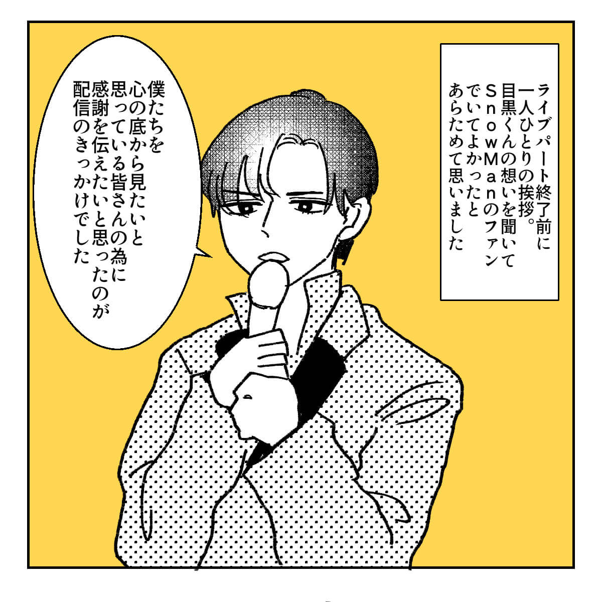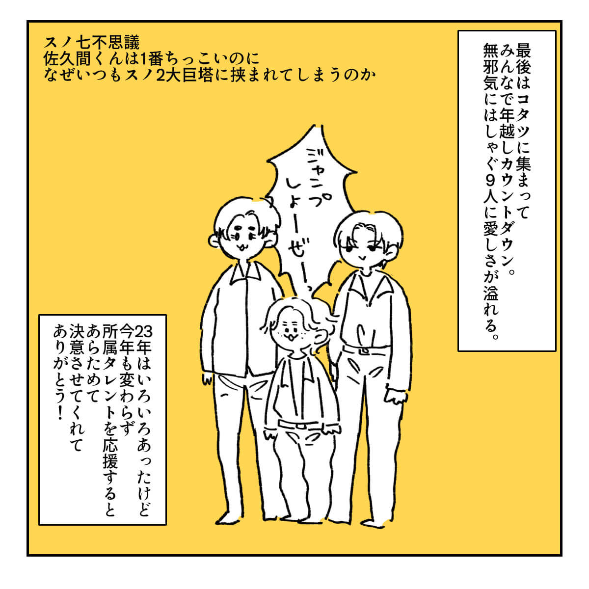サイゾーウーマン男性アイドルSTARTO(旧ジャニーズ)Snow Man年越し生配信、「応援しよう」とファンに決意させた目黒蓮の“言葉” 男性アイドル [ドルオタ漫画家・竜田トキヒロの“推し事”見聞録]vol.38 Snow Man年越し生配信、「応援しよう」とファンに決意させた目黒蓮の“言葉” 2024/01/06 23:30 竜田トキヒロ(マンガ家) 竜田トキヒロの“推し事”見聞録STARTO 「今年も応援しよう」と決意させた、Snow Man・目黒の言葉 ★これまでの連載記事はこちらから 関ジャニ∞からSixTONES、Snow Man、ジュニアまで……2023年の現場回顧録――Twitterで日々、STARTO ENTERTAINMENT(旧ジャニーズ事務所)のタレントをはじめとしたイラストを投稿中のドルオタ漫画家・竜田トキヒロが、現場レポー...サイゾーウーマン2024.01.05 BE:FIRST・SOTA、Snow Manラウールら『FNS歌謡祭』ダンスコラボ7名の魅力とは?――Twitterで日々、ジャニーズタレントにまつわるイラストを投稿中のジャニオタ漫画家・竜田トキヒロが、現場レポートからドラマや映画、番組レビューまで、“推し事”の様子を...サイゾーウーマン2023.12.13 【ジャニオタマンガ】Snow Manドーム公演レポ――ラウール&佐久間大介はまるでラスボス?――Twitterで日々、ジャニーズタレントにまつわるイラストを投稿中のジャニオタ漫画家・竜田トキヒロが、現場レポートからドラマや映画、番組レビューまで、“推し事”の様子を...サイゾーウーマン2023.06.21 前のページ123 竜田トキヒロ(マンガ家) 漫画家、イラストレーター。育休中に執筆したエッセイ漫画でKADOKAWAコミックエッセイ大賞受賞。Ameba、ライブドア公式ブロガーを経たのち現在はインフルエンサーとしてエンタメ、オタクに特化した漫画やイラストや体験ルポ等幅広く執筆。著書『コミュ障母さんとごきげん娘』(KADOKAWA) X:@musumenuma 最終更新:2024/01/06 23:38 気になった人は配信のアーカイブをチェックして 関連記事 関ジャニ∞からSixTONES、Snow Man、ジュニアまで……2023年の現場回顧録INIのパフォーマンスは新鮮! STARTOアーティストとの違いとは?BE:FIRST・SOTA、Snow Manラウールら『FNS歌謡祭』ダンスコラボ7名の魅力とは?Snow Manから&TEAM、JO1まで……『ベストアーティスト』名場面をプレイバック!KAT-TUN・亀梨和也のYouTube、“後輩”Snow Man・目黒蓮がかわいすぎ!? 次の記事 Aぇ! 、福本脱退で影響広がる >