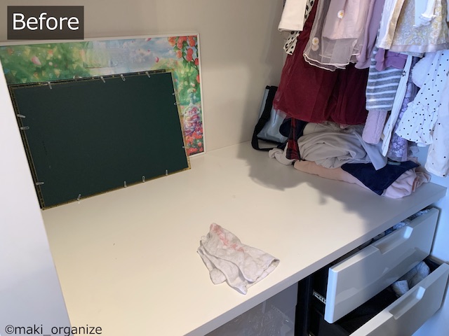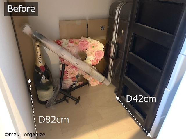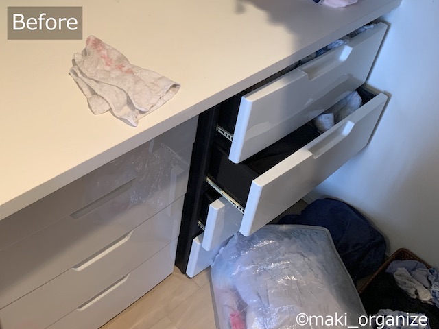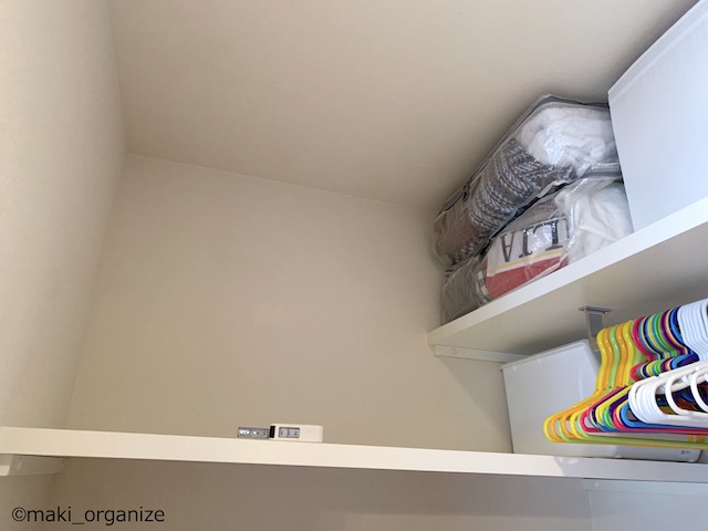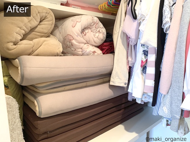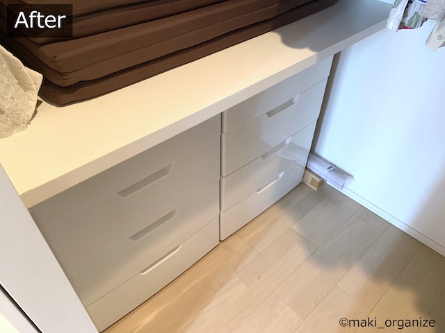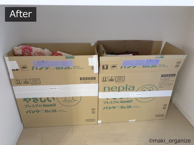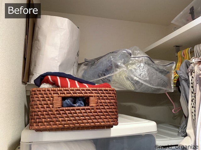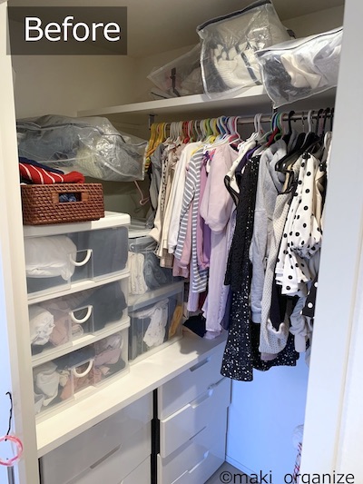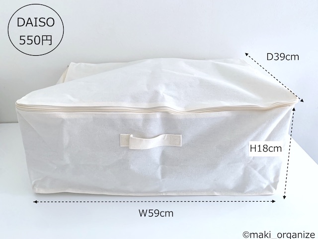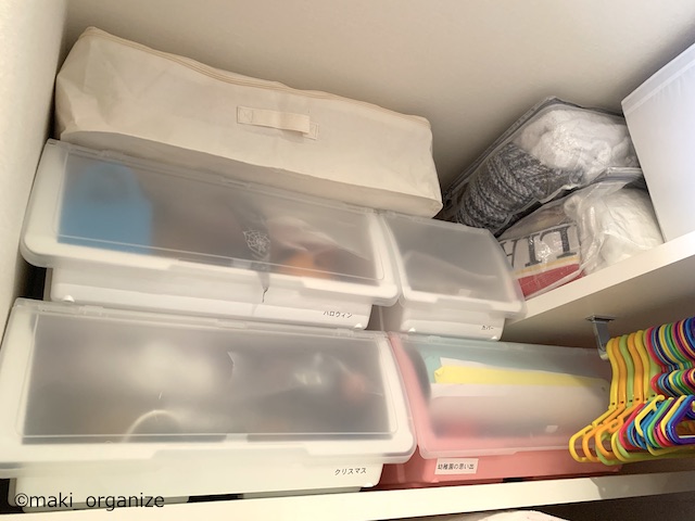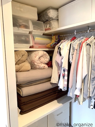 サイゾーウーマン暮らし住まい【ダイソー】550円「フタ付収納BOX(衣装)」 暮らし [連載]女たちの「煩悩部屋」ビフォーアフター 【ダイソー】550円「フタ付BOX」は布団収納に◎! プロのクローゼット整理術 2024/01/23 17:00 伊藤まき(収納ライター) 「汚部屋」ビフォーアフター 整理収納アドバイザーの伊藤まきさんが、片付けに悩む読者の自宅を使いやすく生まれ変わらせる連載シリーズ【「煩悩部屋」ビフォーアフター】。 連載企画『ビフォーアフター』新シーズンです。第8回目の片付けモニターは、江東区・3LDKのマンションで暮らす4人家族のKさん(35歳)。今回は、汚部屋の片付けではなく、都心のマンションに多い狭い収納を使いやすく「手直しする」特別編です。 【ダイソー】550円「フタ付収納BOX(衣装)」で布団スッキリ! JANコード(4550480082127)サイズ(W59×D39×H18cm)(C)maki_organize マンションのウォークインクローゼットを片付けるために、「布団の収納袋」としてダイソー「フタ付収納BOX(衣装)」550円(税込)を用意しました。 在庫限りの商品なのか、残念ながら店頭で見るのも少ない商品です。ダイソーにない場合は、しっかりした造りの無印良品かコスパの良いイケアの以下商品をおすすめします。 ・無印良品「ポリエステル麻 ソフトボックス」(W59×D39×H18cm)¥1,490(税込) ・イケア「スクッブ」収納ケース(W44×D55×H19cm)899円(税込) ・イケア「ブルクスヴァーラ」収納ケース(W62×D53×H19cm)¥499(税込) では、このダイソーアイテムを使って収納のお悩みを解決していきます。 【お悩み】クローゼットが狭くて布団が収納ができない ビニール製の収納ケースが滑り落ちる(C)maki_organize リビング脇にある「小さな和室」の奥にある、ウォークインクローゼット(WIC)のお悩みです。Kさんと娘さんのお洋服がすべて入っていて、衣替えの洋服や着ていない服も収納されています。 ここに、布団セットを入れたいのにスペースがないため、和室の片隅には出しっぱなしの布団が積んでありました。 形状が異なる収納グッズを積み重ねた結果(C)maki_organize サイズが異なる収納グッズが積まれているので「バランス崩壊」しています。お布団を収納するのにぴったりの空間があるものの、チェストで埋まっていますね。というわけで、掃除がてらすべてを見直すことに。 【クローゼット収納】手直しStep1 右上の収納ケースは、セリア(グレーの取手)(C)maki_organize 空間を空っぽにして、モノの見直しをします。この家にあったセリア「PE収納ボックス」110円(税込)サイズ(W59×D39×H18cm)を、滑り落ちないように直します。滑り落ちる理由は、ビニール生地が薄く柔らかいのでスカスカなだと積み重ねが難しいから。安定感を増すために、しっかり詰め込みました。 最上段が夏用毛布を収納したダイソー「フタ付収納BOX(衣装)」、下二段はニトリのケース(C)maki_organize この家にあった、ニトリの収納ケース4つを土台に使いました。その上に隙間ができたので、ダイソー「フタ付収納BOX(衣装)」550円(税込)を載せます。硬い収納ケースだと入らない空間でも、布製の収納ケースなら大丈夫! 夏用の毛布を収納することができました。 ニトリ「収納ケース Nフラッテ」大/794円、小/545円(ともに税込)※ふたは別売り。 【クローゼット収納】手直しStep2 チェストの裏や隙間から忘れていたモノが出てきました(C)maki_organize 中段にあったプラスチック製チェストは「着ていない洋服入れ」でした。中に入っていた洋服のほとんどを、フリマアプリへ出品し、チェストは子ども部屋へ移動。チェストが5つもあると、未使用の洋服が溜まりやすくなります。 ハンガー服を移動しやすくする工夫をしています(C)maki_organize チェストを片付けたスペースに「冬用の布団2組分」を入れることができました。これで、客人を招いても和室を隠すず済むとKさんも大喜び! 【クローゼット収納】手直しStep3 下段空間サイズ(W120×D84×H82cm)(C)maki_organize 下段の空間に合わせて購入したという、チェスト(D42cm)が2つ。でも、奥行きが浅いため引き出しを開閉するとチェストごと奥や横に動いてしまい使いにくいとのこと。動かないよう、奥行きに詰め物をしようと考えました。 花のオブジェが埃だらけでした(C)maki_organize チェストをどかしてみると、奥には結婚式の思い出、使わなくなった家具、トラベルスーツケースがゴチャゴチャと押し込まれていました。モノのバランスがデコボコで隙間が生じ、チェストが動いていた模様。こちらも、必要と不要に分けて保管方法を手直しします。 トラベルスーツケースは、別の部屋へ移動しました。(C)maki_organize おむつのまとめ買い用段ボールのサイズ(約W52×D21×H41)が、奥行きの空間を埋めるのにちょうど良かったので「保管用収納箱」として利用しました。左側に、結婚式の思い出グッズを。右側に、ブランドの空き箱をまとめています。 ブランドの空き箱管理法 透明な袋なので、ひとめで確認できるのも便利 段ボールの中身も、ゴチャゴチャにぶち込まないよう