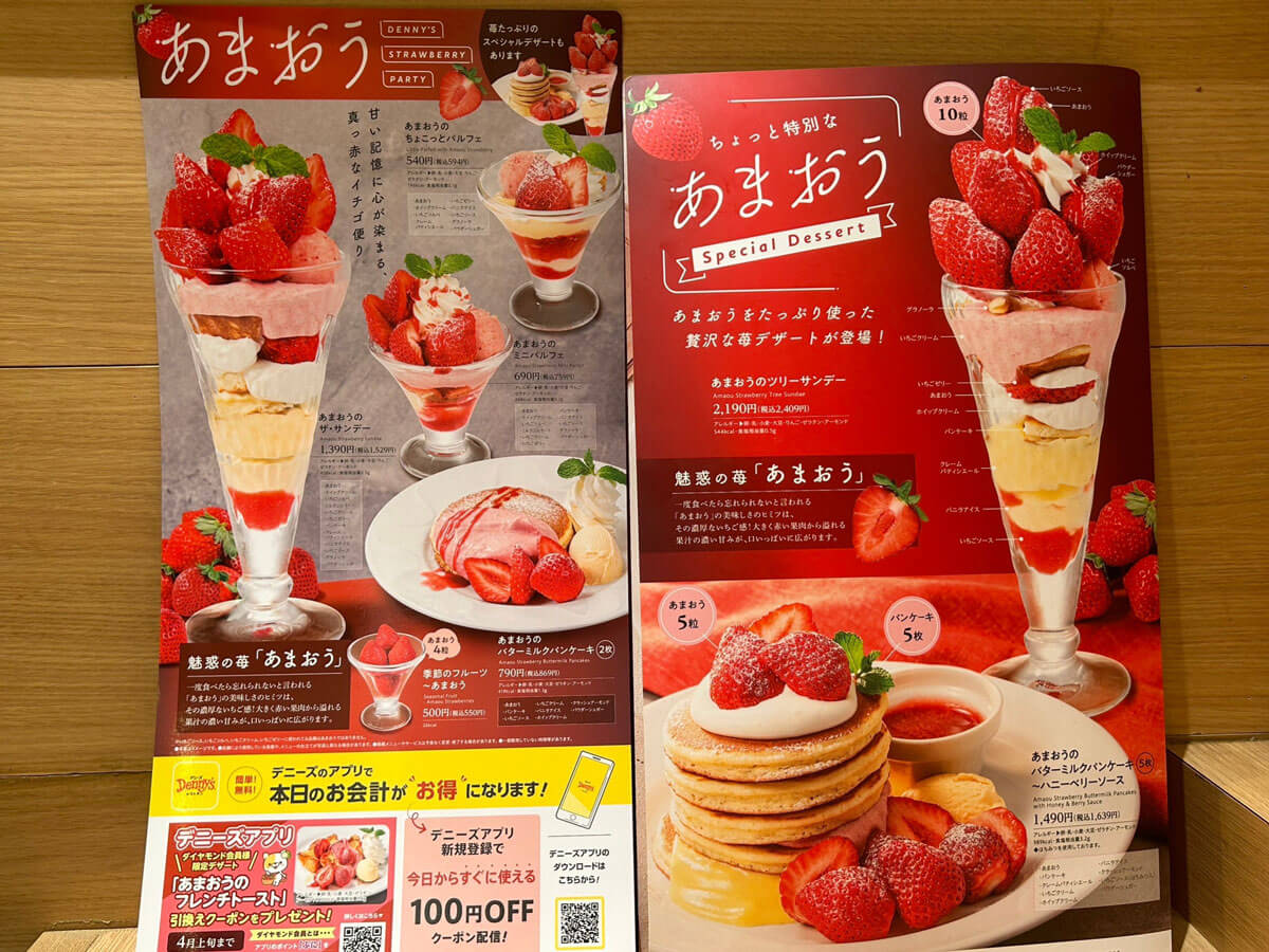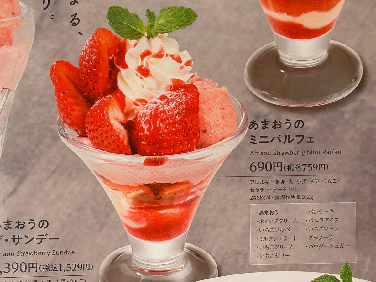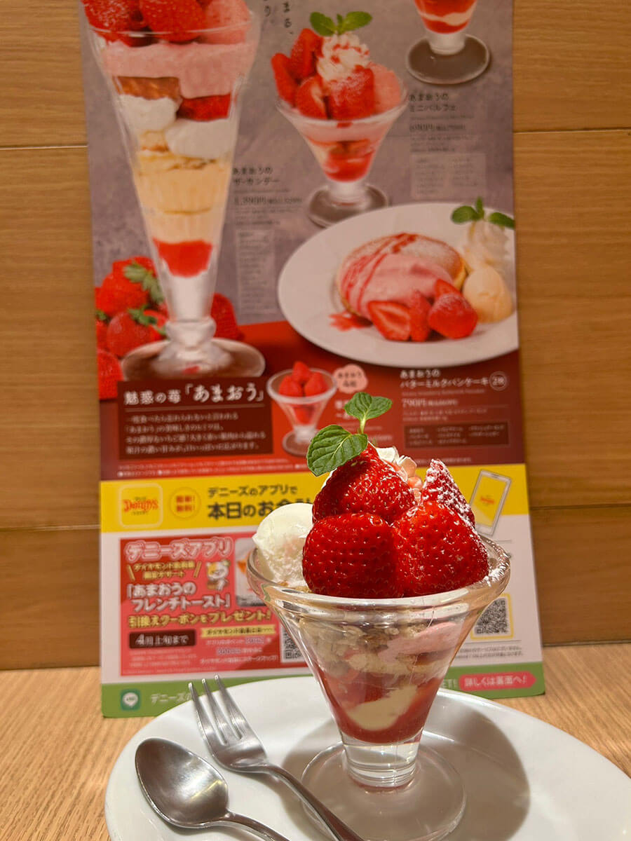 サイゾーウーマン暮らし【デニーズ】いちごスイーツが格段においしい 暮らし 人気チェーン実食レビュー 【デニーズ】いちごスイーツ、759円「あまおうミニパルフェ」が格段においしい! 29日まで200円引きも 2024/02/05 18:58 サイゾーウーマン編集部 暮らし デニーズの外観(C)サイゾーウーマン 冬から春にかけて旬を迎えるいちご。現在、各ファミレスチェーンでは、いちごを使った期間限定スイーツをさまざまに展開中です。 そこで今回は、1月9日から福岡県産のブランドいちご「あまおう」を使ったメニューを多数展開中のデニーズで、気になったメニューをレビューしていきます。 目次 ・【デニーズ】期間限定いちご「あまおう」スイーツ全7種の値段とカロリー ・【デニーズ】「あまおうのミニパルフェ」税込759円、いちごは2粒 ・【デニーズ】「あまおうのミニパルフェ」29日まで200円引きも! 【デニーズ】期間限定いちご「あまおう」スイーツ全7種の値段とカロリー デニーズの期間限定いちごスーツのメニュー表(C)サイゾーウーマン デニーズで展開中のいちごスイーツは、パフェやパンケーキ、無加工のいちごまで、以下の7品。 ・「あまおうのちょこっとパルフェ」税込594円(196kcal) ・「あまおうのミニパルフェ」税込759円(248kcal) ・「あまおうのザ・サンデー」税込1,529円(458kcal) ・「あまおうのバターミルクパンケーキ(2枚)」税込869円(419kcal) ・「季節のフルーツ~あまおう」(4粒)税込550円(26kcal) 【スペシャルデザート】 ・「あまおうのツリーサンデー」税込2,409円(544kcal) ・「あまおうのバターミルクパンケーキ(5枚)~ハニーベリーソース」税込1,639円(989kcal) 今回は、「ちょこっとパルフェ」と「ザ・サンデー」の中間のサイズ感の「ミニパルフェ」を注文することにしました。 【デニーズ】「あまおうのミニパルフェ」759円、いちごは2粒 「あまおうのミニパルフェ」税込759円(248kcal)(C)サイゾーウーマン 「あまおうのミニパルフェ」の実物写真がコチラ。メニュー表の写真のイメージ通りで、ガッカリ感はまったくありません。 メニュー―表には、アレルギー情報やカロリー、具材がしっかり記載されています(C)サイゾーウーマン なお、パルフェの中身は、以下の11個の具材が入っていました。 ・あまおう(2粒) ・ホイップクリーム ・いちごソルベ ・ミルクジェラート ・いちごクリーム ・いちごゼリー ・パンケーキ ・バニラアイス ・いちごソース ・グラノーラ ・パウダーシュガー これより小さい「ちょこっとパルフェ」には、ミルクジェラートやいちごクリーム、パンケーキは入っておらず、代わりに「クレームパティシエール」という、いわゆるカスタードクリームが入っている様子。また、あまおうの数も1粒と半分です。 そして「ザ・サンデー」には、あまおう5粒と上記12個の具材がすべて入っており、これを大きくしたのがスペシャルデザートの「ツリーサンデー」で、具材は変わりませんが、あまおうが倍の10粒乗っているそう。「いちごとパルフェをガッツリ食べたい!」という人は「ザ・サンデー」、数人でシェアしたいという人は「ツリーサンデー」がおすすめかなと思いました。 【デニーズ】「あまおうのミニパルフェ」を頼めば間違いないワケ 艶々としたいちごがおいしそう(C)サイゾーウーマン 反対側から見た写真(C)サイゾーウーマン 写真でも伝わる通り、上部にはパウダーシュガーがかかったあまおう2粒と、いちごソースがかかったホイップクリーム、いちごソルベ、ミルクジェラートが乗っています。 艶やかなあまおうは、 甘味と酸味のバランスが抜群で、とってもフレッシュでした。また、いちごの粒感が残ったソルベとミルクジェラートは甘すぎないので、ホイップクリームと一緒に食べてもまったくくどくなく、後味もさっぱりしていました。 赤いソースがいちごソースで、ピンク色が「いちごクリーム」です(C)サイゾーウーマン 前述の4つの具材の下には、グラノーラといちごクリームが敷かれていました。グラノーラはザクザクした食感で食べ応えもあり、甘みのあるいちごクリームや、ソルベ、ミルクジェラートと一緒に食べると格段においしかったです。 横からみるとこんな感じ。層になっているのがわかります(C)サイゾーウーマン そして、グラノーラの下にもいちごクリームがかかっていて、パンケーキやいちごゼリーの下にはバニラアイス、そして一番下にいちごソースが入っていました。 食べる前は、いちご2粒だと物足りない気もしていたんですが、あまおう自体の味が濃く、いちごソースもたっぷりかかっているので、最後までいちごの風味が口の中に残って幸せです。「ザ・サンデー」と比べると器もそこまで深くないので、スプーンで下までほじくりやすく、バランスよくいろんな具材の味わえたのも、その理由のひとつかもしれません。 いちごの風味を十分に感じられるちょうどいいサイズ感の「パルフェ」で、248kcalともそこまで罪悪感なく食べられるのもうれし