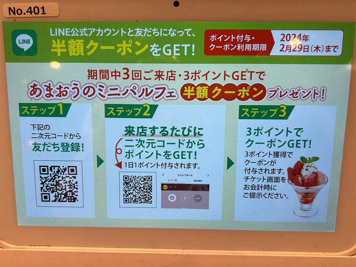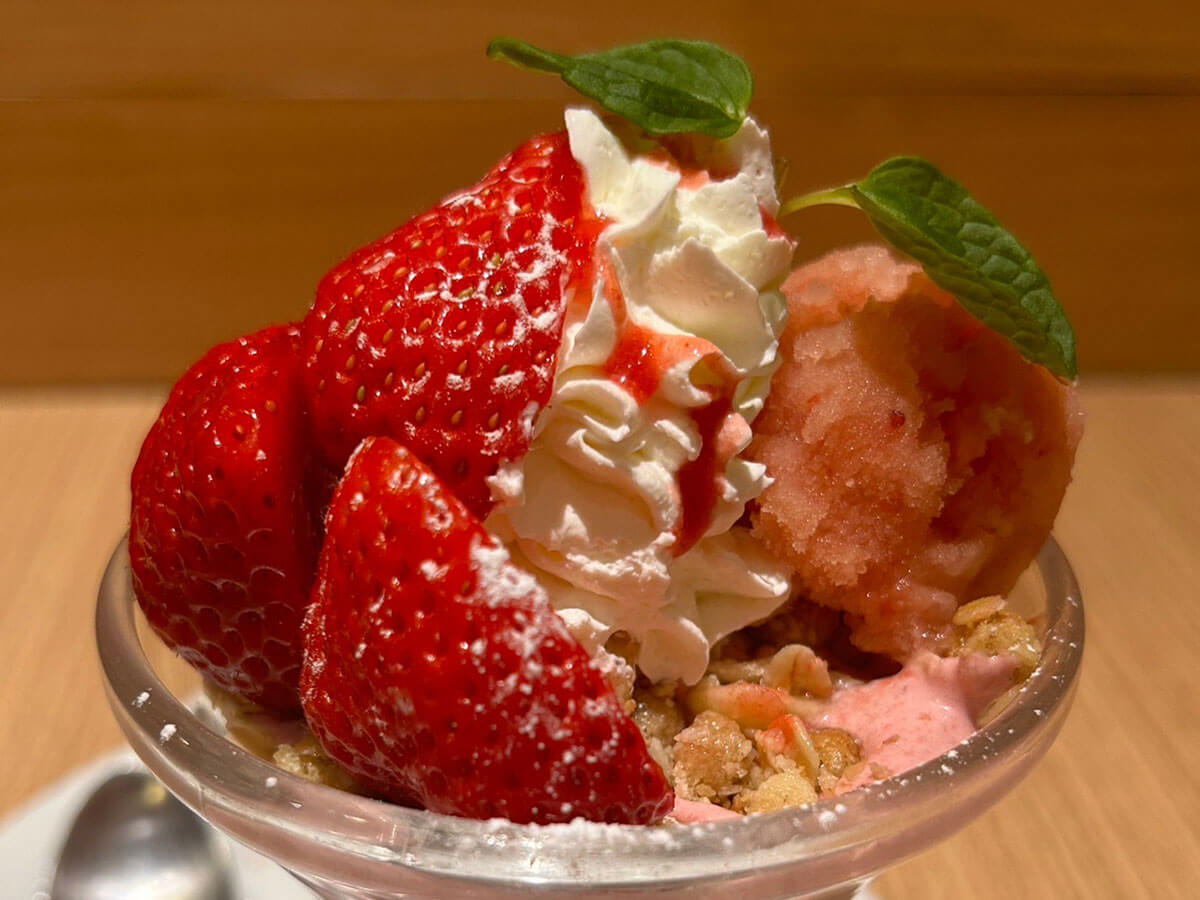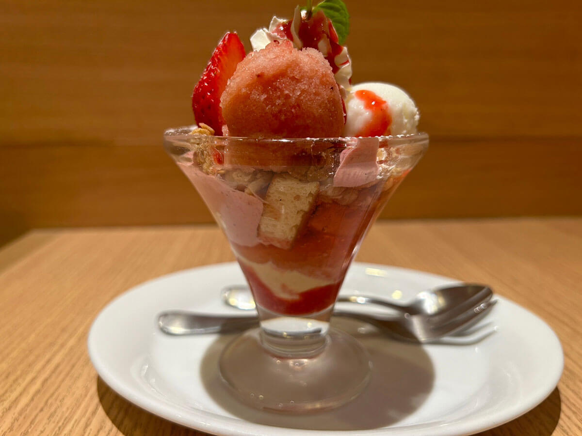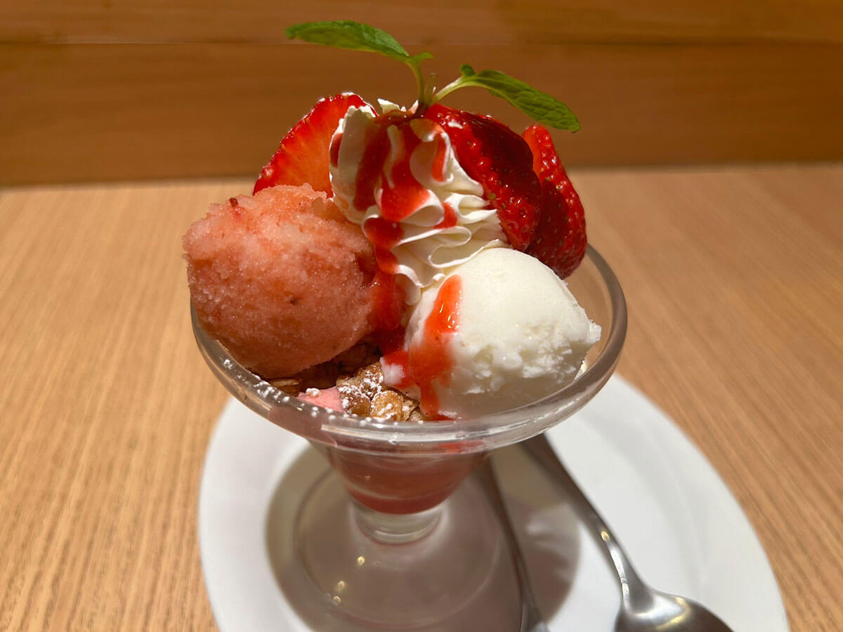 サイゾーウーマン暮らし【デニーズ】いちごスイーツが格段においしい 暮らし 人気チェーン実食レビュー 【デニーズ】いちごスイーツ、759円「あまおうミニパルフェ」が格段においしい! 29日まで200円引きも 2024/02/05 18:58 サイゾーウーマン編集部 暮らし デニーズの外観(C)サイゾーウーマン 冬から春にかけて旬を迎えるいちご。現在、各ファミレスチェーンでは、いちごを使った期間限定スイーツをさまざまに展開中です。 そこで今回は、1月9日から福岡県産のブランドいちご「あまおう」を使ったメニューを多数展開中のデニーズで、気になったメニューをレビューしていきます。 目次 ・【デニーズ】期間限定いちご「あまおう」スイーツ全7種の値段とカロリー ・【デニーズ】「あまおうのミニパルフェ」税込759円、いちごは2粒 ・【デニーズ】「あまおうのミニパルフェ」29日まで200円引きも! 【デニーズ】期間限定いちご「あまおう」スイーツ全7種の値段とカロリー デニーズの期間限定いちごスーツのメニュー表(C)サイゾーウーマン デニーズで展開中のいちごスイーツは、パフェやパンケーキ、無加工のいちごまで、以下の7品。 ・「あまおうのちょこっとパルフェ」税込594円(196kcal) ・「あまおうのミニパルフェ」税込759円(248kcal) ・「あまおうのザ・サンデー」税込1,529円(458kcal) ・「あまおうのバターミルクパンケーキ(2枚)」税込869円(419kcal) ・「季節のフルーツ~あまおう」(4粒)税込550円(26kcal) 【スペシャルデザート】 ・「あまおうのツリーサンデー」税込2,409円(544kcal) ・「あまおうのバターミルクパンケーキ(5枚)~ハニーベリーソース」税込1,639円(989kcal) 今回は、「ちょこっとパルフェ」と「ザ・サンデー」の中間のサイズ感の「ミニパルフェ」を注文することにしました。 【デニーズ】「あまおうのミニパルフェ」759円、いちごは2粒 「あまおうのミニパルフェ」税込759円(248kcal)(C)サイゾーウーマン 「あまおうのミニパルフェ」の実物写真がコチラ。メニュー表の写真のイメージ通りで、ガッカリ感はまったくありません。 メニュー―表には、アレルギー情報やカロリー、具材がしっかり記載されています(C)サイゾーウーマン なお、パルフェの中身は、以下の11個の具材が入っていました。 ・あまおう(2粒) ・ホイップクリーム ・いちごソルベ ・ミルクジェラート ・いちごクリーム ・いちごゼリー ・パンケーキ ・バニラアイス ・いちごソース ・グラノーラ ・パウダーシュガー これより小さい「ちょこっとパルフェ」には、ミルクジェラートやいちごクリーム、パンケーキは入っておらず、代わりに「クレームパティシエール」という、いわゆるカスタードクリームが入っている様子。また、あまおうの数も1粒と半分です。 そして「ザ・サンデー」には、あまおう5粒と上記12個の具材がすべて入っており、これを大きくしたのがスペシャルデザートの「ツリーサンデー」で、具材は変わりませんが、あまおうが倍の10粒乗っているそう。「いちごとパルフェをガッツリ食べたい!」という人は「ザ・サンデー」、数人でシェアしたいという人は「ツリーサンデー」がおすすめかなと思いました。 【デニーズ】「あまおうのミニパルフェ」を頼めば間違いないワケ 艶々としたいちごがおいしそう(C)サイゾーウーマン 反対側から見た写真(C)サイゾーウーマン 写真でも伝わる通り、上部にはパウダーシュガーがかかったあまおう2粒と、いちごソースがかかったホイップクリーム、いちごソルベ、ミルクジェラートが乗っています。 艶やかなあまおうは、 甘味と酸味のバランスが抜群で、とってもフレッシュでした。また、いちごの粒感が残ったソルベとミルクジェラートは甘すぎないので、ホイップクリームと一緒に食べてもまったくくどくなく、後味もさっぱりしていました。 赤いソースがいちごソースで、ピンク色が「いちごクリーム」です(C)サイゾーウーマン 前述の4つの具材の下には、グラノーラといちごクリームが敷かれていました。グラノーラはザクザクした食感で食べ応えもあり、甘みのあるいちごクリームや、ソルベ、ミルクジェラートと一緒に食べると格段においしかったです。 横からみるとこんな感じ。層になっているのがわかります(C)サイゾーウーマン そして、グラノーラの下にもいちごクリームがかかっていて、パンケーキやいちごゼリーの下にはバニラアイス、そして一番下にいちごソースが入っていました。 食べる前は、いちご2粒だと物足りない気もしていたんですが、あまおう自体の味が濃く、いちごソースもたっぷりかかっているので、最後までいちごの風味が口の中に残って幸せです。「ザ・サンデー」と比べると器もそこまで深くないので、スプーンで下までほじくりやすく、バランスよくいろんな具材の味わえたのも、その理由のひとつかもしれません。 いちごの風味を十分に感じられるちょうどいいサイズ感の「パルフェ」で、248kcalともそこまで罪悪感なく食べられるのもうれし