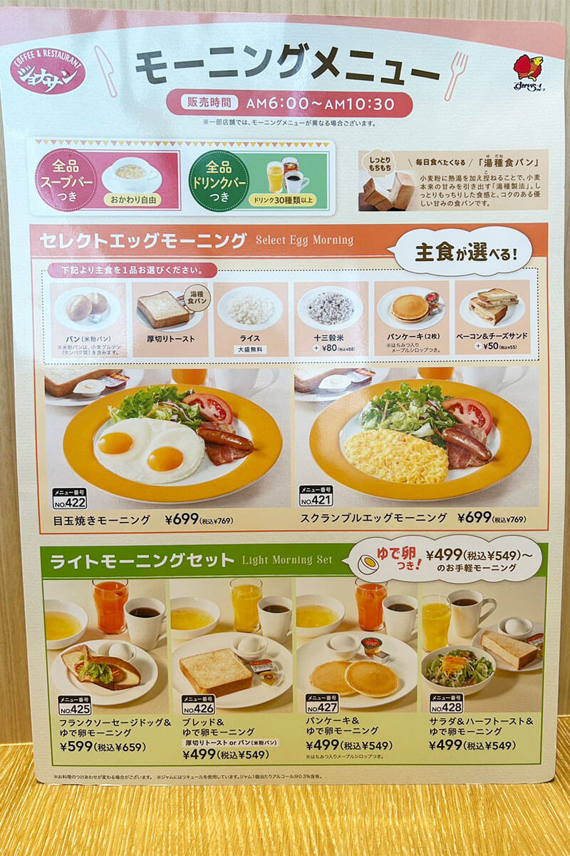 サイゾーウーマン暮らし食べ物ジョナサン、769円モーニングが魅力的 暮らし モーニング食べ比べレビュー 【ジョナサン】店舗数減の苦境でも……769円「スクランブルエッグモーニング」が魅力的なワケ 2024/03/07 19:00 サイゾーウーマン編集部 モーニング食べ比べレビュー ジョナサンの外観(C)サイゾーウーマン 喫茶店やファミレスなどが、朝の時間帯にドリンクとトースト等のメニューをお手頃価格で提供するモーニングサービス。今回はファミリーレストラン「ジョナサン」でモーニングを楽しんできました。 全国に188店舗ある「ジョナサン」は、「ガスト」「バーミヤン」「しゃぶ葉」などを展開するすかいらーくホールディングスが運営元。ウェブサイト「日経クロストレンド」が22年8月に掲載した記事によると、そのすかいらーくはコロナ禍のあおりを受け、近年は業績不振に見舞われており、19年12月に3,258店あった店舗数を22年7月時点で3,085店まで減らしたそう。公式サイトで確認したところ、23年12月31日時点の総店舗数は2,976店となっています。 そんな苦境の中でも、ガストやジョナサンでは、モーニングメニューが充実。特に、ジョナサンでは、こだわりのメニューを提供しており、コーヒーチェーンのモーニングメニューと比べても、コストパフォーマンスが高いようです。 そこで今回は、ジョナサンの種類豊富なモーニングメニューの中から、「スクランブルエッグモーニング」を実食してきました! ※価格はすべて税込 ※価格やメニューは2024年3月7日時点の情報です。 ※最新の情報は公式サイトや公式SNSをご確認ください。 ※店舗により内容・価格が異なる場合がございます。 目次 ・ジョナサン、14種類のモーニングメニューを紹介 ・「スクランブルエッグモーニング」769円、卵が絶品! ・コーヒーチェーンよりお得なジョナサンのモーニングの“魅力” ジョナサンのモーニングはメニューが充実! 14種類のフードを紹介 ジョナサンのモーニング提供時間は午前6~10時半まで(C)サイゾーウーマン ジョナサンのモーニングの提供時間は、午前6~10時30分。和洋両方のフードが用意されており、全品ドリンクバーとスープバーがついてくるお得なセットです。 和食メニューにはガッツリな定食も(C)サイゾーウーマン シンプルなトーストからパンケーキ、フレンチトースト、サンドイッチ、ピラフ、ドリア、魚定食からハンバーグ定食と、モーニングメニューとは思えない充実ぶりに驚きました。 【洋風モーニング】11種類 セレクトエッグモーニング ・「スクランブルエッグモーニング」769円 ・「目玉焼きモーニング」769円 ライトモーニングセット ・「フランクソーセージドッグ &ゆで卵モーニング」659円 ・「ブレッド&ゆで卵モーニング」549円 ・「パンケーキ&ゆで卵モーニング」549円 ・「サラダ&ハーフトースト&ゆで卵モーニング」549円 スペシャルモーニング ・「ふわとろフレンチトーストモーニング」659円 ・「ベーコンチーズサンドモーニング」549円 ・「シャキシャキキャベツの ベーコンエッグサンドモーニング」879円 ・「タンドリーチキン &メキシカンピラフモーニング」1,209円 ・「1日分の緑黄色野菜が摂れる ドリアモーニング」989円 【和朝食】3種類 ・「本まぐろの鉄火丼モーニング」1,539円 ・「焼鮭朝食ごはん・みそ汁・海苔付」989円 ・「和風ハンバーグ朝食」989円 【その他セットメニュー】※料理とセットで注文 ・「サラダセット」198円 スープセット ・「とうもろこしのポタージュ」198円 ・「オニオングラタンスープ」253円 ・「ミニヨーグルトセット」110円 ジョナサン「スクランブルエッグモーニング」769円、卵がふわふわとろとろで絶品! 好きな主食を選べるのはうれしい!(C)サイゾーウーマン 今回私は、6種類の主食の中から好きなものを選べるセレクトエッグモーニングの「スクランブルエッグモーニング」769円をチョイス! 主食の種類は、米粉パン、厚切りトースト(湯種食パン)、ライス(大盛無料)、十三雑穀米(プラス88円)、パンケーキ(2枚、はちみつ入りメープルシロップ付き)、ベーコン&チーズサンド(プラス55円)とある中、米粉パンを選びました。 本当は、ジョナサンこだわりの湯種食パンを使った厚切りトーストを注文したかったのですが、あいにく品切れ。この「湯種食パン」とは、小麦粉に熱湯を加えてこねる“湯種製法”で作られたもので、しっとりかつもちもちっとした食感になり、小麦の自然な甘みを感じられるそう。ネット上でも「トーストがおいしい」と評判だったため楽しみにしていたのですが……残念。 セレクトエッグモーニング「スクランブルエッグモーニング」769円(C)サイゾーウーマン こちらが実物です。メニューの写真のイメージ通りで、パン2つと、スクランブルエッグにベーコンとウインナー、トマト、サラダが乗ったプレートのセットです。 野菜が細かく刻まれているので小さなお子さんも◎(C)サイゾーウーマン まずは、セットでついてくるスープから実