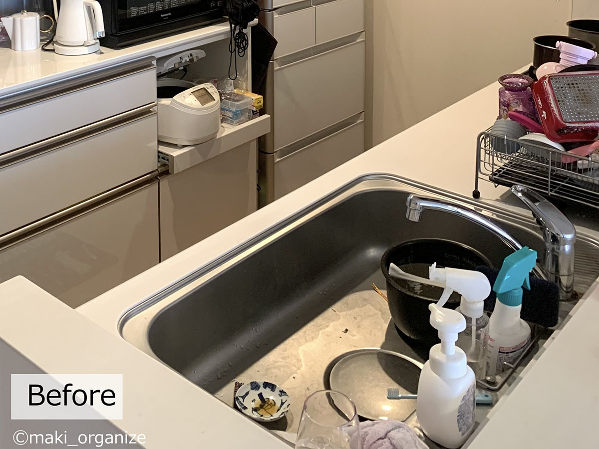 コンロ上は常時お鍋が出しっぱなしの状態。急な来客も多いということなので、スッキリ見えるように整えていきます。