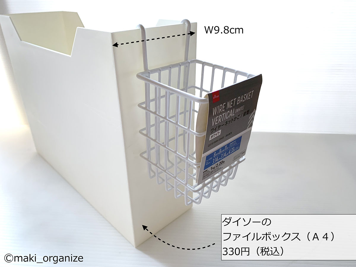 今回使ったファイルボックスは、ワッツとセリアで販売している「A4ファイルボックス(W13cm)」。単体だと空間が余ってボックスがズレるので、ダイソーの「ティッシュホルダー」を組み合わせて固定しています。