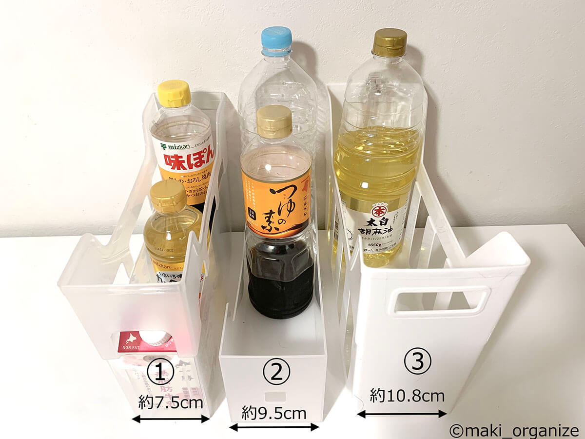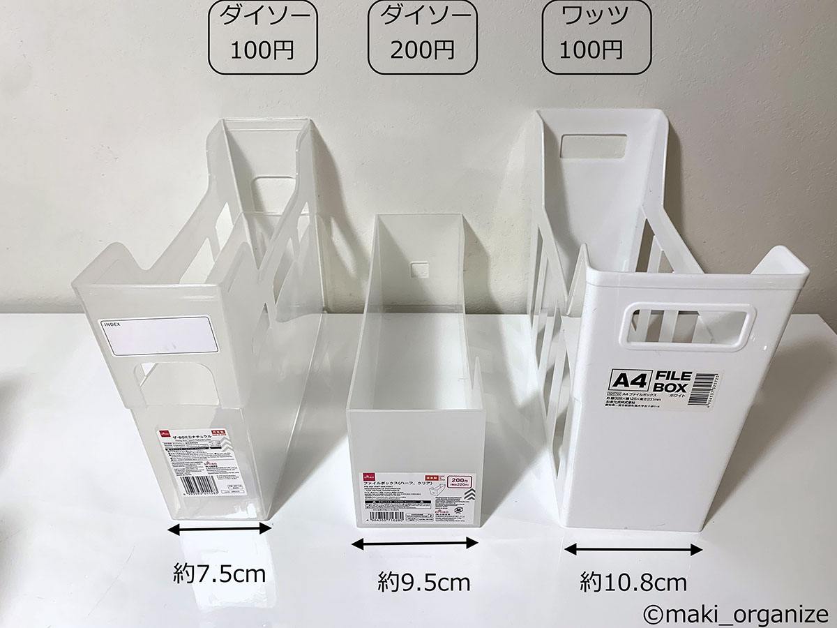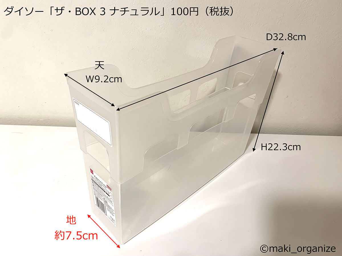 サイゾーウーマン暮らし住まい【ダイソー】ファイルBOXで調味料収納 暮らし [連載]女たちの「煩悩部屋」ビフォーアフター 【ダイソー】キッチンの調味料、収納アイテムはコレ! プロが使うファイルボックスとは? 2024/03/27 17:00 伊藤まき(収納ライター) 「汚部屋」ビフォーアフター 整理収納アドバイザーの伊藤まきさんが、片付けに悩む読者の自宅を使いやすく生まれ変わらせる連載シリーズ【「煩悩部屋」ビフォーアフター】。 連載企画『ビフォーアフター』新シーズンです。第8回目の片付けモニターは、江東区・3LDKのマンションで暮らす4人家族のKさん(35歳)。今回は、汚部屋の片付けではなく、都心のマンションに多い「狭い収納」を使いやすく手直しする特別編です。 目次 ・キッチン収納はStandard Products「PPファイルボックス」がおすすめ ・調味料のボトルは「8cm以内」が多い ・調味料ボトル収納Before→After ・水筒収納Before→After ・【ダイソー】「ザ・BOX 3 ナチュラル」もおすすめ 前回に続き、今回もキッチンのお悩みを解決。ダイソーブランドのStandard Products「PPファイルボックス」、ワッツ「A4 ファイルボックス」を活用し、調味料や水筒などボトル類の収納を手直ししました。ビフォーアフターと「ファイルボックス」選びのポイント、使い方をくわしく解説していきます。 【ファイルボックスの選び方】ボトル収納は「スリムサイズ」が正解! Standard Products「PPファイルボックス」の幅8cmタイプが◎(C)maki_organize キッチンと洗面台に多い深型の引き出し収納には「10cm未満のスリムなファイルボックス」をおすすめします。今回は330円(税込、以下同)のStandard Products「PPファイルボックス」を中心に使いますが、予算を抑えたい場合はダイソー「ザ・BOX 3 ナチュラル」110円がおすすめ! 1/3の価格で収まるのでリーズナブルです。 左端がダイソー「ザ・BOX 3 ナチュラル」。底面のサイズは筆者が測った非公式サイズです(C)maki_organize Standard Products「PPファイルボックス」のほかに使える100均の「ファイルボックス」です。収納力を増やすポイントは「底面の横幅サイズ」が小さいものを選ぶこと。例えば、写真左のダイソーと右のワッツでは「約3.3cm」もの差が。底面サイズを覚えておくと、限られた空間も有効的に使うことができます。 左から詳細になります。 ・ダイソー「ザ・BOX 3 ナチュラル」110円 品番:4993593011583/公式サイズ:W9.2×D32.8×H22.3cm ・ダイソー「ファイルボックス(ハーフ)」220円 品番:4984355715917/公式サイズ:W9.5×D32.2cm×H12.2cm ・ワッツ「A4 ファイルボックス」110円 品番:054757/公式サイズ:W12.5×D32.8×H23.1cm 【ボトルのサイズ】調味料のボトルは「8cm以内」が多い 一般的なキッチンに多い、基本的な調味料ボトル(C)maki_organize 6種類のボトルを用意し、サイズを計測してみました。結果は以下の通り。家庭で使う調味料の多くは女性が片手で持ち運べるサイズ(500〜800mL)が多いそうです。 *写真左から【ボトルの底面横幅サイズ】です ・油(約1.6L)=約10.5cm ・水(2L)=約10.5cm ・醤油(1L)=約8cm ・ぽん酢(800mL)=約7.5cm ・酢(500mL)=約7.5cm ・牛乳パック(500mL)=約7cm それでは、これらの調味料を先ほどのファイルボックスに収納してみましょう。 【検証】100均ファイルボックス3種に調味料を収納 (C)maki_organize 調味料ボトルと牛乳パックを、ダイソーとワッツの3種のファイルボックスに入れてみました。1L以内のボトルはすべて写真左「底面サイズ約7.5cm」のボックスにぴったりです。このようにサイズをきっちりマッチングさせることで、収納力がアップし横倒れも防げます。 それではいよいよファイルボックスを活用し、Kさん宅のボトル収納を手直ししていきます。 ボトル収納【Before】「ボトル」と「収納ボックス」のサイズが合っていない (Before)「液漏れ&目的の調味料が探しにくい」お悩みが(C)maki_organize 収納ボックス内に余白があります。ボトルが横に倒れて液漏れすることも多いそう。調味料の住所も変わりやすいので、探す手間も生まれます。 ボトル収納【After】Standard Products「PPファイルボックス」が正解! (After)袋入り調味料はWクリップでラベリング(C)maki_organize 使用していたボックスの横幅サイズが13cmと大きかったため、8cmのStandard Products「PPファイルボックス」と、9.5cmのダイソー「ファイルボックス(ハーフ)」に入れ替えました。 顆粒スティックなどの小さな調味料は余ったコップに入れて固定しています。これで、調味料ボトルの「横倒れによる液漏れ」問題が解決! さらに収納力もアップしたので、調味料を探すロスタイムがなくなりました。 水筒収納【Before】モノが積み重なって水筒が取り出しにくい (Before)種類が違う小物を詰め込み過ぎ(C)maki_organize ダイソー「Coloristボックスロング(横幅12.7cm)」を使って水筒や小物類を収納していました。こちらの商品は100均のファイルボックスの中でもいちばん奥行きがあるため「洗面台の収納」の方が向いています。今回はお菓子収納の仕切りボックスに再利用。 【After】8cmのファイ