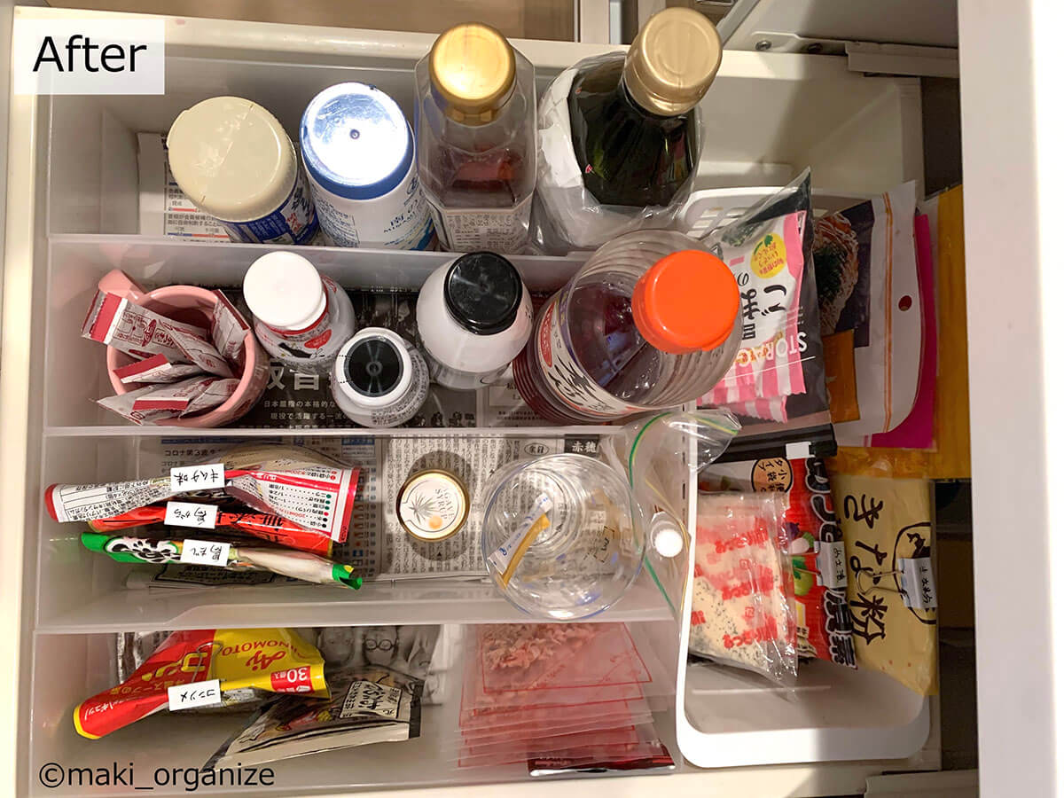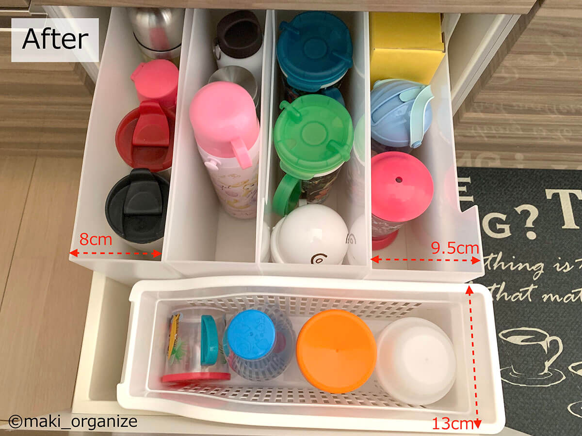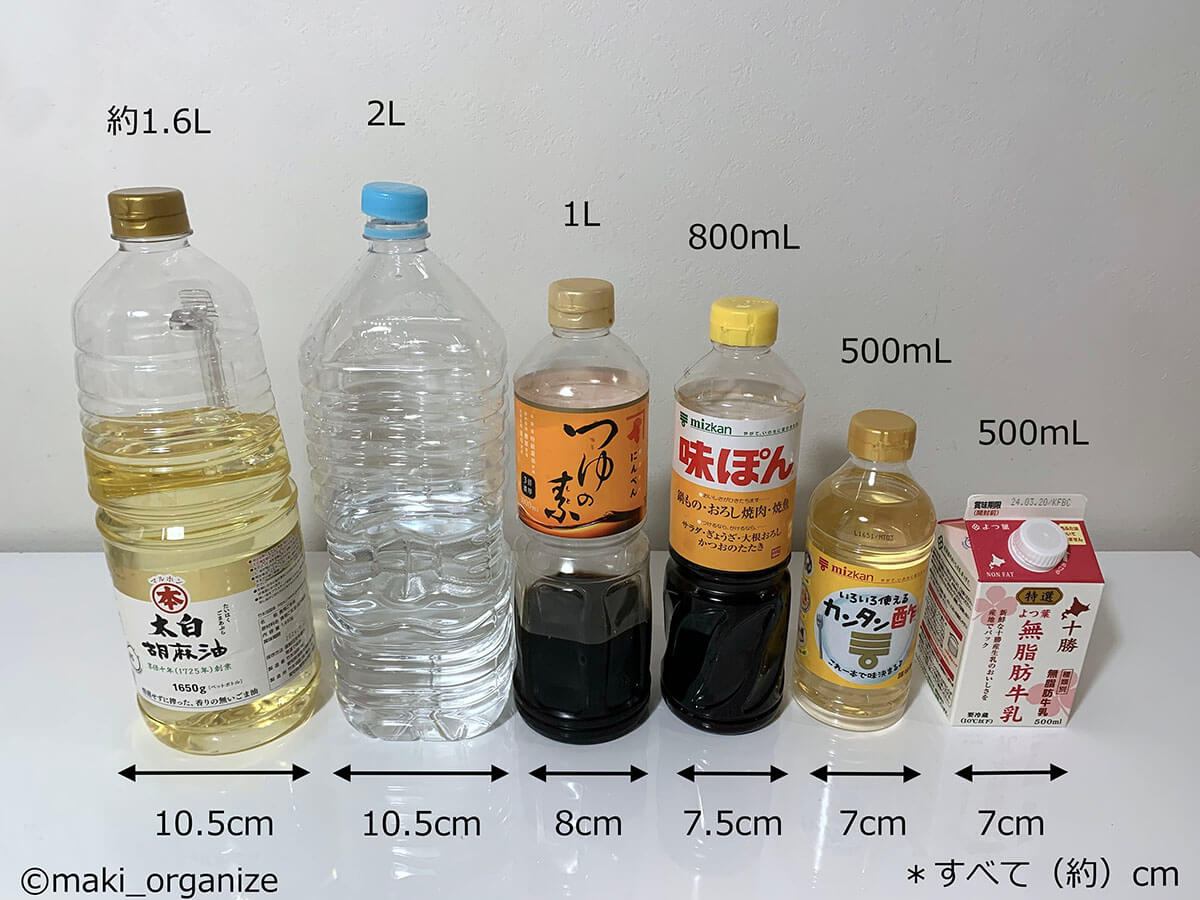 サイゾーウーマン暮らし住まい【ダイソー】ファイルBOXで調味料収納 暮らし [連載]女たちの「煩悩部屋」ビフォーアフター 【ダイソー】キッチンの調味料、収納アイテムはコレ! プロが使うファイルボックスとは? 2024/03/27 17:00 伊藤まき(収納ライター) 「汚部屋」ビフォーアフター 整理収納アドバイザーの伊藤まきさんが、片付けに悩む読者の自宅を使いやすく生まれ変わらせる連載シリーズ【「煩悩部屋」ビフォーアフター】。 連載企画『ビフォーアフター』新シーズンです。第8回目の片付けモニターは、江東区・3LDKのマンションで暮らす4人家族のKさん(35歳)。今回は、汚部屋の片付けではなく、都心のマンションに多い「狭い収納」を使いやすく手直しする特別編です。 目次 ・キッチン収納はStandard Products「PPファイルボックス」がおすすめ ・調味料のボトルは「8cm以内」が多い ・調味料ボトル収納Before→After ・水筒収納Before→After ・【ダイソー】「ザ・BOX 3 ナチュラル」もおすすめ 前回に続き、今回もキッチンのお悩みを解決。ダイソーブランドのStandard Products「PPファイルボックス」、ワッツ「A4 ファイルボックス」を活用し、調味料や水筒などボトル類の収納を手直ししました。ビフォーアフターと「ファイルボックス」選びのポイント、使い方をくわしく解説していきます。 【ファイルボックスの選び方】ボトル収納は「スリムサイズ」が正解! Standard Products「PPファイルボックス」の幅8cmタイプが◎(C)maki_organize キッチンと洗面台に多い深型の引き出し収納には「10cm未満のスリムなファイルボックス」をおすすめします。今回は330円(税込、以下同)のStandard Products「PPファイルボックス」を中心に使いますが、予算を抑えたい場合はダイソー「ザ・BOX 3 ナチュラル」110円がおすすめ! 1/3の価格で収まるのでリーズナブルです。 左端がダイソー「ザ・BOX 3 ナチュラル」。底面のサイズは筆者が測った非公式サイズです(C)maki_organize Standard Products「PPファイルボックス」のほかに使える100均の「ファイルボックス」です。収納力を増やすポイントは「底面の横幅サイズ」が小さいものを選ぶこと。例えば、写真左のダイソーと右のワッツでは「約3.3cm」もの差が。底面サイズを覚えておくと、限られた空間も有効的に使うことができます。 左から詳細になります。 ・ダイソー「ザ・BOX 3 ナチュラル」110円 品番:4993593011583/公式サイズ:W9.2×D32.8×H22.3cm ・ダイソー「ファイルボックス(ハーフ)」220円 品番:4984355715917/公式サイズ:W9.5×D32.2cm×H12.2cm ・ワッツ「A4 ファイルボックス」110円 品番:054757/公式サイズ:W12.5×D32.8×H23.1cm 【ボトルのサイズ】調味料のボトルは「8cm以内」が多い 一般的なキッチンに多い、基本的な調味料ボトル(C)maki_organize 6種類のボトルを用意し、サイズを計測してみました。結果は以下の通り。家庭で使う調味料の多くは女性が片手で持ち運べるサイズ(500〜800mL)が多いそうです。 *写真左から【ボトルの底面横幅サイズ】です ・油(約1.6L)=約10.5cm ・水(2L)=約10.5cm ・醤油(1L)=約8cm ・ぽん酢(800mL)=約7.5cm ・酢(500mL)=約7.5cm ・牛乳パック(500mL)=約7cm それでは、これらの調味料を先ほどのファイルボックスに収納してみましょう。 【検証】100均ファイルボックス3種に調味料を収納 (C)maki_organize 調味料ボトルと牛乳パックを、ダイソーとワッツの3種のファイルボックスに入れてみました。1L以内のボトルはすべて写真左「底面サイズ約7.5cm」のボックスにぴったりです。このようにサイズをきっちりマッチングさせることで、収納力がアップし横倒れも防げます。 それではいよいよファイルボックスを活用し、Kさん宅のボトル収納を手直ししていきます。 ボトル収納【Before】「ボトル」と「収納ボックス」のサイズが合っていない (Before)「液漏れ&目的の調味料が探しにくい」お悩みが(C)maki_organize 収納ボックス内に余白があります。ボトルが横に倒れて液漏れすることも多いそう。調味料の住所も変わりやすいので、探す手間も生まれます。 ボトル収納【After】Standard Products「PPファイルボックス」が正解! (After)袋入り調味料はWクリップでラベリング(C)maki_organize 使用していたボックスの横幅サイズが13cmと大きかったため、8cmのStandard Products「PPファイルボックス」と、9.5cmのダイソー「ファイルボックス(ハーフ)」に入れ替えました。 顆粒スティックなどの小さな調味料は余ったコップに入れて固定しています。これで、調味料ボトルの「横倒れによる液漏れ」問題が解決! さらに収納力もアップしたので、調味料を探すロスタイムがなくなりました。 水筒収納【Before】モノが積み重なって水筒が取り出しにくい (Before)種類が違う小物を詰め込み過ぎ(C)maki_organize ダイソー「Coloristボックスロング(横幅12.7cm)」を使って水筒や小物類を収納していました。こちらの商品は100均のファイルボックスの中でもいちばん奥行きがあるため「洗面台の収納」の方が向いています。今回はお菓子収納の仕切りボックスに再利用。 【After】8cmのファイ