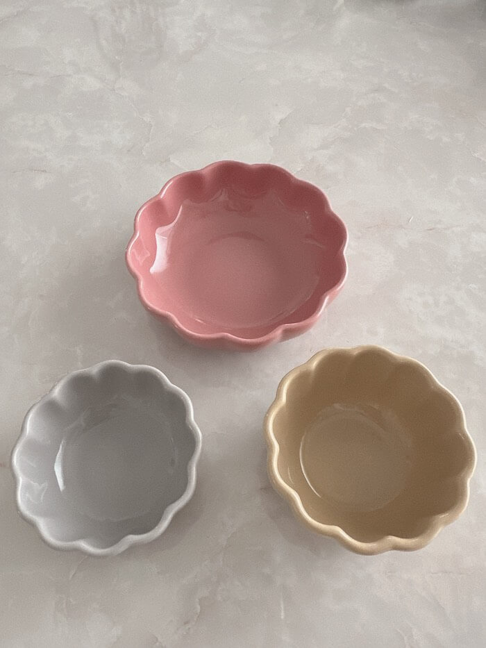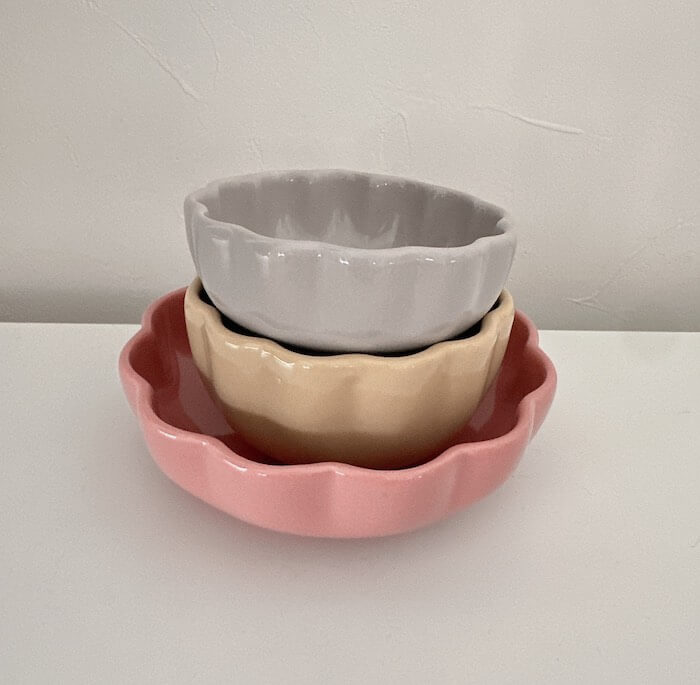 春を感じさせる桜色のお皿がありました。くすみカラーはトレンドで、この色は今っぽいですね。ちなみに、トレンドに関しては色の質感がテカテカとマットのどちらでもOK。そこは関係ないです。
