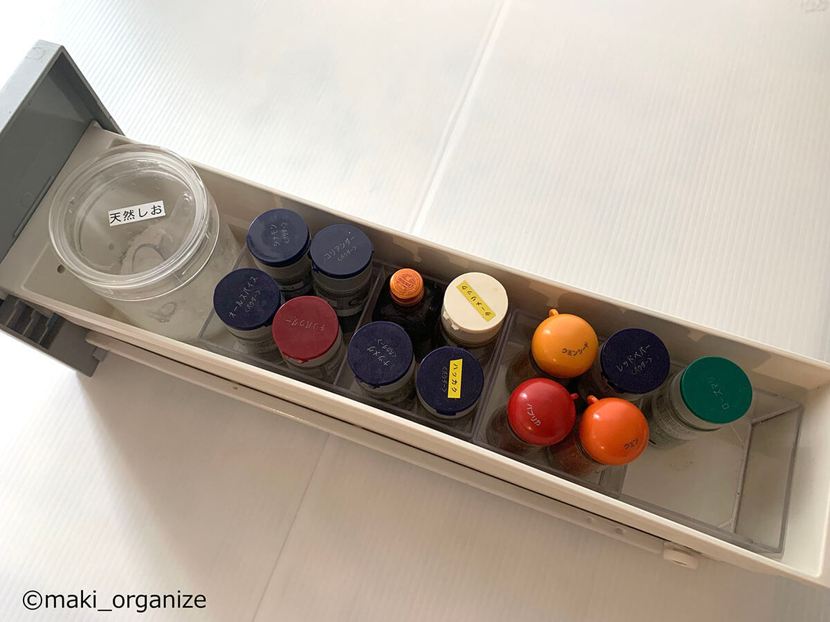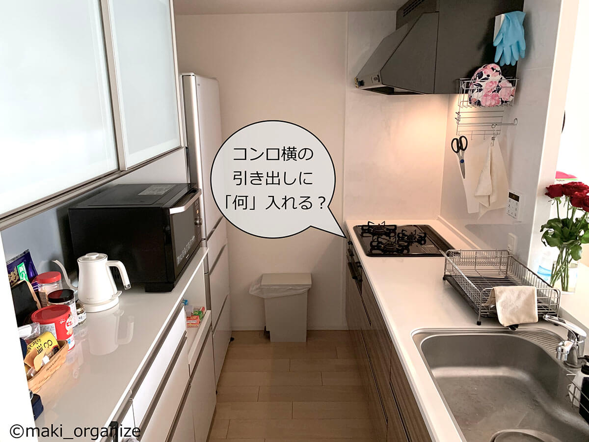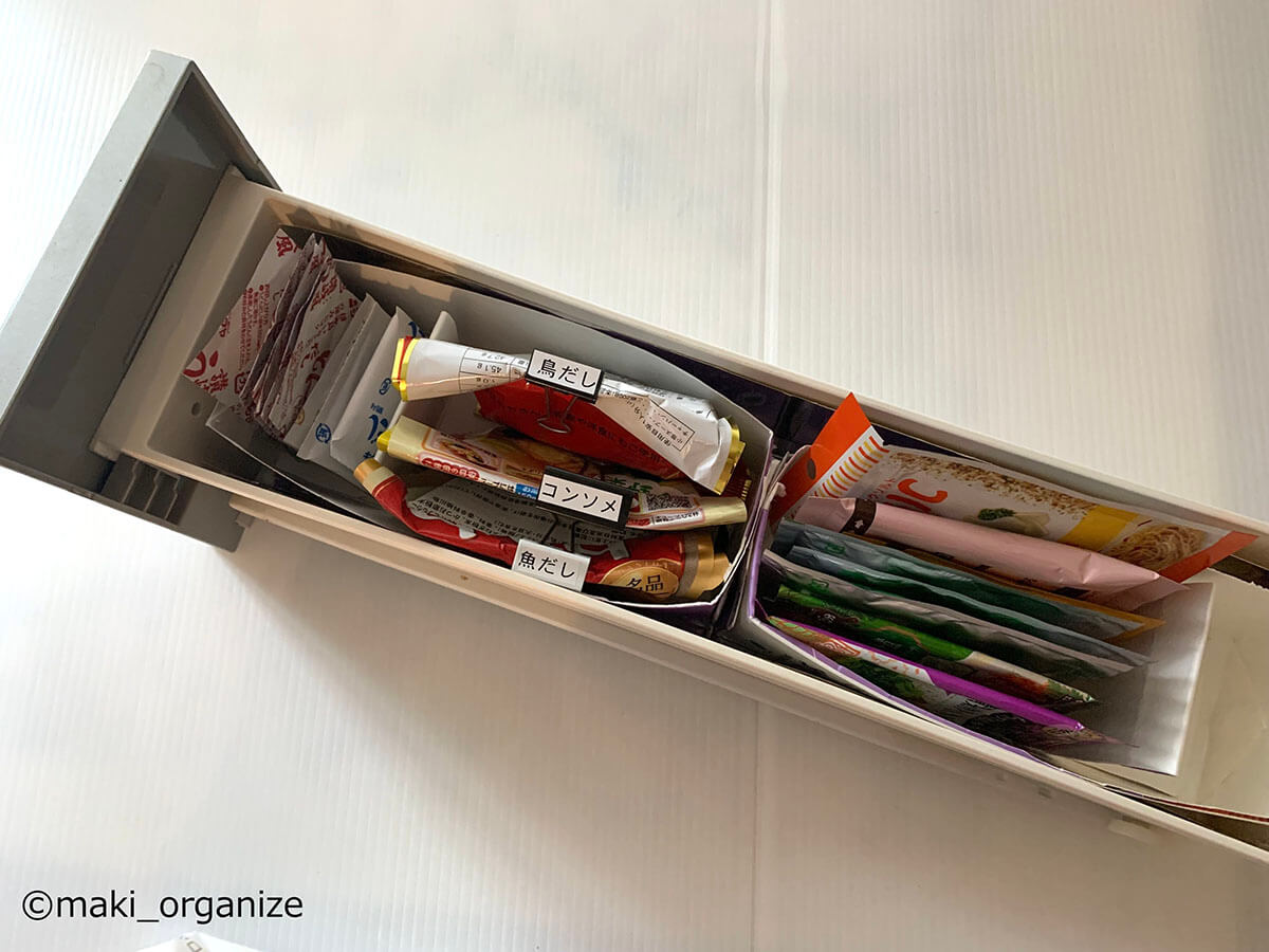 サイゾーウーマン暮らし住まい【コンロ横引き出し】プロの収納テク6 暮らし [連載]女たちの「煩悩部屋」ビフォーアフター コンロ横引き出し、調味料入れるのはNG? 家事がラクになる収納テク6 2024/04/10 17:00 伊藤まき(収納ライター) 「汚部屋」ビフォーアフター 整理収納アドバイザーの伊藤まきさんが、片付けに悩む読者の自宅を使いやすく生まれ変わらせる連載シリーズ【「煩悩部屋」ビフォーアフター】。 連載企画『ビフォーアフター』新シーズンです。第8回目の片付けモニターは、江東区・3LDKのマンションで暮らす4人家族のKさん(35歳)。今回は、汚部屋の片付けではなく、都心のマンションに多い「狭い収納」を使いやすく手直しする特別編です。 目次 ・【コンロ横引出し】Before→After ・【コンロ横引出し収納実例1】油掃除グッズ ・【コンロ横引出し収納実例2】キッチンツール ・【コンロ横引出し収納実例3】だし・コンソメ類 ・牛乳パックの仕切りケースの作り方 ・【コンロ横引出し収納実例4】個包装食品 ・【コンロ横引出し収納実例5】スパイス・ハーブ ・スパイス瓶が倒れない仕切りケース ・【コンロ横引出し収納実例6】乾燥食材 (C)maki_organize みなさんは「コンロ横の引き出し」に何を入れていますか? おそらく「調味料」が多いと思いますが、実はソレ「NG」なんだそう。でも使い勝手や調理動線を考えると、現実的にはいちばん置きたいモノですよね。 そこで今回はKさんと筆者宅の引き出しを例に、収納に向いているアイテムや調味料を入れるときのポイントなどをくわしく解説していきます。 【コンロ横引出しBefore】何を入れるのが正解? Kさん宅の「コンロ横引き出し」(W約7cm)(C)maki_organize コンロ横の引き出しは、消防法によりコンロと壁を15cm以上離すために生まれたスペースを有効活用したもの。キッチンメーカーは基本的に「食材以外」の収納を推奨しています。「高温多湿」になりやすいため、収納するなら「キッチン小物」や「掃除グッズ」がおすすめです。 【コンロ横引出しAfter】爪楊枝やストックなどキッチン小物を収納 (C)maki_organize Kさん宅ではもともと爪楊枝や竹串を入れていたので、これまでの習慣をキープすることに。加えてカトラリーのストックも追加しました。 次からは筆者宅の引き出し(W約9.5cm)を例に、「収納すると良いモノ」の実例や調味料を入れるときの注意点などをご紹介します。 【コンロ横引出し収納実例1】コンロまわりの「油掃除グッズ」 使用頻度の高いお掃除シートを手前に(C)maki_organize 拭き掃除シート、油処理剤、焦げ取りスポンジなど「油の掃除に関する小物」をまとめて収納したパターンです。サッと取り出して使えるので、こまめにキレイをキープできます。 【コンロ横引出し収納実例2】毎日使う「1軍のキッチンツール」 7種のキッチンツールが入っています(C)maki_organize キッチンツールの収納例です。あれもこれも入れると、ワンアクションで取り出せずストレスになるため、使用頻度の高い「1軍」だけに絞りました。出しっぱなし収納に比べ、油で汚れない点もメリットです。 でも、実際のところ「調理中の動線」を最優先に考えると、調味料を入れるのがいちばん便利ですよね。そこで次からは、調味料を収納する場合の注意点やポイントを紹介していきます。 【コンロ横引出し収納実例3】だしやコンソメ類をタテ入れ収納 いちばん奥は忘れやすいので、無理に入れなくてもOK(C)maki_organize コンロ横の引き出しは細長いので、調味料をそのまま入れると横倒れしたり、奥の方で迷子になりやすいです。そこで便利なのが、牛乳パックを活用した「仕切りケース」。これを使えば、調味料の「タテ入れ収納」が可能に。埋もれないので、目的のモノをすぐに見つけることができます。 ちなみに調味料の袋はほとんどが「アルミ製」。遮光性や防湿性、ガスバリア性が高いため、詰め替えせずにそのまま使うのがおすすめです。開封後は空気を抜いてからWクリップで密閉しましょう。 【牛乳パックの仕切りケース(W7cm)の作り方】 ハサミで切るだけなので、サイズ調整もしやすい(C)maki_organize 牛乳パックを活用した「仕切りケース」。くわしい作り方は以下のこちらの動画で紹介しています。 【コンロ横引出し収納実例4】個包装タイプの食べきり食品を入れても◎ 仕切り板はパック上部のカットした部分を使います(C)maki_organize 牛乳パックの「仕切りケース」は粉末スープや味噌汁の素など、食べきり食品の収納にもおすすめ! 毎日の食習慣に合わせ、使用頻度の高いものを入れておくと、サッと取り出せて便利です。 【コンロ横引出し収納実例5】スパイスやハーブを見える化収納 塩入れは、セラーメイト「チャーミークリアー」 420mL(W8.4cm)(C)maki_organize コンロ横の引き出しは高温多湿なスペース。スパイスやハーブ類を収納する場合は、固まりやすくなるため、元の瓶に「詰め替えない」よう注意したいところです。ちなみに、スパイスを湯気の上から振