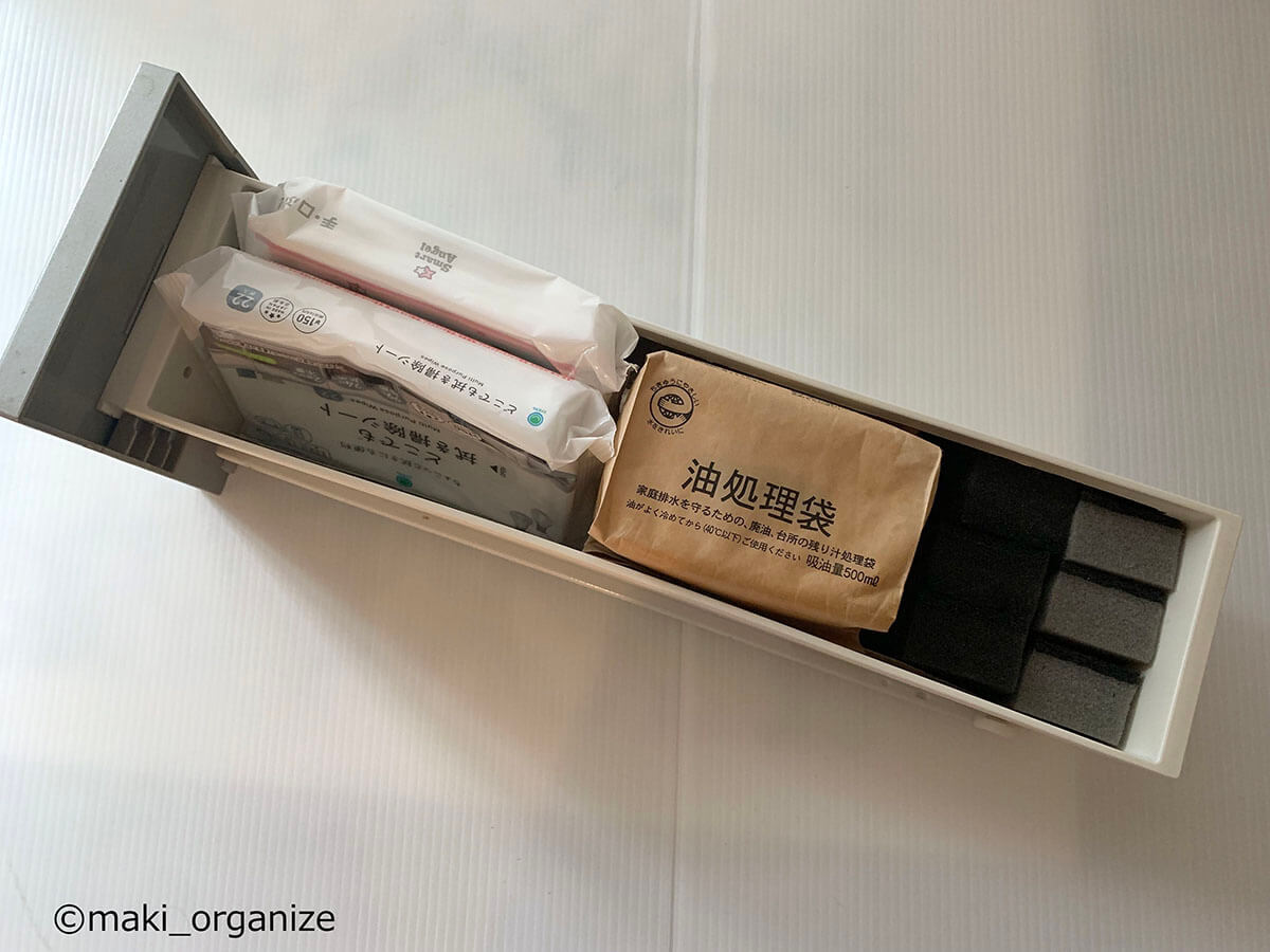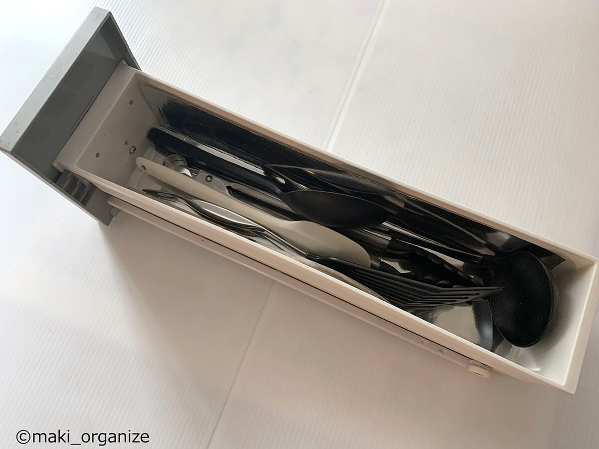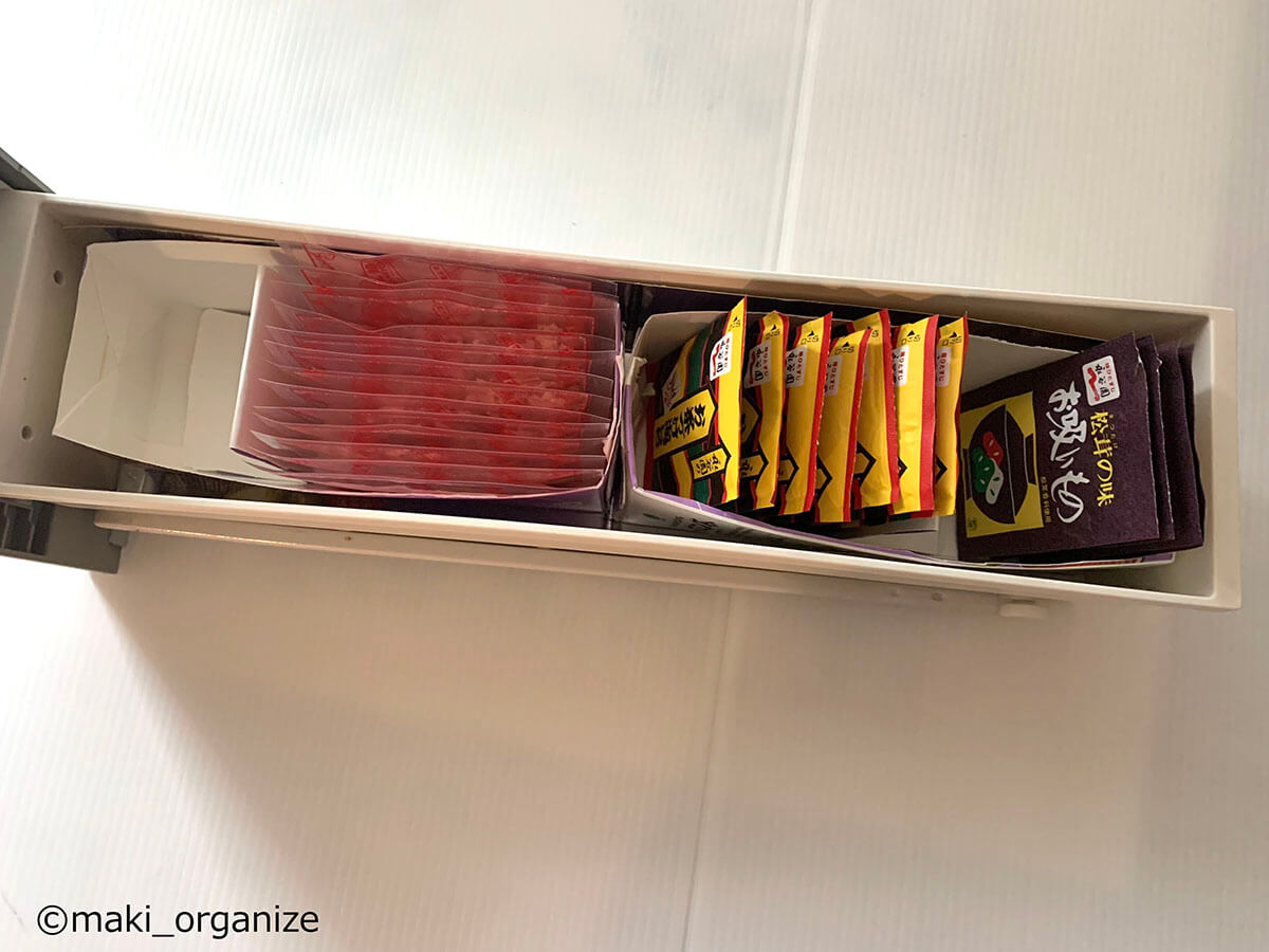 サイゾーウーマン暮らし住まい【コンロ横引き出し】プロの収納テク6 暮らし [連載]女たちの「煩悩部屋」ビフォーアフター コンロ横引き出し、調味料入れるのはNG? 家事がラクになる収納テク6 2024/04/10 17:00 伊藤まき(収納ライター) 「汚部屋」ビフォーアフター 整理収納アドバイザーの伊藤まきさんが、片付けに悩む読者の自宅を使いやすく生まれ変わらせる連載シリーズ【「煩悩部屋」ビフォーアフター】。 連載企画『ビフォーアフター』新シーズンです。第8回目の片付けモニターは、江東区・3LDKのマンションで暮らす4人家族のKさん(35歳)。今回は、汚部屋の片付けではなく、都心のマンションに多い「狭い収納」を使いやすく手直しする特別編です。 目次 ・【コンロ横引出し】Before→After ・【コンロ横引出し収納実例1】油掃除グッズ ・【コンロ横引出し収納実例2】キッチンツール ・【コンロ横引出し収納実例3】だし・コンソメ類 ・牛乳パックの仕切りケースの作り方 ・【コンロ横引出し収納実例4】個包装食品 ・【コンロ横引出し収納実例5】スパイス・ハーブ ・スパイス瓶が倒れない仕切りケース ・【コンロ横引出し収納実例6】乾燥食材 (C)maki_organize みなさんは「コンロ横の引き出し」に何を入れていますか? おそらく「調味料」が多いと思いますが、実はソレ「NG」なんだそう。でも使い勝手や調理動線を考えると、現実的にはいちばん置きたいモノですよね。 そこで今回はKさんと筆者宅の引き出しを例に、収納に向いているアイテムや調味料を入れるときのポイントなどをくわしく解説していきます。 【コンロ横引出しBefore】何を入れるのが正解? Kさん宅の「コンロ横引き出し」(W約7cm)(C)maki_organize コンロ横の引き出しは、消防法によりコンロと壁を15cm以上離すために生まれたスペースを有効活用したもの。キッチンメーカーは基本的に「食材以外」の収納を推奨しています。「高温多湿」になりやすいため、収納するなら「キッチン小物」や「掃除グッズ」がおすすめです。 【コンロ横引出しAfter】爪楊枝やストックなどキッチン小物を収納 (C)maki_organize Kさん宅ではもともと爪楊枝や竹串を入れていたので、これまでの習慣をキープすることに。加えてカトラリーのストックも追加しました。 次からは筆者宅の引き出し(W約9.5cm)を例に、「収納すると良いモノ」の実例や調味料を入れるときの注意点などをご紹介します。 【コンロ横引出し収納実例1】コンロまわりの「油掃除グッズ」 使用頻度の高いお掃除シートを手前に(C)maki_organize 拭き掃除シート、油処理剤、焦げ取りスポンジなど「油の掃除に関する小物」をまとめて収納したパターンです。サッと取り出して使えるので、こまめにキレイをキープできます。 【コンロ横引出し収納実例2】毎日使う「1軍のキッチンツール」 7種のキッチンツールが入っています(C)maki_organize キッチンツールの収納例です。あれもこれも入れると、ワンアクションで取り出せずストレスになるため、使用頻度の高い「1軍」だけに絞りました。出しっぱなし収納に比べ、油で汚れない点もメリットです。 でも、実際のところ「調理中の動線」を最優先に考えると、調味料を入れるのがいちばん便利ですよね。そこで次からは、調味料を収納する場合の注意点やポイントを紹介していきます。 【コンロ横引出し収納実例3】だしやコンソメ類をタテ入れ収納 いちばん奥は忘れやすいので、無理に入れなくてもOK(C)maki_organize コンロ横の引き出しは細長いので、調味料をそのまま入れると横倒れしたり、奥の方で迷子になりやすいです。そこで便利なのが、牛乳パックを活用した「仕切りケース」。これを使えば、調味料の「タテ入れ収納」が可能に。埋もれないので、目的のモノをすぐに見つけることができます。 ちなみに調味料の袋はほとんどが「アルミ製」。遮光性や防湿性、ガスバリア性が高いため、詰め替えせずにそのまま使うのがおすすめです。開封後は空気を抜いてからWクリップで密閉しましょう。 【牛乳パックの仕切りケース(W7cm)の作り方】 ハサミで切るだけなので、サイズ調整もしやすい(C)maki_organize 牛乳パックを活用した「仕切りケース」。くわしい作り方は以下のこちらの動画で紹介しています。 【コンロ横引出し収納実例4】個包装タイプの食べきり食品を入れても◎ 仕切り板はパック上部のカットした部分を使います(C)maki_organize 牛乳パックの「仕切りケース」は粉末スープや味噌汁の素など、食べきり食品の収納にもおすすめ! 毎日の食習慣に合わせ、使用頻度の高いものを入れておくと、サッと取り出せて便利です。 【コンロ横引出し収納実例5】スパイスやハーブを見える化収納 塩入れは、セラーメイト「チャーミークリアー」 420mL(W8.4cm)(C)maki_organize コンロ横の引き出しは高温多湿なスペース。スパイスやハーブ類を収納する場合は、固まりやすくなるため、元の瓶に「詰め替えない」よう注意したいところです。ちなみに、スパイスを湯気の上から振
