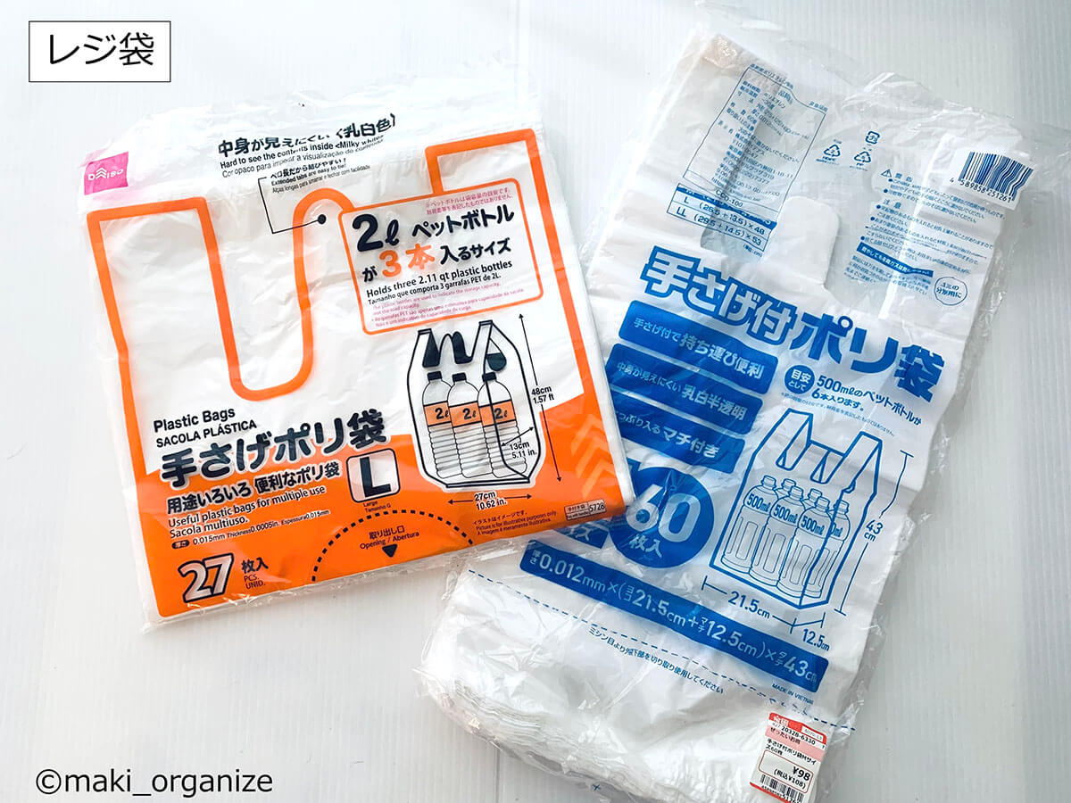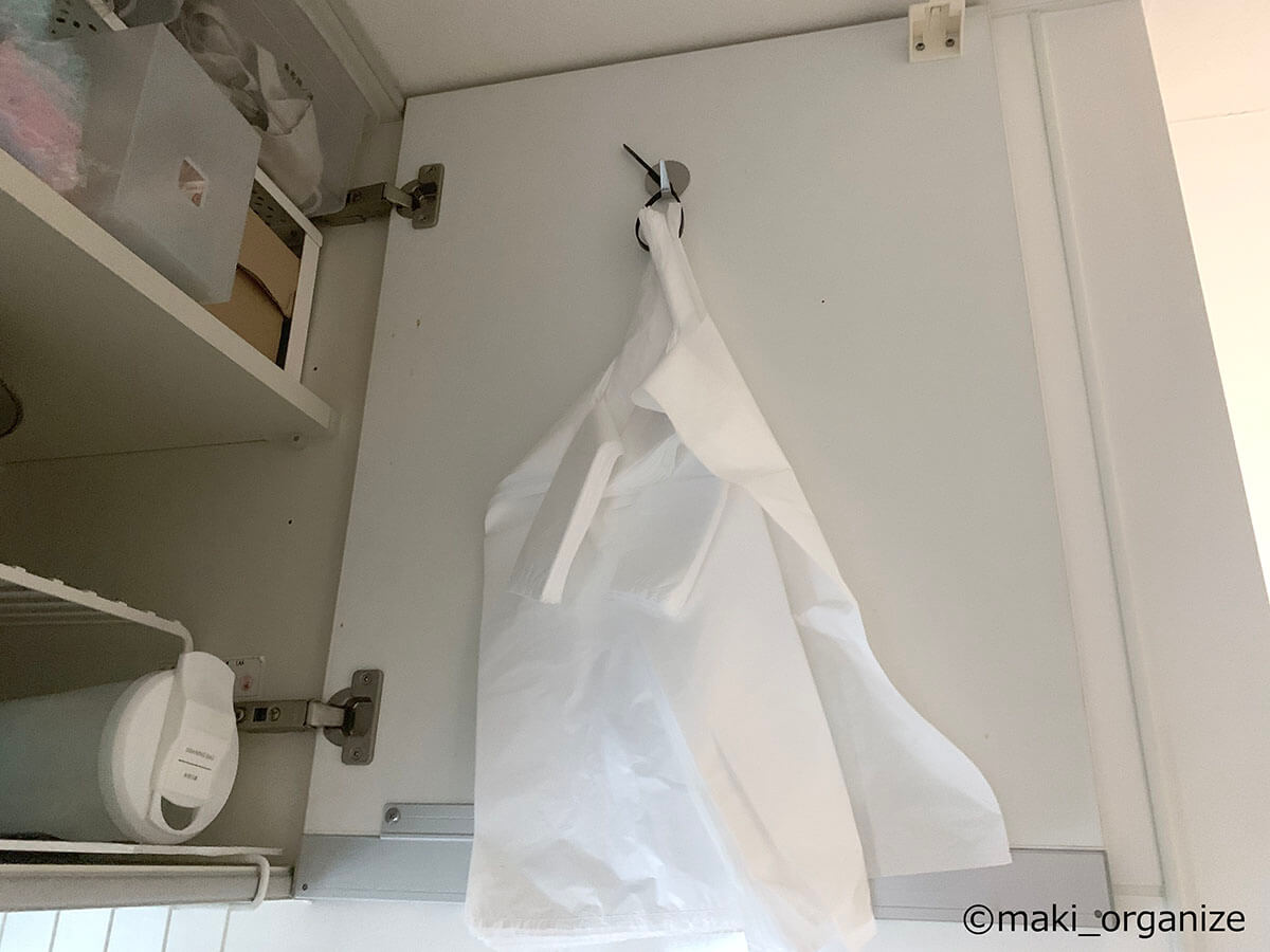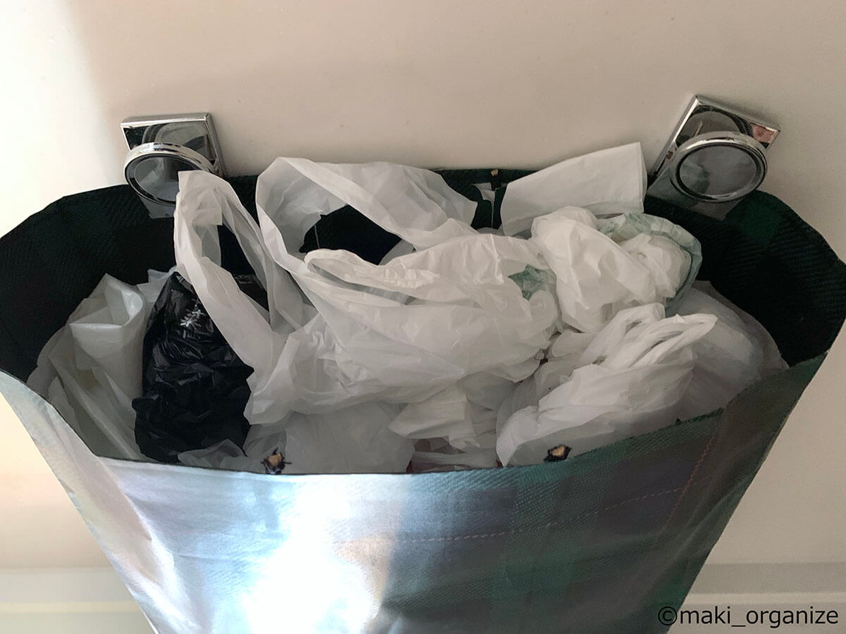 サイゾーウーマン暮らし住まい【レジ袋収納】プロのリピ買いグッズ 暮らし [連載]女たちの「煩悩部屋」ビフォーアフター レジ袋収納の裏技はコレ! プロがリピ買いする150円収納グッズとは? 2024/04/17 17:00 伊藤まき(収納ライター) 「汚部屋」ビフォーアフター 整理収納アドバイザーの伊藤まきさんが、片付けに悩む読者の自宅を使いやすく生まれ変わらせる連載シリーズ【「煩悩部屋」ビフォーアフター】。 連載企画『ビフォーアフター』新シーズンです。第8回目の片付けモニターは、江東区・3LDKのマンションで暮らす4人家族のKさん(35歳)。今回は、汚部屋の片付けではなく、都心のマンションに多い「狭い収納」を使いやすく手直しする特別編です。 目次 ・使用済みレジ袋収納Before→After ・SHEIN(シーイン)ビニール袋ホルダー ・セリアボックスティッシュケース ・新品レジ袋収納Before ・ワンアクションで出す工夫とは? ・新品レジ袋収納After 棚と冷蔵庫の間に詰め込まれたレジ袋&紙袋(C)maki_organize 毎日のように増えていく「レジ袋」。みなさんはどのように保管していますか? かさばって生活臭が出やすいうえに、出し入れで散らかりやすいのでストレスを感じますよね。 そこで今回は「使用済みのレジ袋」と「新品のレジ袋」2種類の保管方法をくわしく解説。「SHEIN(シーイン)」と「セリア」の商品を活用した、予算100〜250円で収まる「圧縮収納」アイデアもご紹介します。 【使用済みのレジ袋収納Before】紙袋を使うのは「NG収納」 有料なので捨てにくい(C)maki_organize 写真上はKさん宅の「使用済みのレジ袋」。紙袋をマグネットクリップで固定し、「投げ入れる方法」で収納していました。一見スッキリ見えますが、この方法は使っていくうちに「必ず乱れる」のでNGです。 【使用済みのレジ袋収納After】かさばるレジ袋は「圧縮収納」がベスト! 袋や箱の中に圧縮して入れるとコンパクトに!(C)maki_organize かさばる「使用済みのレジ袋」収納には、SHEIN(シーイン)「ビニール袋ホルダー」とセリア「ボックスティッシュケース」がイチオシ! 袋を詰め込んで「圧縮収納」すれば、スッキリまとめることができます。 【SHEIN(シーイン)ビニール袋ホルダー】「引っ掛け・吊り下げ」収納に◎ 筆者自身、何度もリピ買いするほどお気に入り!(C)maki_organize 「引っ掛け・吊り下げ」収納したい場合に最適なのが、SHEIN(シーイン)の「ビニール袋ホルダー」です。買ったばかりは写真左の状態ですが、中身を詰めると見栄えが良くなります。価格は150〜250円前後と安価なのもうれしいポイントです。 【セリアボックスティッシュケース】引き出し・棚など「置く」収納に◎ サイズ:約W25.5×D13×H7.5cm(C)maki_organize 引き出しや棚の中など「置く場所」に使いたい場合は、セリア「ボックスティッシュケース」110円(税込)が最適。白と黒の2色がありますが、レジ袋がよく見える「黒」を選ぶのがおすすめです。 【新品のレジ袋収納Before】かさばる&1枚だけを出しにくい ダイソー&激安店の手さげポリ袋。ストックしているお宅が増えています(C)maki_organize 写真はKさん宅にあった「新品のレジ袋」です。かさばるので収納スペースを奪うだけでなく、1枚だけ出すつもりが何枚も出てしまう……といったストレスも発生しがち。 そこで、スーパーなどで見かける吊るし型のポリ袋のように、ワンアクションで簡単に出せる「ひと工夫」をご紹介します。 【ワンアクションで出す工夫1】ドライバーセットの「キリ」で穴を開ける レジ袋の「ベロ部分」に穴を開けるだけ!(C)maki_organize 100均や激安店のレジ袋は「穴なし」が多いです。なので、レジ袋を封から出して、ドライバーセットなどに入っている「キリ」で穴を開けましょう。写真の●印(ベロ部分)あたりを狙ってください。 【ワンアクションで出す工夫2】かたさのある「金具・バンド」に通す 写真は「カードリング」を使用(C)maki_organize 穴を開けたら、家にある結束バンドやカードリング、S字フックに通します。扉の裏やラックなどに「吊るして」使うので、引っ張る力に負けないかたさが必要です。「スチールラックに引っ掛けたい」などの目的によって、結束に使うモノの選択が変わります。 【新品のレジ袋収納After】扉の裏に吊るして、コンパクトに保管できた! フックはダイソー「ステンレス丸タイプ フック」(C)maki_organize キッチンの吊り戸棚裏に、「結束バンド」でまとめた「新品のレジ袋」を引っ掛けてみました。片手で簡単に取り出せるのはもちろん、省スペースで保管できます。くわしい手順は動画でも解説しているので、ぜひチェックしてみてください。 コンロ横引き出し、調味料入れるのはNG? 家事がラクになる収納テク6整理収納アドバイザーの伊藤まきさんが、片付けに悩む読者の自宅を使いやすく生まれ変わらせる連載シリーズ【「煩悩部屋」ビフォーアフター】。 連載企画『ビフォーアフター』新シ...サイゾーウーマン2024.04.10 【ダイソー】水切りネットはウォーターポットに入