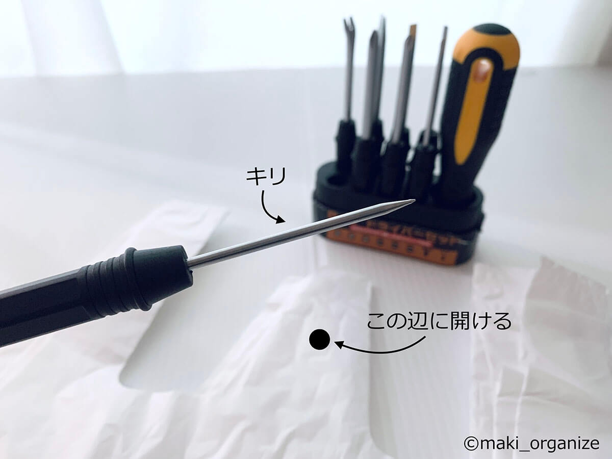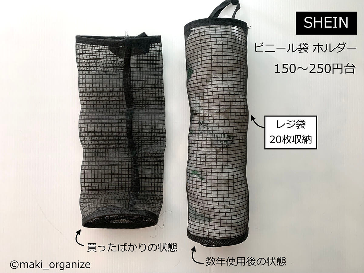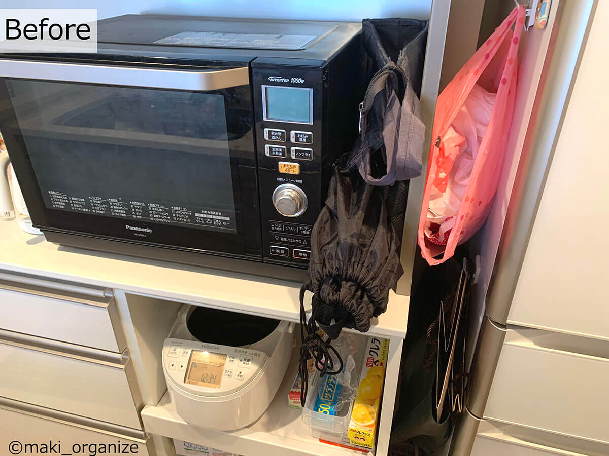 サイゾーウーマン暮らし住まい【レジ袋収納】プロのリピ買いグッズ 暮らし [連載]女たちの「煩悩部屋」ビフォーアフター レジ袋収納の裏技はコレ! プロがリピ買いする150円収納グッズとは? 2024/04/17 17:00 伊藤まき(収納ライター) 「汚部屋」ビフォーアフター 整理収納アドバイザーの伊藤まきさんが、片付けに悩む読者の自宅を使いやすく生まれ変わらせる連載シリーズ【「煩悩部屋」ビフォーアフター】。 連載企画『ビフォーアフター』新シーズンです。第8回目の片付けモニターは、江東区・3LDKのマンションで暮らす4人家族のKさん(35歳)。今回は、汚部屋の片付けではなく、都心のマンションに多い「狭い収納」を使いやすく手直しする特別編です。 目次 ・使用済みレジ袋収納Before→After ・SHEIN(シーイン)ビニール袋ホルダー ・セリアボックスティッシュケース ・新品レジ袋収納Before ・ワンアクションで出す工夫とは? ・新品レジ袋収納After 棚と冷蔵庫の間に詰め込まれたレジ袋&紙袋(C)maki_organize 毎日のように増えていく「レジ袋」。みなさんはどのように保管していますか? かさばって生活臭が出やすいうえに、出し入れで散らかりやすいのでストレスを感じますよね。 そこで今回は「使用済みのレジ袋」と「新品のレジ袋」2種類の保管方法をくわしく解説。「SHEIN(シーイン)」と「セリア」の商品を活用した、予算100〜250円で収まる「圧縮収納」アイデアもご紹介します。 【使用済みのレジ袋収納Before】紙袋を使うのは「NG収納」 有料なので捨てにくい(C)maki_organize 写真上はKさん宅の「使用済みのレジ袋」。紙袋をマグネットクリップで固定し、「投げ入れる方法」で収納していました。一見スッキリ見えますが、この方法は使っていくうちに「必ず乱れる」のでNGです。 【使用済みのレジ袋収納After】かさばるレジ袋は「圧縮収納」がベスト! 袋や箱の中に圧縮して入れるとコンパクトに!(C)maki_organize かさばる「使用済みのレジ袋」収納には、SHEIN(シーイン)「ビニール袋ホルダー」とセリア「ボックスティッシュケース」がイチオシ! 袋を詰め込んで「圧縮収納」すれば、スッキリまとめることができます。 【SHEIN(シーイン)ビニール袋ホルダー】「引っ掛け・吊り下げ」収納に◎ 筆者自身、何度もリピ買いするほどお気に入り!(C)maki_organize 「引っ掛け・吊り下げ」収納したい場合に最適なのが、SHEIN(シーイン)の「ビニール袋ホルダー」です。買ったばかりは写真左の状態ですが、中身を詰めると見栄えが良くなります。価格は150〜250円前後と安価なのもうれしいポイントです。 【セリアボックスティッシュケース】引き出し・棚など「置く」収納に◎ サイズ:約W25.5×D13×H7.5cm(C)maki_organize 引き出しや棚の中など「置く場所」に使いたい場合は、セリア「ボックスティッシュケース」110円(税込)が最適。白と黒の2色がありますが、レジ袋がよく見える「黒」を選ぶのがおすすめです。 【新品のレジ袋収納Before】かさばる&1枚だけを出しにくい ダイソー&激安店の手さげポリ袋。ストックしているお宅が増えています(C)maki_organize 写真はKさん宅にあった「新品のレジ袋」です。かさばるので収納スペースを奪うだけでなく、1枚だけ出すつもりが何枚も出てしまう……といったストレスも発生しがち。 そこで、スーパーなどで見かける吊るし型のポリ袋のように、ワンアクションで簡単に出せる「ひと工夫」をご紹介します。 【ワンアクションで出す工夫1】ドライバーセットの「キリ」で穴を開ける レジ袋の「ベロ部分」に穴を開けるだけ!(C)maki_organize 100均や激安店のレジ袋は「穴なし」が多いです。なので、レジ袋を封から出して、ドライバーセットなどに入っている「キリ」で穴を開けましょう。写真の●印(ベロ部分)あたりを狙ってください。 【ワンアクションで出す工夫2】かたさのある「金具・バンド」に通す 写真は「カードリング」を使用(C)maki_organize 穴を開けたら、家にある結束バンドやカードリング、S字フックに通します。扉の裏やラックなどに「吊るして」使うので、引っ張る力に負けないかたさが必要です。「スチールラックに引っ掛けたい」などの目的によって、結束に使うモノの選択が変わります。 【新品のレジ袋収納After】扉の裏に吊るして、コンパクトに保管できた! フックはダイソー「ステンレス丸タイプ フック」(C)maki_organize キッチンの吊り戸棚裏に、「結束バンド」でまとめた「新品のレジ袋」を引っ掛けてみました。片手で簡単に取り出せるのはもちろん、省スペースで保管できます。くわしい手順は動画でも解説しているので、ぜひチェックしてみてください。 コンロ横引き出し、調味料入れるのはNG? 家事がラクになる収納テク6整理収納アドバイザーの伊藤まきさんが、片付けに悩む読者の自宅を使いやすく生まれ変わらせる連載シリーズ【「煩悩部屋」ビフォーアフター】。 連載企画『ビフォーアフター』新シ...サイゾーウーマン2024.04.10 【ダイソー】水切りネットはウォーターポットに入