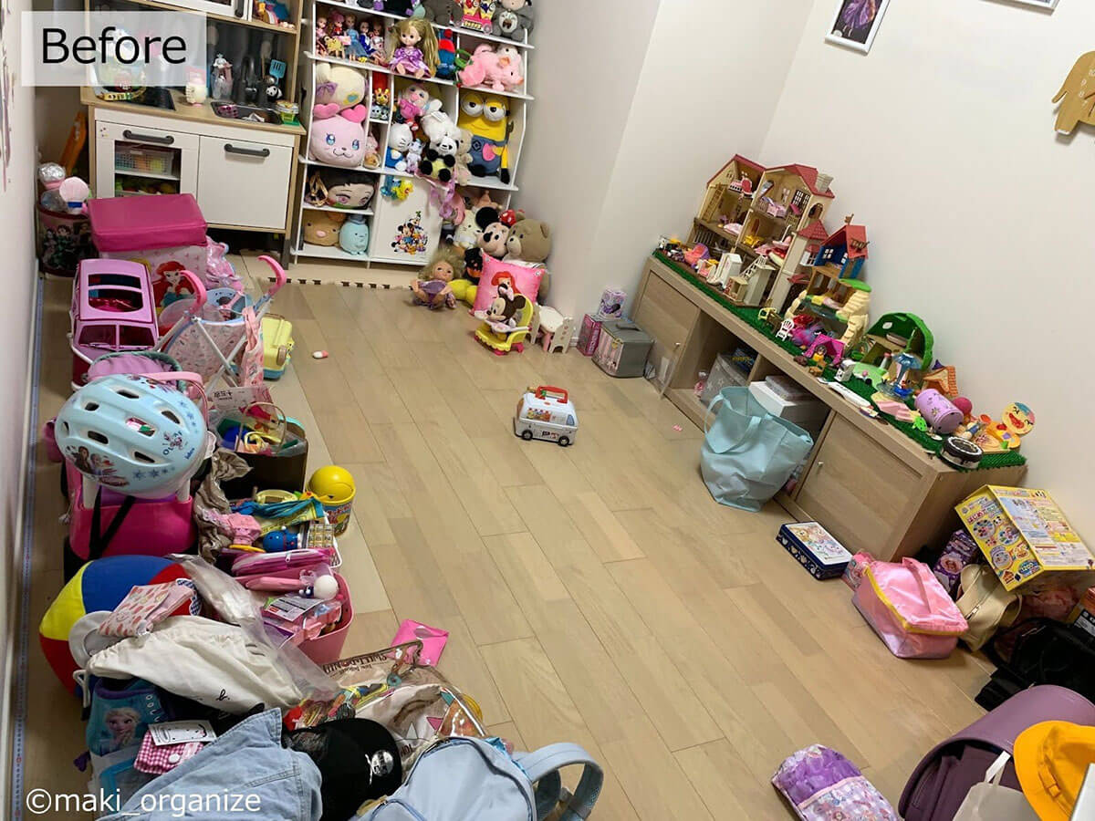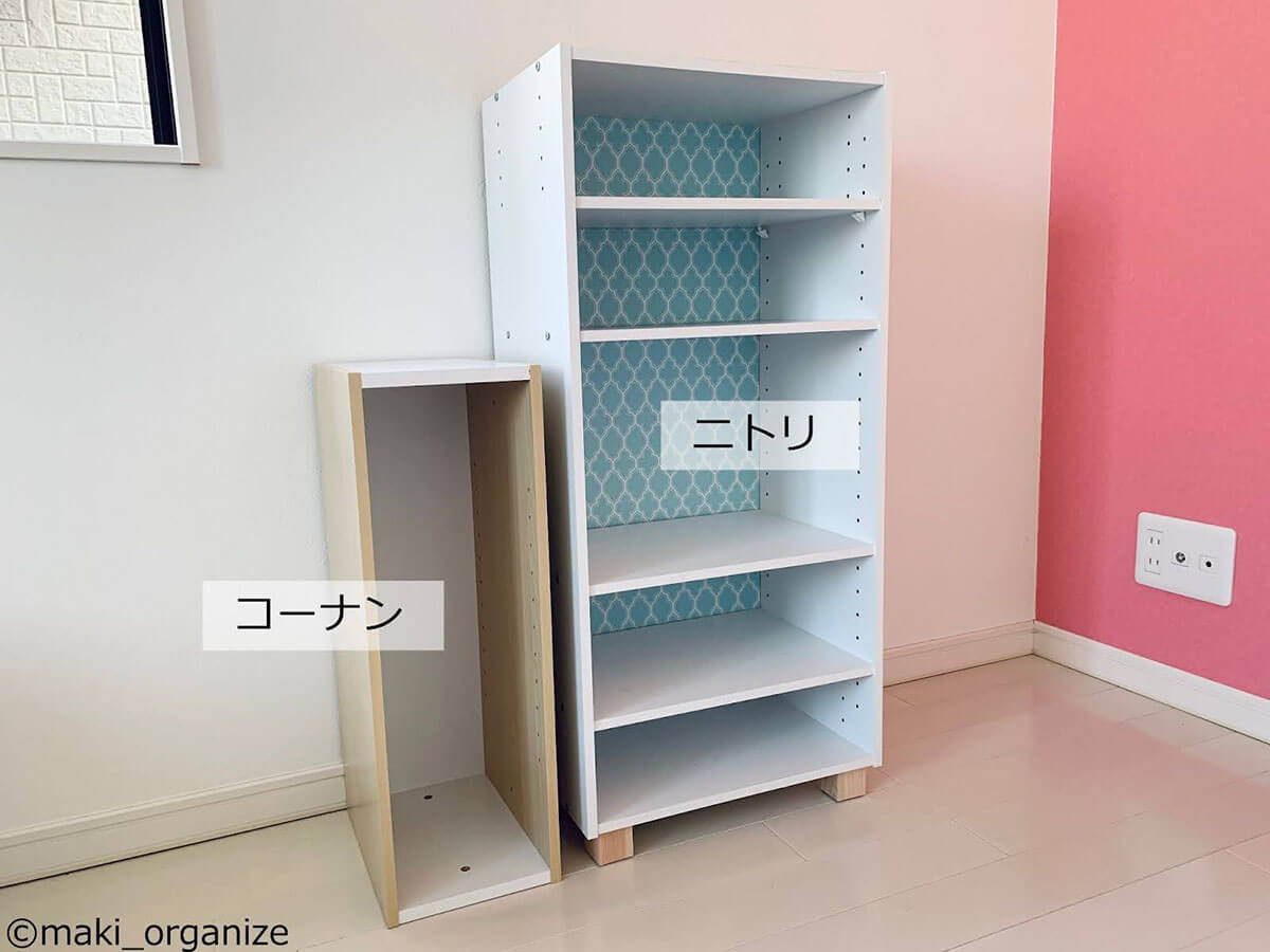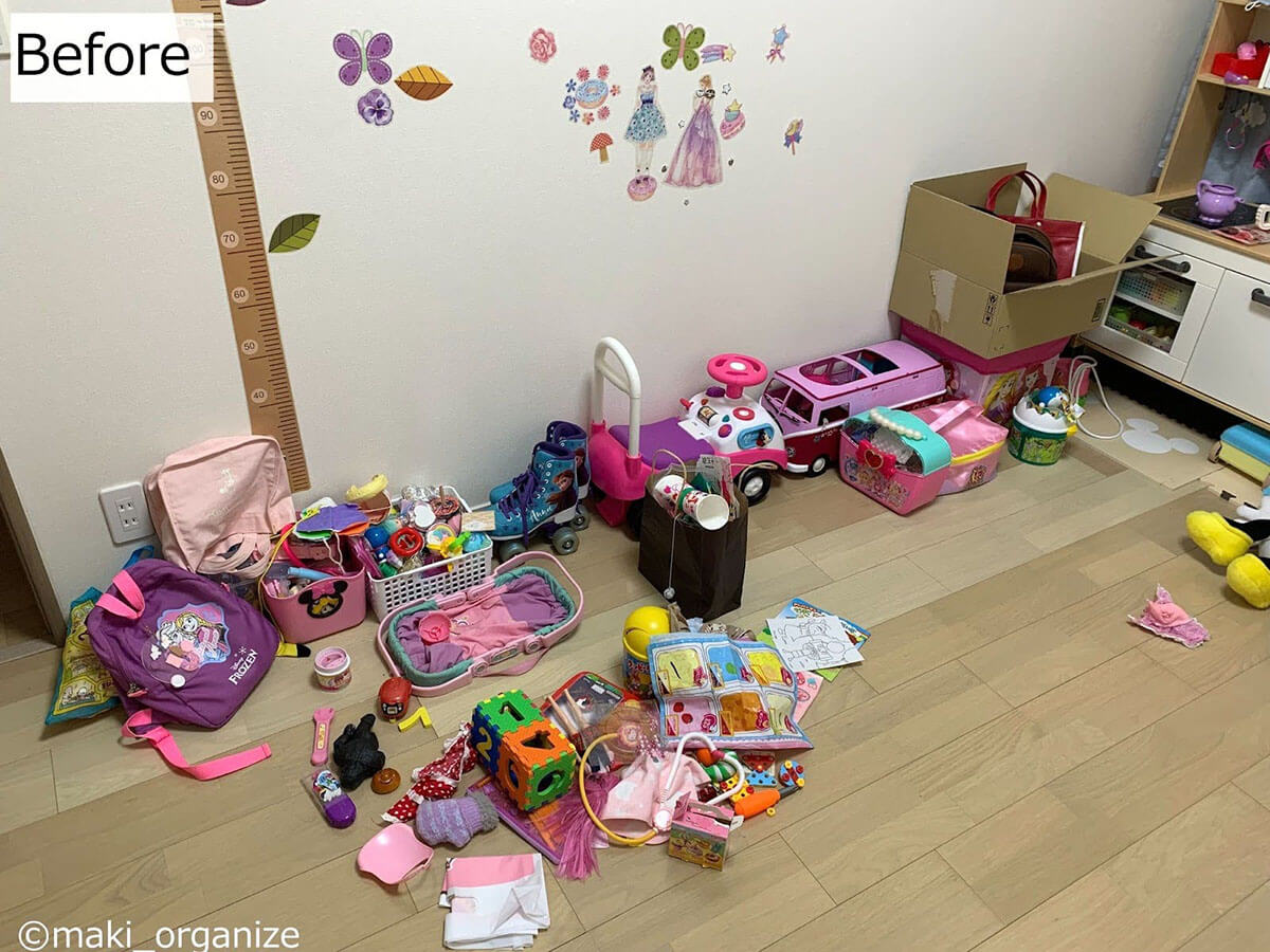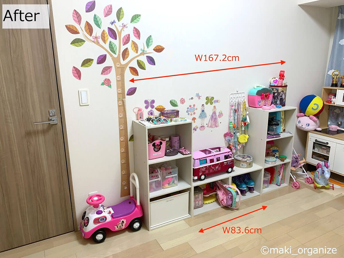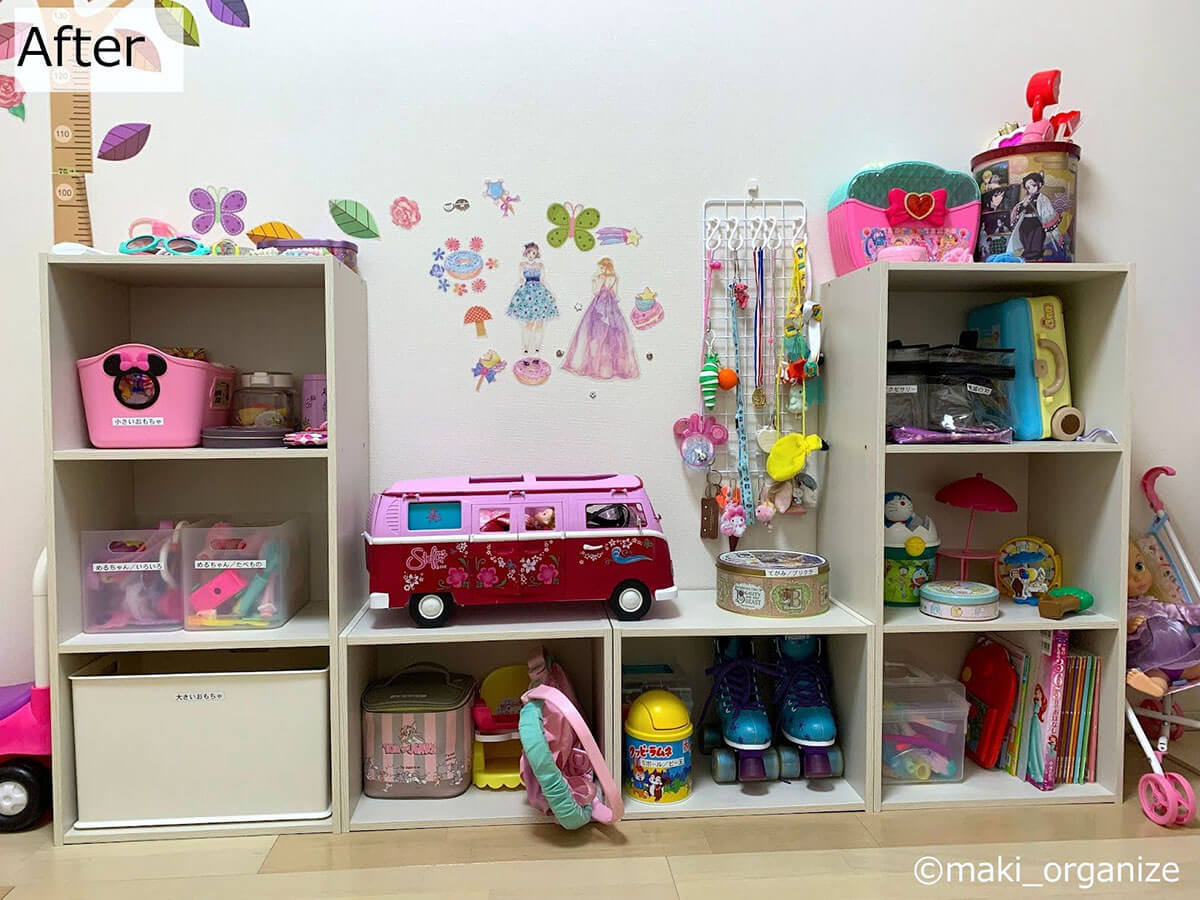 サイゾーウーマン暮らし住まい【コーナン】カラボでおもちゃ収納 暮らし [連載]女たちの「煩悩部屋」ビフォーアフター コーナン・ニトリのカラボが正解! 散らかったおもちゃがスッキリ、プロの収納実例 2024/04/24 17:00 伊藤まき(収納ライター) 「汚部屋」ビフォーアフター 整理収納アドバイザーの伊藤まきさんが、片付けに悩む読者の自宅を使いやすく生まれ変わらせる連載シリーズ【「煩悩部屋」ビフォーアフター】。 連載企画『ビフォーアフター』新シーズンです。第8回目の片付けモニターは、江東区・3LDKのマンションで暮らす4人家族のKさん(35歳)。今回は、汚部屋の片付けではなく、都心のマンションに多い「狭い収納」を使いやすく手直しする特別編です。 目次 ・【お悩み】おもちゃが「床置き」状態 ・【おもちゃ収納】Before ・【コーナン】「カラーボックス」3段&1段 ・【おもちゃ収納】After ・カラーボックスのメリット&おすすめ ・【解決】おもちゃ収納まとめ 【お悩み】おもちゃがほとんど「床置き」状態 壁側に寄せるように床置きされています(C)maki_organize 写真は小学生と幼児の姉妹が遊ぶ「おもちゃ部屋」。ぬいぐるみやドールハウス用の棚はありますが、それ以外はほとんど床置きという状態です。 【Before】大人でも、どこに片付けたらいいのか分からない しまう場所が決まっていないので散らかりがちに(C)maki_organize おもちゃが床置きされていた左側のスペースです。いずれはこちらに2段ベッドを置きたいのだそう。そこで今回は「レイアウト変更」がしやすい「カラーボックス」を使った収納実例を紹介。あわせてカラーボックスのメリットなどをくわしく解説していきます。 【コーナン】「カラーボックス3段」1,480円(税込) サイズ:(約)W41.8×D29×H88cm(C)maki_organize 【コーナン】「カラーボックス1段」1,078円(税込) サイズ:(約)W41.8×D29×H30.4cm(C)maki_organize 筆者が選んだのは、コーナンのカラーボックス。3段タイプと1段タイプをそれぞれ2つずつ用意しました。他メーカーのカラーボックスよりも、頑丈な点がおすすめポイントです。 【After】子どもが自分でおもちゃを片付けられるスペースに! 大型のおもちゃ(バス)もスッキリ片付いた!(C)maki_organize カラーボックスを4つ、計5,116円(税込)でおもちゃの収納棚が完成! モノの住所が明確になったので、子どもが自分で片付けできるようになりました。1段タイプは2つ並べることで、W83.6cmの平台に。ボックスに入りきらない大型おもちゃなどの置き場所として活用できます。 【カラーボックスのメリット】多種多様な使い方ができる! キャスターを装着すれば可動型の棚に(C)maki_organize カラーボックスの魅力は、なんといっても多種多様な使い方ができること! 本棚としてはもちろん、ウォークインクローゼット(WIC)内のバッグ収納にも◎。 さらに100均のキャスターを付けて可動型の棚にすれば、押し入れやキッチン周りなど狭い場所での収納に役立ちます。 【カラーボックスを選ぶなら】コーナンかニトリがおすすめ! 左:コーナン「スリムボックス6020」 右:ニトリ「カラーボックス3段」(C)maki_organize 他社のカラーボックスと比べ、コーナンとニトリは「連結できる」「棚板を増やせる」商品が多いので、目的に合わせてアレンジしやすい点が強みです。 今回おもちゃ収納に使用したコーナンのカラーボックスは、1段・2段・3段と種類がありますが、最大4段まで連結可能。写真左の「スリムボックス6020」1,628円(税込)も、同型であれば連結使用OKです。 ニトリ「カラーボックス3段」1,590円(税込)は棚板が増やせるタイプ。写真右では棚板を一枚追加。背景にリメイクシートを張り、脚を付けてアレンジしています。 【プロが解決】子どもの成長に合わせて自由にアレンジできるスペースに 女性ひとりでも、レイアウト変更が簡単!(C)maki_organize おもちゃ収納を「オシャレにしたい」と高額で重たい家具を選んだものの、落書きやシールで汚くなってしまったという事例をたくさん見てきました。加えて「重いので外に出すのが大変」など、売るのも捨てるのも面倒になってしまいがちです。 その点「カラーボックス」ならお手頃価格で軽く、扱いやすいです。子どもの成長に合わせて自由にアレンジできるところも魅力ですね。 レジ袋収納の裏技はコレ! プロがリピ買いする150円収納グッズとは?整理収納アドバイザーの伊藤まきさんが、片付けに悩む読者の自宅を使いやすく生まれ変わらせる連載シリーズ【「煩悩部屋」ビフォーアフター】。 連載企画『ビフォーアフター』新シ...サイゾーウーマン2024.04.17 コンロ横引き出し、調味料入れるのはNG? 家事がラクになる収納テク6整理収納アドバイザーの伊藤まきさんが、片付けに悩む読者の自宅を使いやすく生まれ変わらせる連載シリーズ【「煩悩部屋」ビフォーアフター】。 連載企画『ビフォーアフター』新シ...サイゾーウーマン2024.04.10 伊藤まき(収納ライター) 収納ライター・兼・整理収納アドバイザー1級。クリンネス