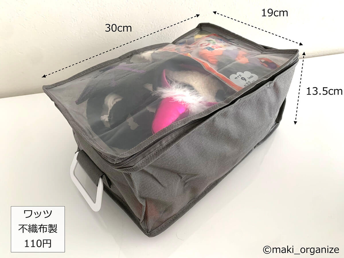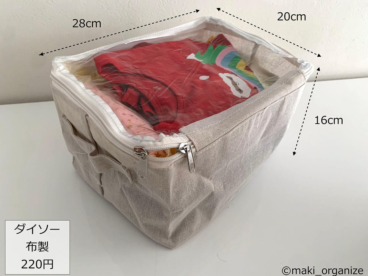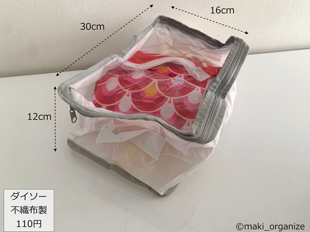サイゾーウーマン暮らし住まい【アクセ収納】ダイソーと無印を比較 暮らし [連載]女たちの「煩悩部屋」ビフォーアフター 【100均】「コミック保管袋」、こどもの日アイテム収納にベスト! プロの活用実例は? 2024/05/15 17:00 伊藤まき(収納ライター) 「汚部屋」ビフォーアフター 整理収納アドバイザー1級で収納ライターの伊藤まきさんが、家の中の “片付け”に関する悩みを“安く・簡単”に解決するコツを紹介します! 目次 ・【テーマ】イベント服&雑貨を収納 ・【100均 窓付き収納袋】ダイソー・セリア・ワッツ ・【イベント服&雑貨】収納実例&応用編 ・【ダイソー】布製ストレージボックス ・【セリア】窓付きコミックス収納袋 ・【ワッツ】コミック 収納袋(グレー) ・【ダイソー】文庫本 収納袋 【テーマ】100均「窓付き収納袋」でイベント服&雑貨を収納 (C)maki_organize 今回のテーマは「季節のイベント服&雑貨の収納」。5月の子どもの日、10月のハロウィン、12月のクリスマス、不定期のテーマパークといったように、日本の家は「イベント用の服と雑貨」であふれています。 1年に一度しか使わないものの、種類が多くなると管理するのも大変ですよね。そこでおすすめなのが、衣替えのタイミングで「中身が見える収納」に変えておくこと! 使い勝手がよくなり、管理も簡単になります。 収納アイテムとしておすすめなのは、100均の「窓付き収納袋」。今回はダイソー・セリア・ワッツで買える4品の特徴と使い方の実例をご紹介します。 【NG収納】中身が見えないから存在を「忘れる」 「ここにあったんだ」と驚く家も多い(C)maki_organize 写真は片付けで訪問するお宅でよく見る「NG収納」です。イベントで着た洋服や雑貨を、家にある袋にざっくりまとめている状態。「中身が見えない」ので、持っていることを忘れて二度買いしているパターンも多いように感じます。 こちらのNG収納を100均で買える「窓付き収納袋」を使って手直ししていきます。 【100均 窓付き収納袋】ダイソー・セリア・ワッツで4品を用意 100均「キャンドゥ」にも取り扱いがあります(C)maki_organize ダイソー、セリア、ワッツで「窓付き収納袋」を用意しました。おもにコミックや文庫本などを保管するための収納アイテムです。 【1】ダイソー「布製ストレージボックス(フタ付き)」220円(税込) 【2】セリア「窓付きコミックス収納袋 B6判用」110円(税込) 【3】ワッツ「コミック 収納袋(グレー)」110円(税込) 【4】ダイソー「文庫本 収納袋」110円(税込) 【100均 窓付き収納袋】ダイソー・セリア・ワッツ、サイズ感と素材は? (C)maki_organize 奥行きはすべて30cm前後。「靴箱」のようなサイズ感です。 ちなみに100均で購入できる収納袋のほとんどは「不織布製」ですが、【1】のダイソーは布製、【2】のセリアはビニール製。不織布よりも安定感があるのが特徴です。 【イベント服&雑貨 収納実例1】種類別にまとめて「見える収納」に 必要なときに、探さずに出し入れできます(C)maki_organize 子ども2人分のイベント服と雑貨を、種類別にまとめて収納しました。中身が見えれば、家族みんなが洋服の管理に参加できます。 【イベント服&雑貨 収納実例2】紙を1枚入れておく IKEAのスクッブボックス(W31×D34cm)にぴったり収まるサイズ(C)maki_organize コミックサイズ(30cm前後)の「窓付き収納袋」を選ぶ理由は、クローゼット上段用の収納ケースに入れやすいサイズだからです。 写真のように紙を1枚入れておくと、より中身が分かりやすくなって◎ 。普段使いの衣類と分けて、クローゼット内にスッキリ収納できます。 応用編【子どものお下がり服 収納実例】サイズ別にわかりやすく管理 マタニティグッズも、同様の保管方法がおすすめ(C)maki_organize 「窓付き収納袋」は、子どもの「お下がり服の管理」にも◎。サイズ別でわかりやすく管理できます。使用イメージを動画にしていますので、参考にしてみてください。洋服の種類が多いほど、目的・サイズ・時期で仕分けると良いですね。 今回は、「コミックサイズ」を紹介しましたが、量が多くてかさばるなら「ジッパー付き保存袋」もおすすめです。 ダイソーとセリアから登場! 収納のプロたちが歓喜「フタ付クリアボックス」詳細紹介【サイズ・色・使用実例】整理収納アドバイザーの伊藤まきが、片付けに訪問した現場で「よくやる作業」「よく伝えるおすすめ収納法」を【プロの技】シリーズとして紹介していきます! ダイソーとセリア「クリ...サイゾーウーマン2022.03.28 最後に、今回使用した「窓付き収納袋」の特徴をそれぞれご紹介します。 【1】ダイソー「布製ストレージボックス(フタ付き)」220円(税込) JANコード:4550480229829(C)maki_organize 布製で取っ手が2箇所に付いています。ジッパーも金具なので、長く保管したいモノを保管するのにおすすめです。 【2】セリア「窓付きコミックス収納袋 B6判用」110円(税込) (C)maki_organize ビニール製なので、不織布よりも安定感があります。セリアは「窓付き収納袋」の種類が豊富