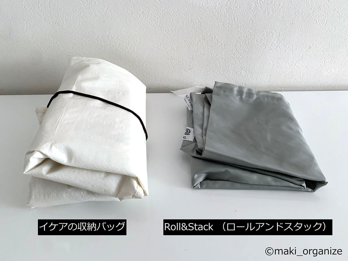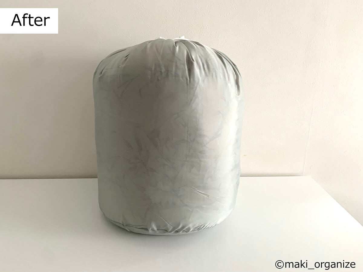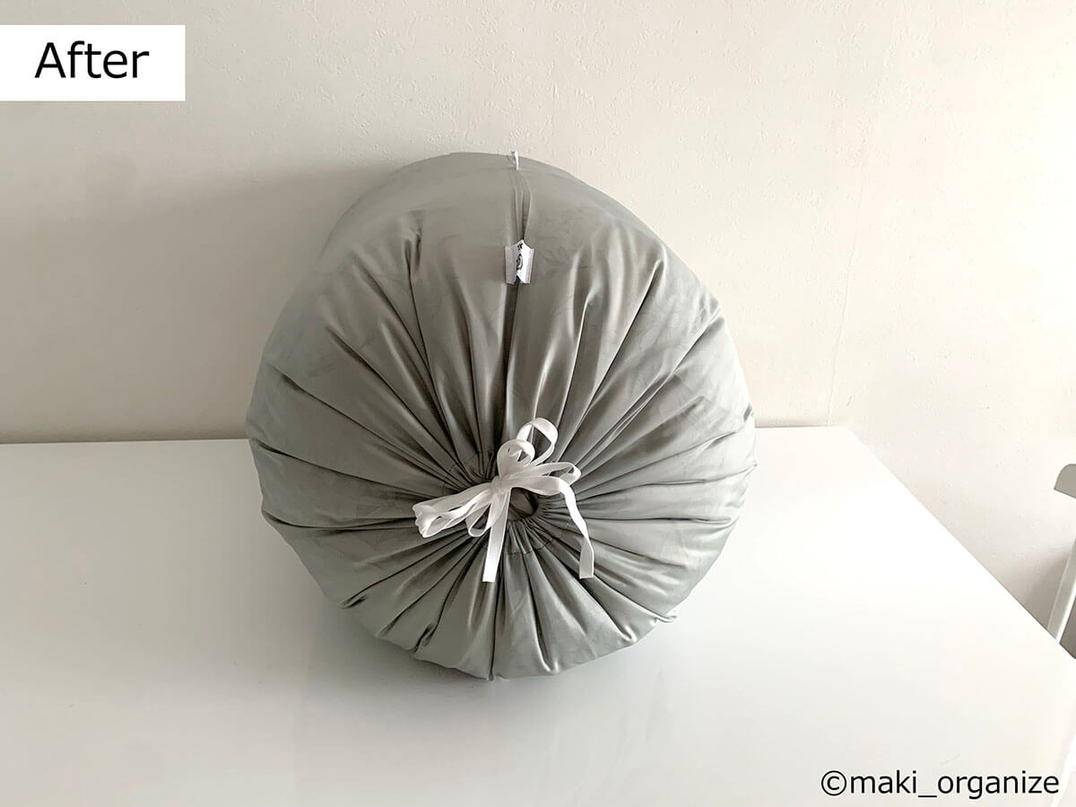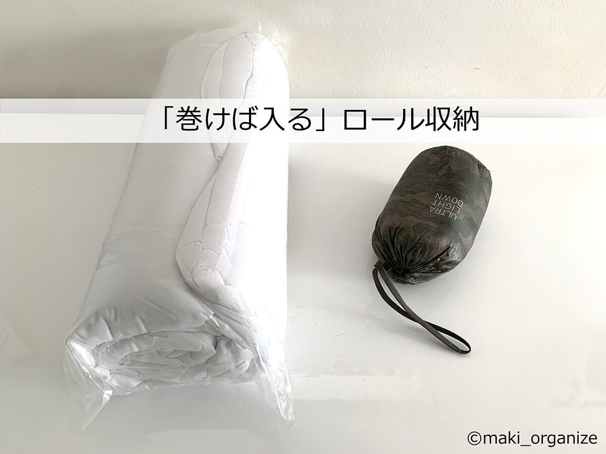 サイゾーウーマン暮らし住まい人気の韓国アイテムで布団ロール収納 暮らし [連載]女たちの「煩悩部屋」ビフォーアフター 狭いクローゼットでもスッキリ! 「布団収納」プロが使うアイテム&収納実例 2024/05/22 17:00 伊藤まき(収納ライター) 「汚部屋」ビフォーアフター 整理収納アドバイザー1級で収納ライターの伊藤まきさんが、家の中の “片付け”に関する悩みを“安く・簡単”に解決するコツを紹介します! 目次 ・【テーマ】布団をロール収納 ・【ロールアンドスタック】巾着型収納袋 ・【毛布収納実例】Before&After ・【羽毛布団収納実例】Before&After ・【まとめ】大型品は巻いて収納が正解 【テーマ】韓国発の人気アイテムでかさばる布団をロール収納 売っている商品も「ロール型」が今どき!(C)maki_organize 今回のテーマは「布団のロール収納」。巻いて小さくすることで、従来のファスナー付きケースを使うよりもコンパクトになるのはもちろん、「出し入れ」も簡単に! クローゼット上段などの狭いスペースにも入るので、収納力が足りない家にもおすすめです。 次からは韓国発「ロールアンドスタック」の収納袋と使い方の実例をご紹介していきます。 【ロールアンドスタック巾着型収納袋】布団のロール収納がおしゃれに! XLサイズ(2枚入り)W43×H45cmの円筒型(C)maki_organize 布団のロール収納に最適な「ロールアンドスタック」の巾着型収納袋です。写真のサイズはXL(65L)。2枚入りで2,890円(税込/amazon価格)で購入することができます。 通気性が良く、摩擦の少ないポリエステル素材が特徴。写真のグレーを含め、8色から選べる点も魅力的です。 【ロールアンドスタック巾着型収納袋】サイズはS~XLの4種類! 積み上げても、出しやすく崩れにくい◎(C)maki_organize XLサイズのほかにも、S(1,580円)、M(1,890円)、L(2,450円)と4種類のサイズが揃います。 次からは「ファスナー付き布団収納ケース」と比較して収納実例を紹介していきますので、「毛布や布団が収納空間を奪っている」「収納力を増やしたい!」という方は、ぜひ参考にしてみてください。 【Before】モコモコの生地でかさばる毛布 毛布のサイズ:167×233cm(C)maki_organize コストコで買ったPENDLETON(ペンドルトン)のブランケット。ビッグサイズでモコモコしているので、かさばってスペースをとってしまいます。こういった生地のパジャマやソックスをたくさん持っているお宅も多いですね。 【After】四角いのでかさばる「ファスナー付き布団収納ケース」 IKEAのサイズ(W62×D53×19cm)(C)maki_organize イケア「BRUKSVARA(ブルクスヴァーラ)」499円(税込)の「ファスナー付き布団収納ケース」に入れた場合です。スペースに余裕がありますが、四角いのでかさばります。 【After】「ロールアンドスタック巾着型収納袋」がベスト! XLサイズ(W43×H45cm)(C)maki_organize 「ロールアンドスタック」の巾着型収納袋XLサイズに収納した場合です。毛布をたたんで巻いて、入れてから紐で絞るだけ! 生地がやわらかいので、収納空間に合わせて変形自在なのもメリットです。 【比較】使わない時もかさばらない「ロールアンドスタック巾着型収納袋」 ビニール素材は使い込むほどかさばりがち(C)maki_organize 「ファスナー付き布団収納ケース(ビニール)」と「ロールアンドスタック巾着型収納袋(ポリエステル)」を空っぽの状態で比較してみました。 ポリエステル素材を使用している、ロールアンドスタックのほうがスッキリしているとわかりますね。使わないときもかさばらずに保管できます。 次からは、クローゼット上段の小さなスペースを例に比較していきます。 【Before】「ファスナー付き布団収納ケース」に入った羽毛布団 収納ケースとしては、優秀デザインですが……(C)maki_organize ダブルサイズの羽毛布団が入った「ファスナー付き布団収納ケース」です。ほとんどの家が、購入店の「付属品ケース」を使っています。メーカー側のふんわり収納して欲しい気持ちが、小さな家には大きすぎます。 都心は押し入れがない家のほうが多い(C)maki_organize こちらをクローゼット上段の狭い空間(W26×D40×H60cm)に収納したいのですが、付属品の「ファスナー付き布団収納ケース」を入れようとしても、クローゼットの角に当たって入りませんでした。四隅に芯が入っており、かたくて頑丈なので上に持ち上げるのも大変です。 女性ひとりの力では「上げ下げ」もしんどい(C)maki_organize 【チャレンジ】イケアの「ファスナー付き布団収納ケース」ははみ出る! ビニール製は埃の吸着が目立ちやすい欠点あり(C)maki_organize 次にイケア「BRUKSVARA(ブルクスヴァーラ)」の「ファスナー付き布団収納ケース」も試してみました。クローゼット上段に入れることはできましたが、はみ出していて不安定です。 【After】「ロールアンドスタック巾着型収納袋」でスッキリ収まった! アウトドアシーンにも持ち運び可能!(C)maki_organize 「ファスナー付き布団収納ケース」から、ダブルサイズの羽毛布団を取り出し、「ロールアンドスタック巾着型収納