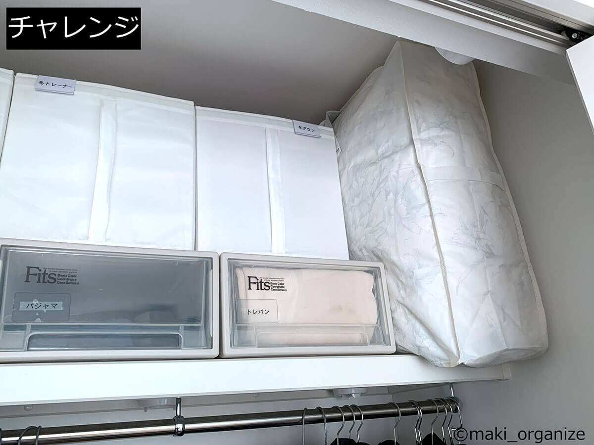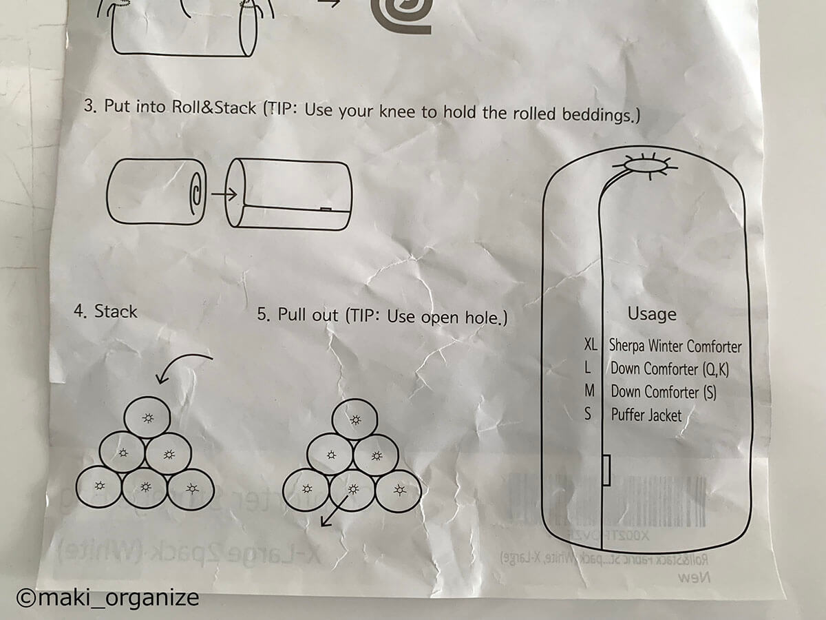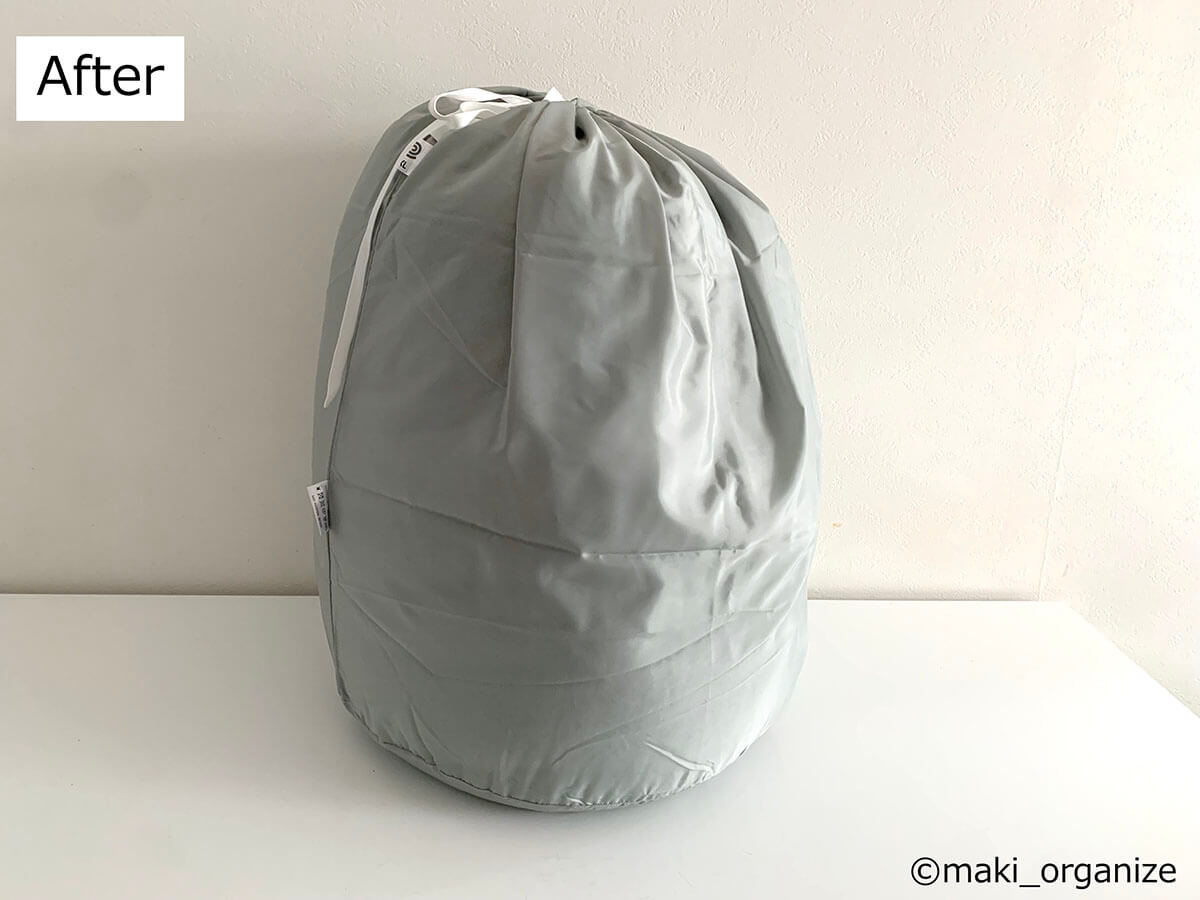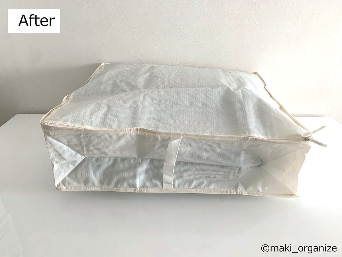 サイゾーウーマン暮らし住まい人気の韓国アイテムで布団ロール収納 暮らし [連載]女たちの「煩悩部屋」ビフォーアフター 狭いクローゼットでもスッキリ! 「布団収納」プロが使うアイテム&収納実例 2024/05/22 17:00 伊藤まき(収納ライター) 「汚部屋」ビフォーアフター 整理収納アドバイザー1級で収納ライターの伊藤まきさんが、家の中の “片付け”に関する悩みを“安く・簡単”に解決するコツを紹介します! 目次 ・【テーマ】布団をロール収納 ・【ロールアンドスタック】巾着型収納袋 ・【毛布収納実例】Before&After ・【羽毛布団収納実例】Before&After ・【まとめ】大型品は巻いて収納が正解 【テーマ】韓国発の人気アイテムでかさばる布団をロール収納 売っている商品も「ロール型」が今どき!(C)maki_organize 今回のテーマは「布団のロール収納」。巻いて小さくすることで、従来のファスナー付きケースを使うよりもコンパクトになるのはもちろん、「出し入れ」も簡単に! クローゼット上段などの狭いスペースにも入るので、収納力が足りない家にもおすすめです。 次からは韓国発「ロールアンドスタック」の収納袋と使い方の実例をご紹介していきます。 【ロールアンドスタック巾着型収納袋】布団のロール収納がおしゃれに! XLサイズ(2枚入り)W43×H45cmの円筒型(C)maki_organize 布団のロール収納に最適な「ロールアンドスタック」の巾着型収納袋です。写真のサイズはXL(65L)。2枚入りで2,890円(税込/amazon価格)で購入することができます。 通気性が良く、摩擦の少ないポリエステル素材が特徴。写真のグレーを含め、8色から選べる点も魅力的です。 【ロールアンドスタック巾着型収納袋】サイズはS~XLの4種類! 積み上げても、出しやすく崩れにくい◎(C)maki_organize XLサイズのほかにも、S(1,580円)、M(1,890円)、L(2,450円)と4種類のサイズが揃います。 次からは「ファスナー付き布団収納ケース」と比較して収納実例を紹介していきますので、「毛布や布団が収納空間を奪っている」「収納力を増やしたい!」という方は、ぜひ参考にしてみてください。 【Before】モコモコの生地でかさばる毛布 毛布のサイズ:167×233cm(C)maki_organize コストコで買ったPENDLETON(ペンドルトン)のブランケット。ビッグサイズでモコモコしているので、かさばってスペースをとってしまいます。こういった生地のパジャマやソックスをたくさん持っているお宅も多いですね。 【After】四角いのでかさばる「ファスナー付き布団収納ケース」 IKEAのサイズ(W62×D53×19cm)(C)maki_organize イケア「BRUKSVARA(ブルクスヴァーラ)」499円(税込)の「ファスナー付き布団収納ケース」に入れた場合です。スペースに余裕がありますが、四角いのでかさばります。 【After】「ロールアンドスタック巾着型収納袋」がベスト! XLサイズ(W43×H45cm)(C)maki_organize 「ロールアンドスタック」の巾着型収納袋XLサイズに収納した場合です。毛布をたたんで巻いて、入れてから紐で絞るだけ! 生地がやわらかいので、収納空間に合わせて変形自在なのもメリットです。 【比較】使わない時もかさばらない「ロールアンドスタック巾着型収納袋」 ビニール素材は使い込むほどかさばりがち(C)maki_organize 「ファスナー付き布団収納ケース(ビニール)」と「ロールアンドスタック巾着型収納袋(ポリエステル)」を空っぽの状態で比較してみました。 ポリエステル素材を使用している、ロールアンドスタックのほうがスッキリしているとわかりますね。使わないときもかさばらずに保管できます。 次からは、クローゼット上段の小さなスペースを例に比較していきます。 【Before】「ファスナー付き布団収納ケース」に入った羽毛布団 収納ケースとしては、優秀デザインですが……(C)maki_organize ダブルサイズの羽毛布団が入った「ファスナー付き布団収納ケース」です。ほとんどの家が、購入店の「付属品ケース」を使っています。メーカー側のふんわり収納して欲しい気持ちが、小さな家には大きすぎます。 都心は押し入れがない家のほうが多い(C)maki_organize こちらをクローゼット上段の狭い空間(W26×D40×H60cm)に収納したいのですが、付属品の「ファスナー付き布団収納ケース」を入れようとしても、クローゼットの角に当たって入りませんでした。四隅に芯が入っており、かたくて頑丈なので上に持ち上げるのも大変です。 女性ひとりの力では「上げ下げ」もしんどい(C)maki_organize 【チャレンジ】イケアの「ファスナー付き布団収納ケース」ははみ出る! ビニール製は埃の吸着が目立ちやすい欠点あり(C)maki_organize 次にイケア「BRUKSVARA(ブルクスヴァーラ)」の「ファスナー付き布団収納ケース」も試してみました。クローゼット上段に入れることはできましたが、はみ出していて不安定です。 【After】「ロールアンドスタック巾着型収納袋」でスッキリ収まった! アウトドアシーンにも持ち運び可能!(C)maki_organize 「ファスナー付き布団収納ケース」から、ダブルサイズの羽毛布団を取り出し、「ロールアンドスタック巾着型収納