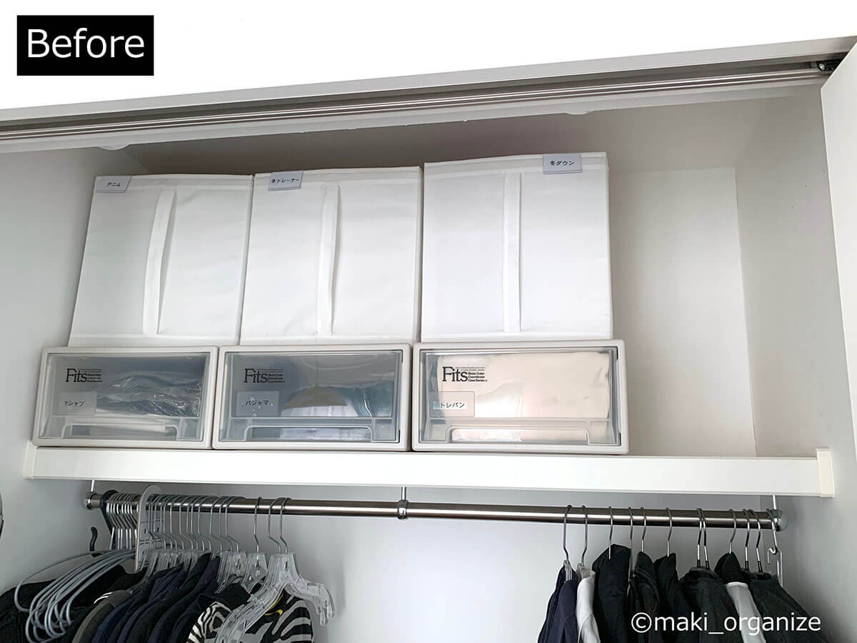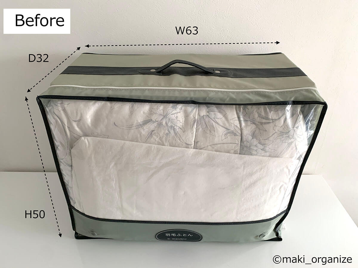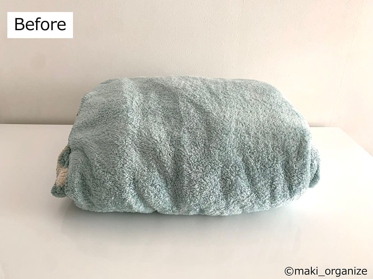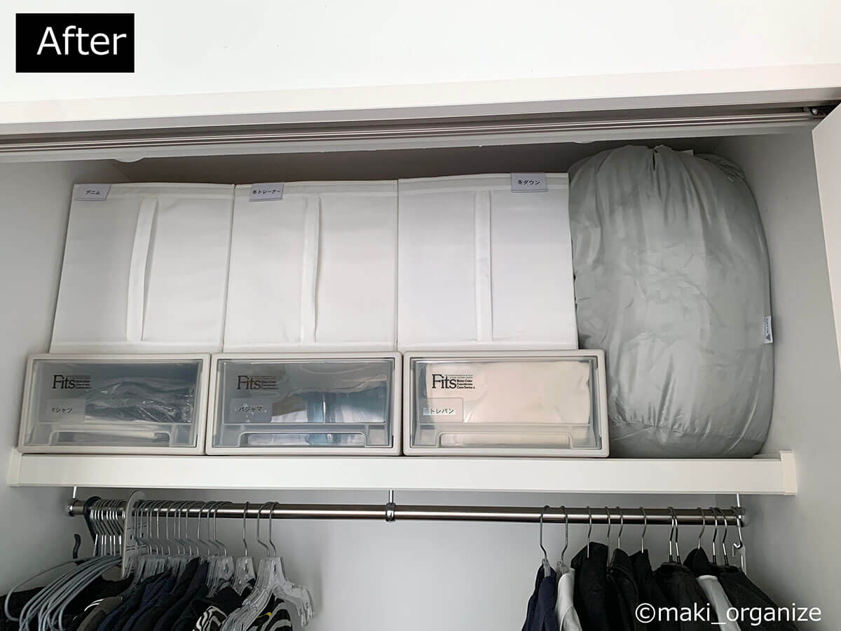 サイゾーウーマン暮らし住まい人気の韓国アイテムで布団ロール収納 暮らし [連載]女たちの「煩悩部屋」ビフォーアフター 狭いクローゼットでもスッキリ! 「布団収納」プロが使うアイテム&収納実例 2024/05/22 17:00 伊藤まき(収納ライター) 「汚部屋」ビフォーアフター 整理収納アドバイザー1級で収納ライターの伊藤まきさんが、家の中の “片付け”に関する悩みを“安く・簡単”に解決するコツを紹介します! 目次 ・【テーマ】布団をロール収納 ・【ロールアンドスタック】巾着型収納袋 ・【毛布収納実例】Before&After ・【羽毛布団収納実例】Before&After ・【まとめ】大型品は巻いて収納が正解 【テーマ】韓国発の人気アイテムでかさばる布団をロール収納 売っている商品も「ロール型」が今どき!(C)maki_organize 今回のテーマは「布団のロール収納」。巻いて小さくすることで、従来のファスナー付きケースを使うよりもコンパクトになるのはもちろん、「出し入れ」も簡単に! クローゼット上段などの狭いスペースにも入るので、収納力が足りない家にもおすすめです。 次からは韓国発「ロールアンドスタック」の収納袋と使い方の実例をご紹介していきます。 【ロールアンドスタック巾着型収納袋】布団のロール収納がおしゃれに! XLサイズ(2枚入り)W43×H45cmの円筒型(C)maki_organize 布団のロール収納に最適な「ロールアンドスタック」の巾着型収納袋です。写真のサイズはXL(65L)。2枚入りで2,890円(税込/amazon価格)で購入することができます。 通気性が良く、摩擦の少ないポリエステル素材が特徴。写真のグレーを含め、8色から選べる点も魅力的です。 【ロールアンドスタック巾着型収納袋】サイズはS~XLの4種類! 積み上げても、出しやすく崩れにくい◎(C)maki_organize XLサイズのほかにも、S(1,580円)、M(1,890円)、L(2,450円)と4種類のサイズが揃います。 次からは「ファスナー付き布団収納ケース」と比較して収納実例を紹介していきますので、「毛布や布団が収納空間を奪っている」「収納力を増やしたい!」という方は、ぜひ参考にしてみてください。 【Before】モコモコの生地でかさばる毛布 毛布のサイズ:167×233cm(C)maki_organize コストコで買ったPENDLETON(ペンドルトン)のブランケット。ビッグサイズでモコモコしているので、かさばってスペースをとってしまいます。こういった生地のパジャマやソックスをたくさん持っているお宅も多いですね。 【After】四角いのでかさばる「ファスナー付き布団収納ケース」 IKEAのサイズ(W62×D53×19cm)(C)maki_organize イケア「BRUKSVARA(ブルクスヴァーラ)」499円(税込)の「ファスナー付き布団収納ケース」に入れた場合です。スペースに余裕がありますが、四角いのでかさばります。 【After】「ロールアンドスタック巾着型収納袋」がベスト! XLサイズ(W43×H45cm)(C)maki_organize 「ロールアンドスタック」の巾着型収納袋XLサイズに収納した場合です。毛布をたたんで巻いて、入れてから紐で絞るだけ! 生地がやわらかいので、収納空間に合わせて変形自在なのもメリットです。 【比較】使わない時もかさばらない「ロールアンドスタック巾着型収納袋」 ビニール素材は使い込むほどかさばりがち(C)maki_organize 「ファスナー付き布団収納ケース(ビニール)」と「ロールアンドスタック巾着型収納袋(ポリエステル)」を空っぽの状態で比較してみました。 ポリエステル素材を使用している、ロールアンドスタックのほうがスッキリしているとわかりますね。使わないときもかさばらずに保管できます。 次からは、クローゼット上段の小さなスペースを例に比較していきます。 【Before】「ファスナー付き布団収納ケース」に入った羽毛布団 収納ケースとしては、優秀デザインですが……(C)maki_organize ダブルサイズの羽毛布団が入った「ファスナー付き布団収納ケース」です。ほとんどの家が、購入店の「付属品ケース」を使っています。メーカー側のふんわり収納して欲しい気持ちが、小さな家には大きすぎます。 都心は押し入れがない家のほうが多い(C)maki_organize こちらをクローゼット上段の狭い空間(W26×D40×H60cm)に収納したいのですが、付属品の「ファスナー付き布団収納ケース」を入れようとしても、クローゼットの角に当たって入りませんでした。四隅に芯が入っており、かたくて頑丈なので上に持ち上げるのも大変です。 女性ひとりの力では「上げ下げ」もしんどい(C)maki_organize 【チャレンジ】イケアの「ファスナー付き布団収納ケース」ははみ出る! ビニール製は埃の吸着が目立ちやすい欠点あり(C)maki_organize 次にイケア「BRUKSVARA(ブルクスヴァーラ)」の「ファスナー付き布団収納ケース」も試してみました。クローゼット上段に入れることはできましたが、はみ出していて不安定です。 【After】「ロールアンドスタック巾着型収納袋」でスッキリ収まった! アウトドアシーンにも持ち運び可能!(C)maki_organize 「ファスナー付き布団収納ケース」から、ダブルサイズの羽毛布団を取り出し、「ロールアンドスタック巾着型収納